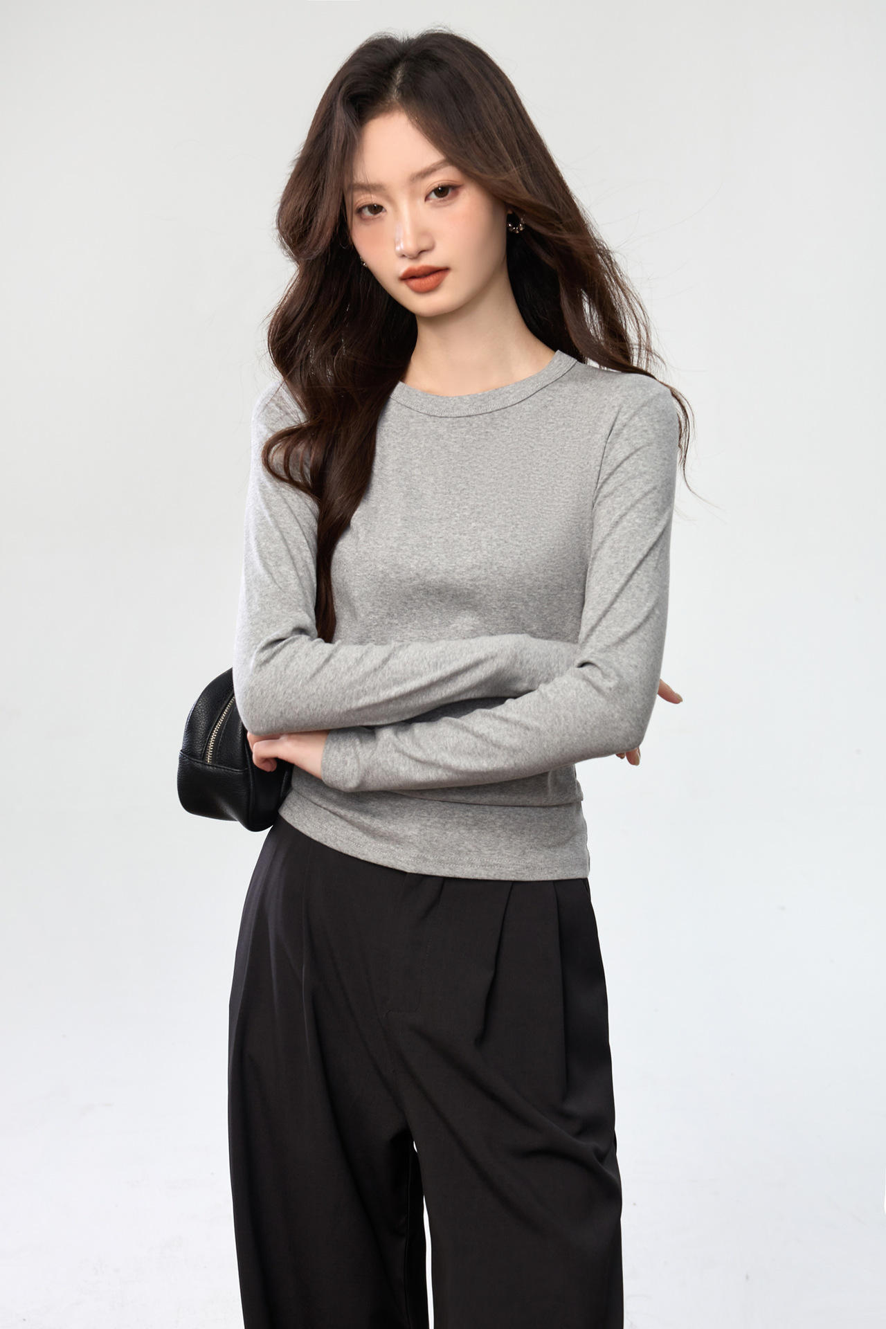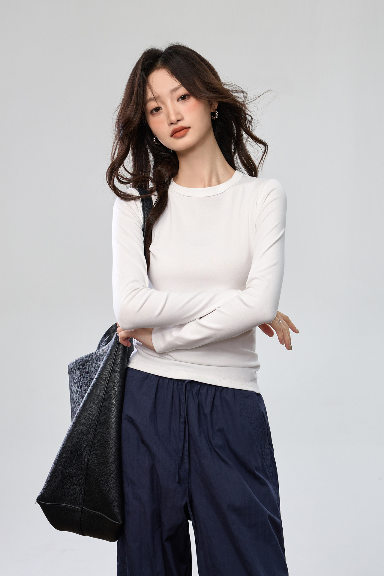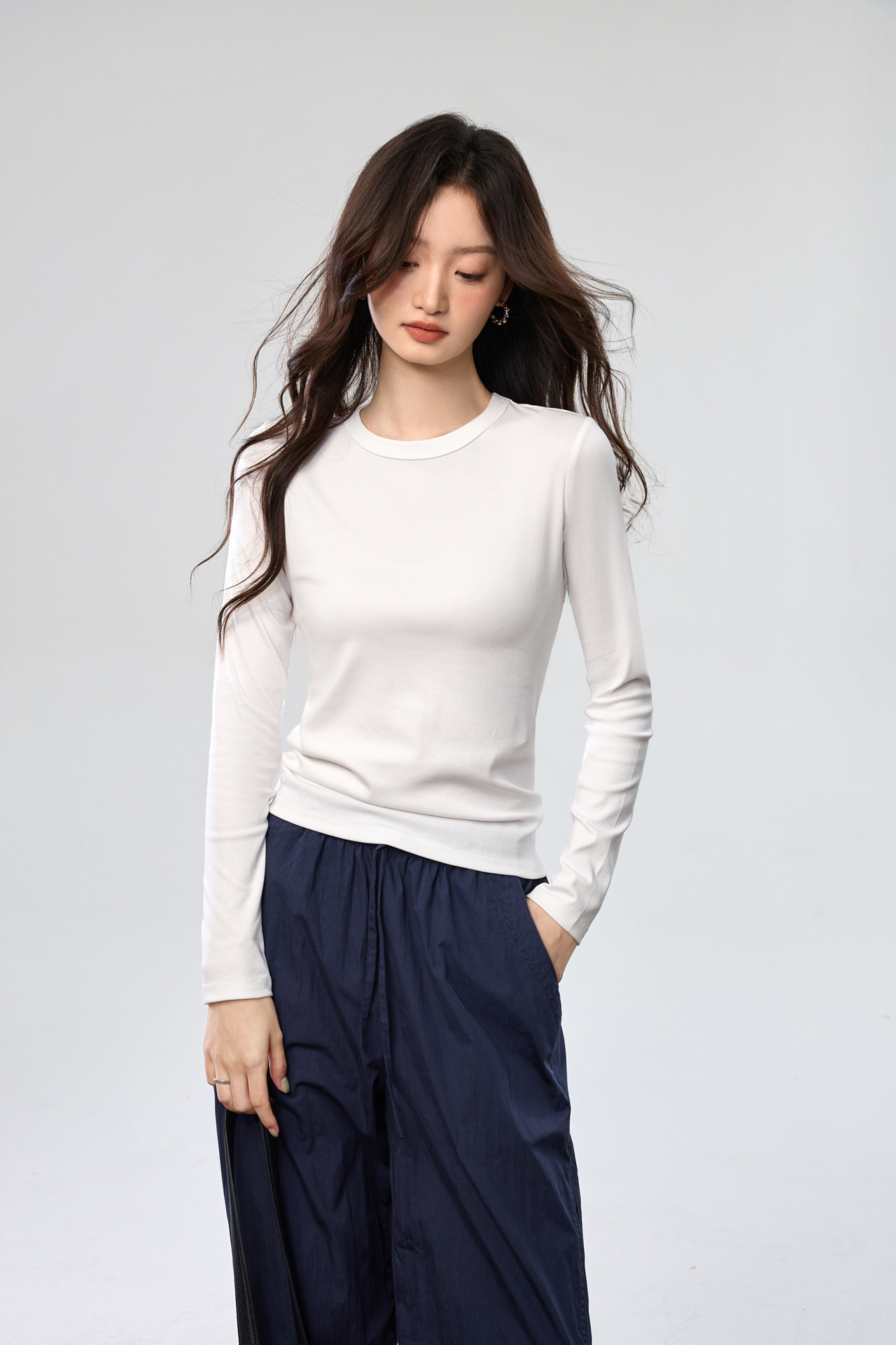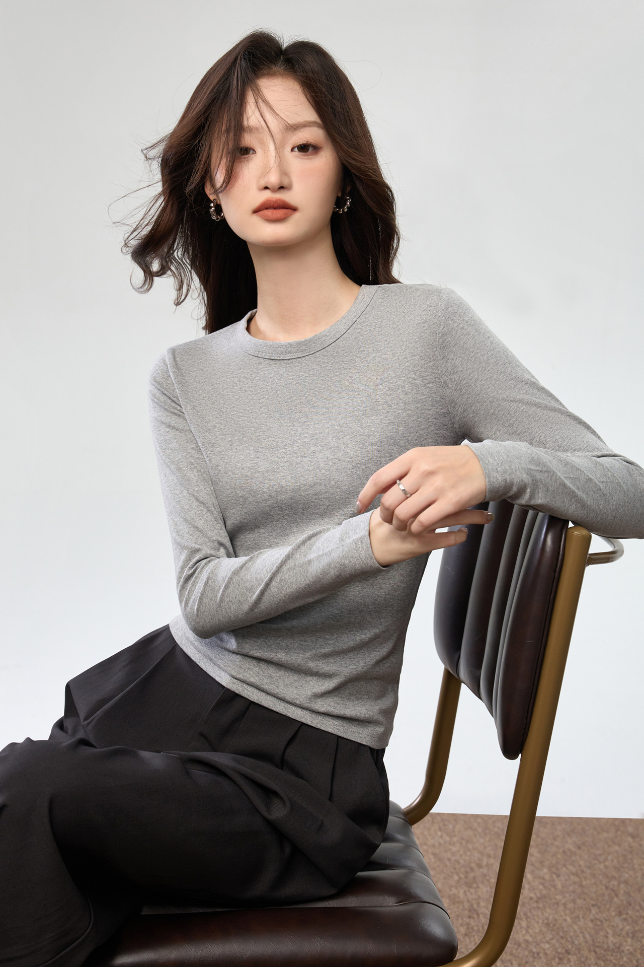 Combed pure cotton, bright line design versatile 2026 autumn new long-sleeved T-shirt women's simple crew neck bottoming shirt top