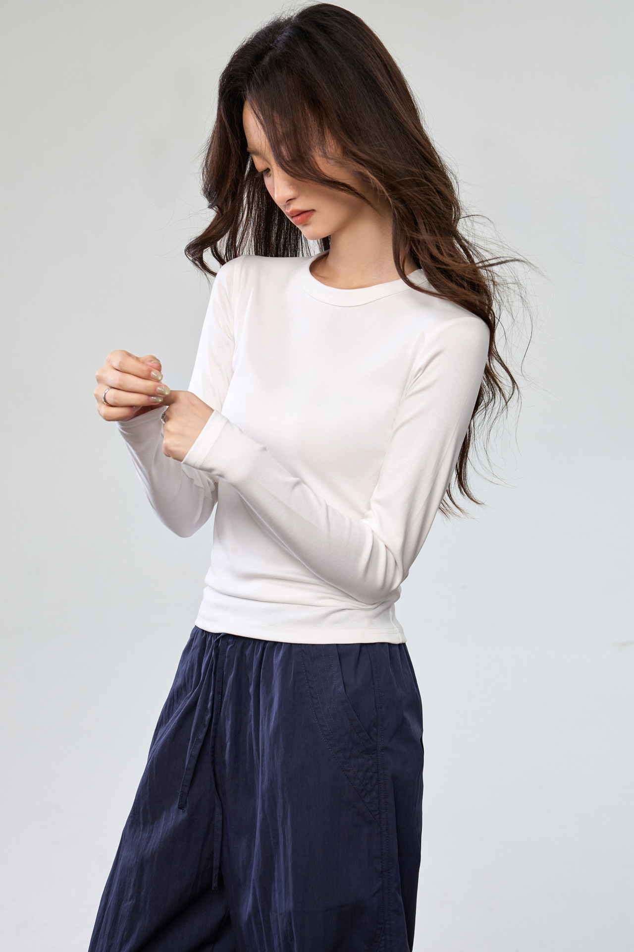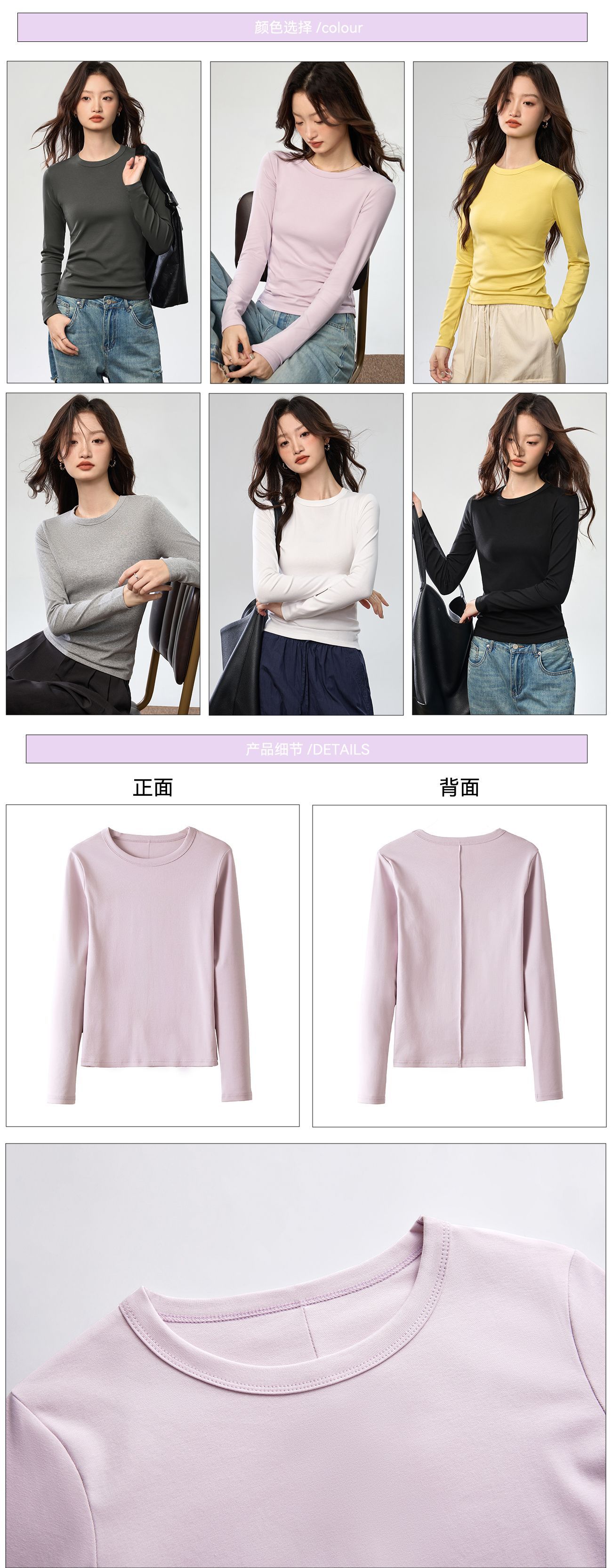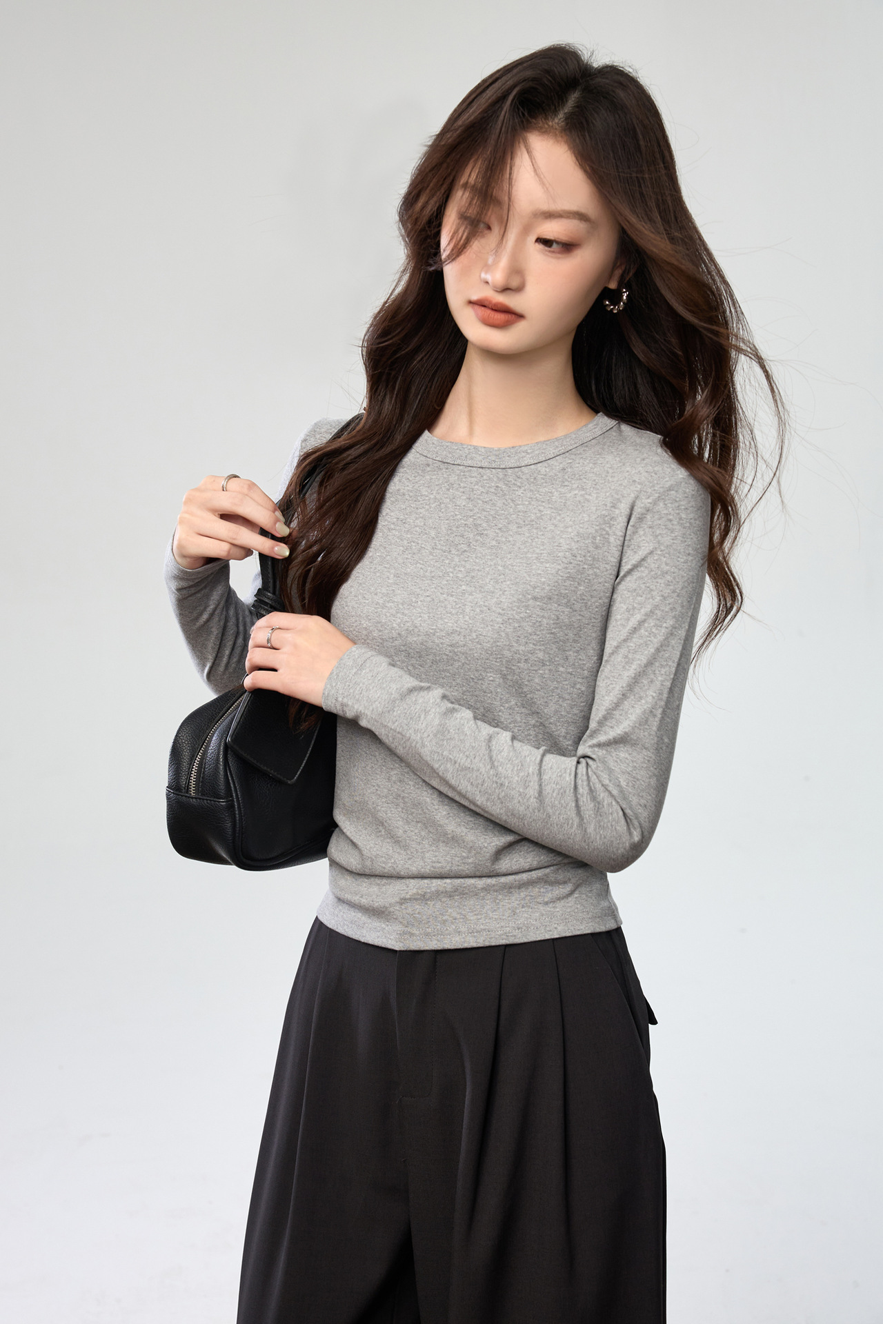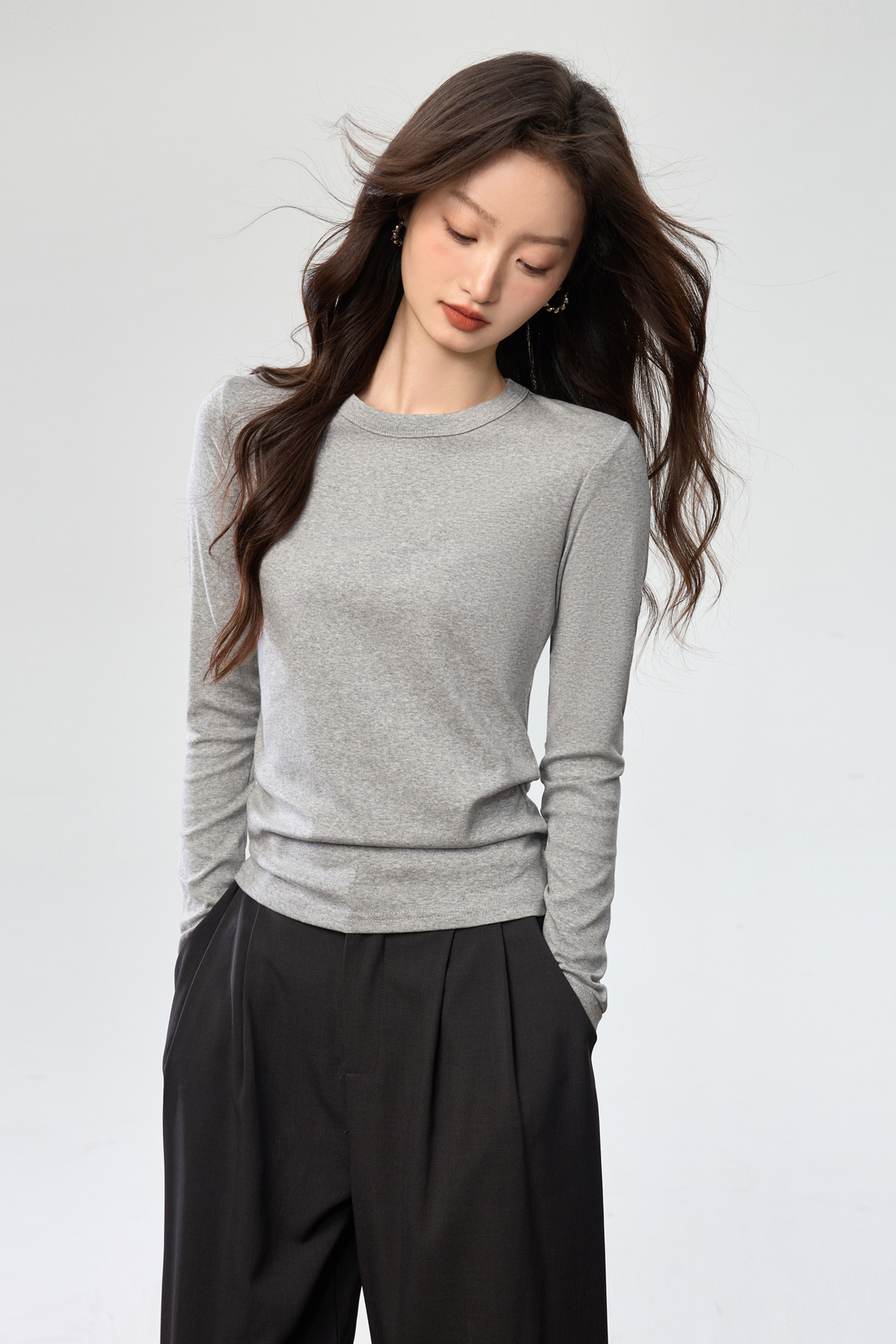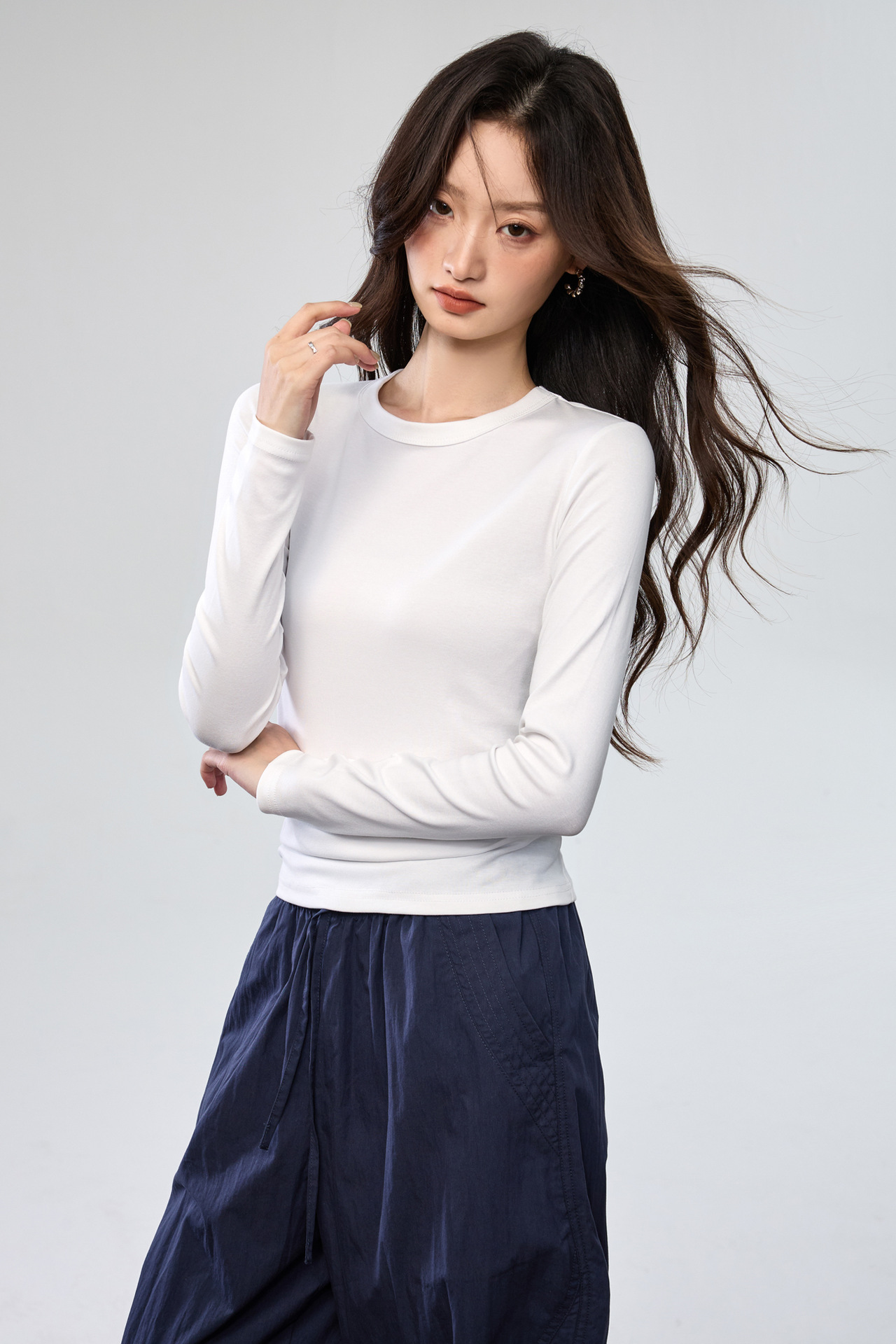 Combed pure cotton, bright line design versatile 2026 autumn new long-sleeved T-shirt women's simple crew neck bottoming shirt top