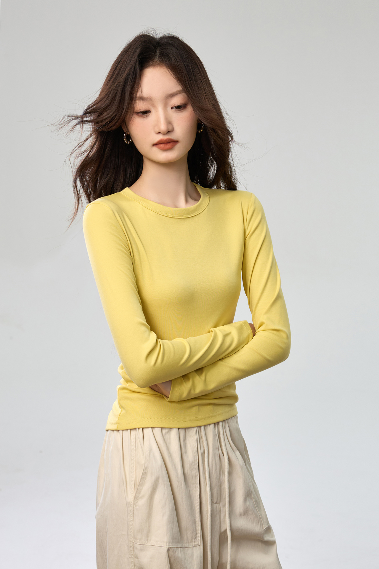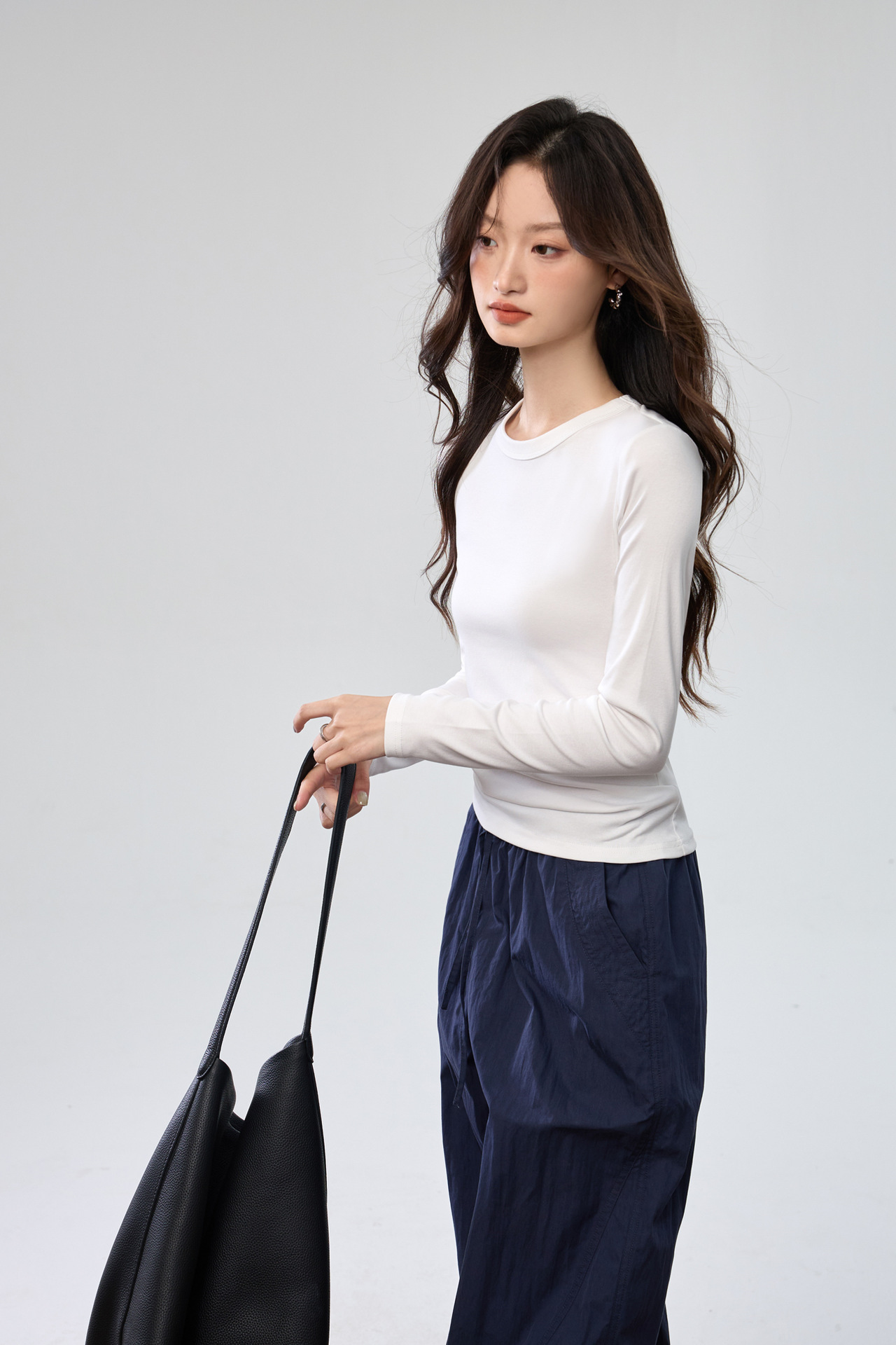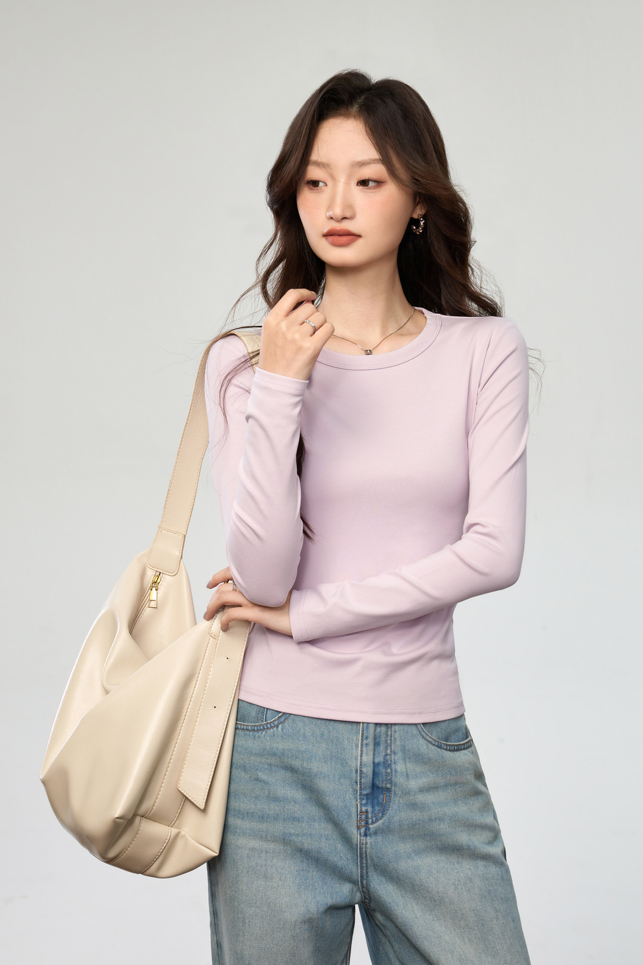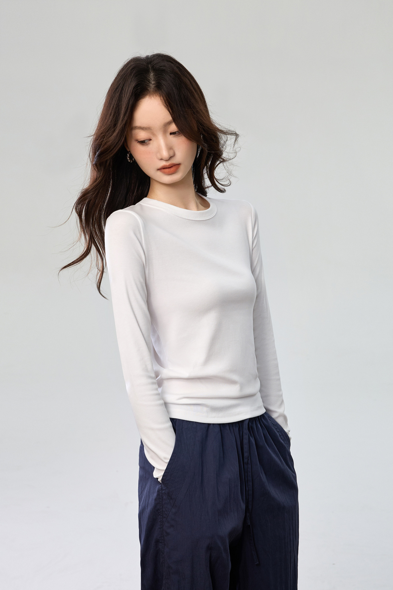 Combed pure cotton, bright line design versatile 2026 autumn new long-sleeved T-shirt women's simple crew neck bottoming shirt top