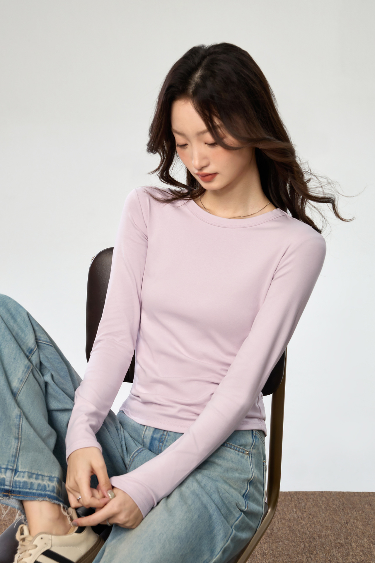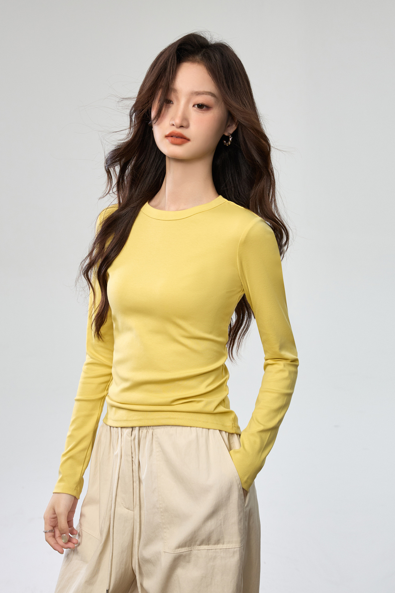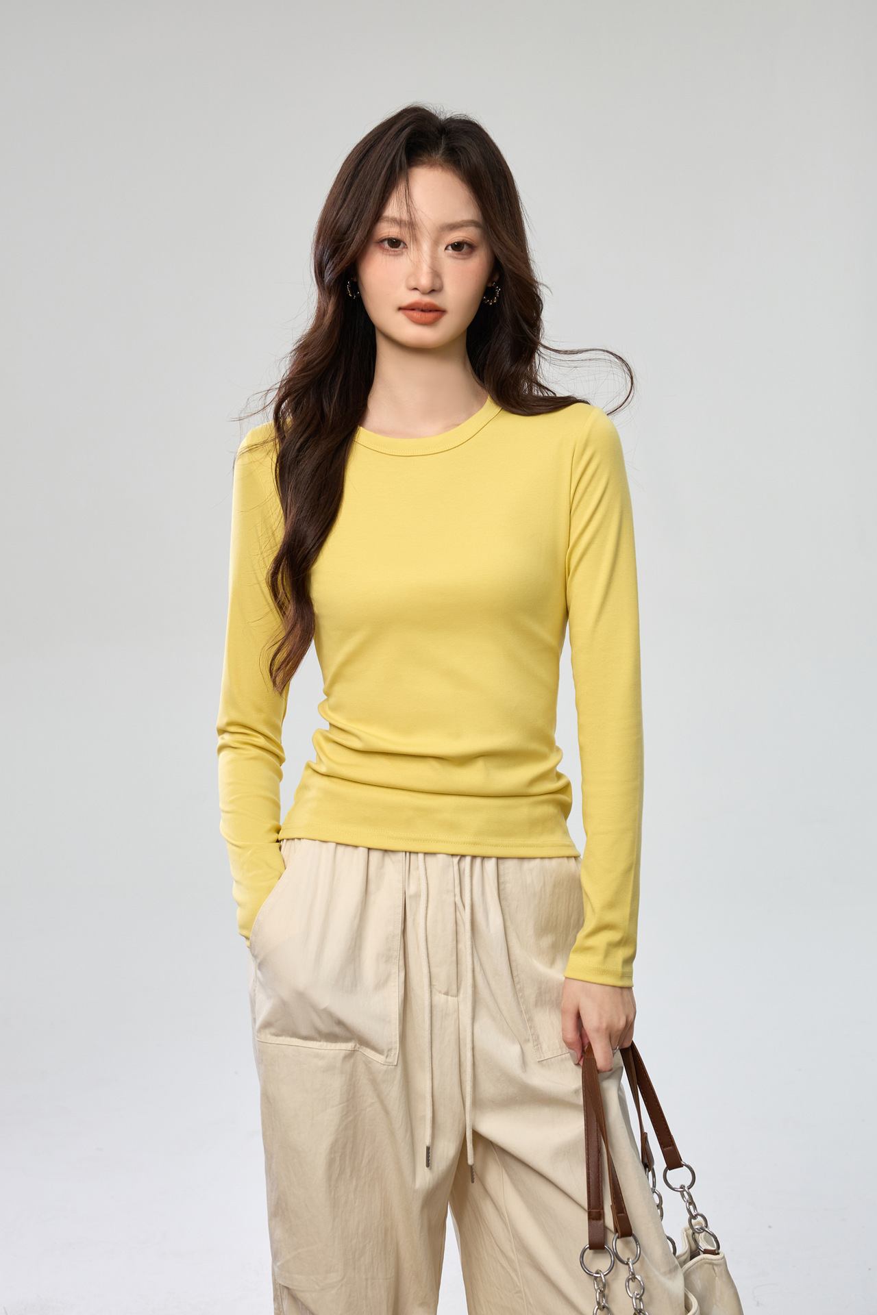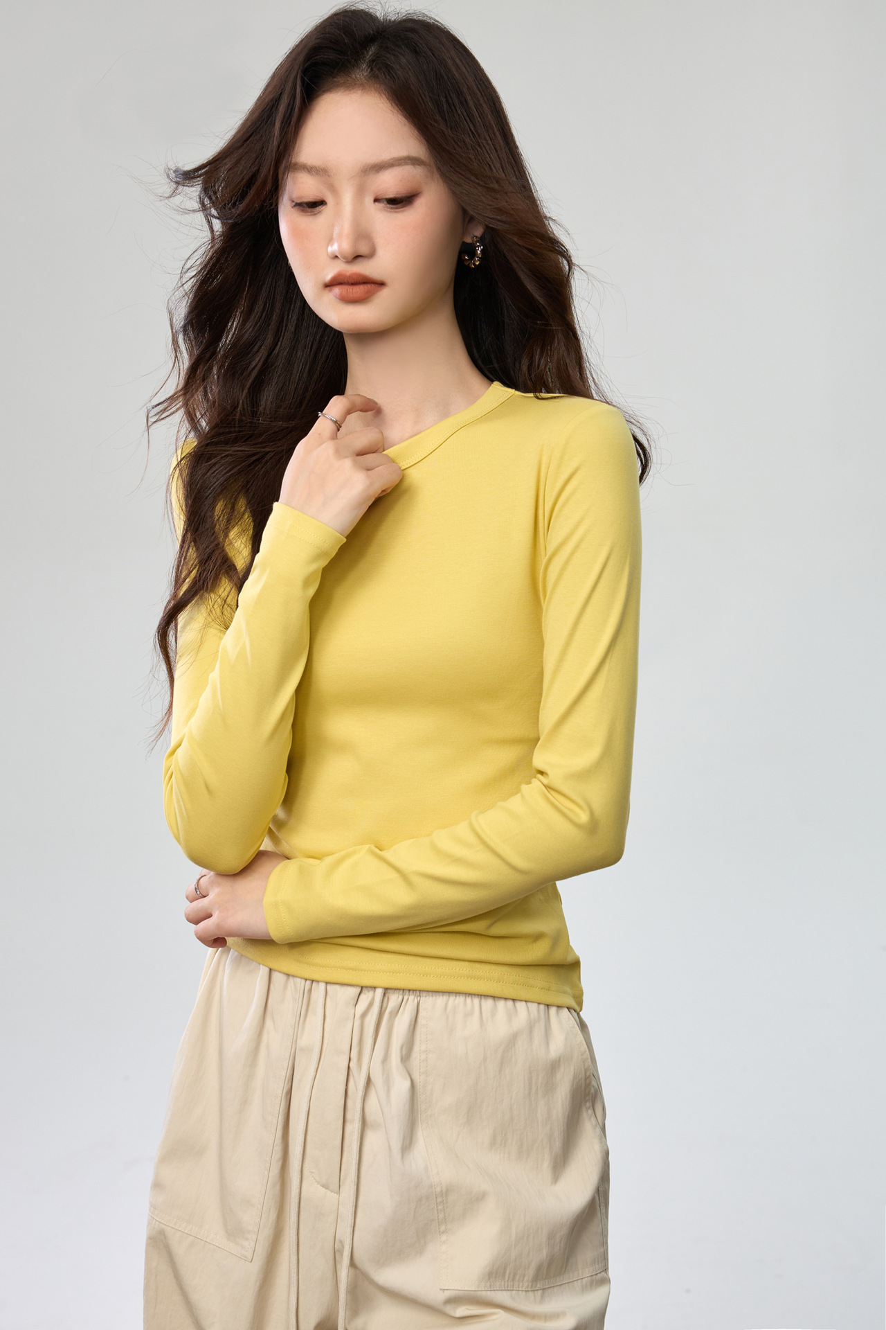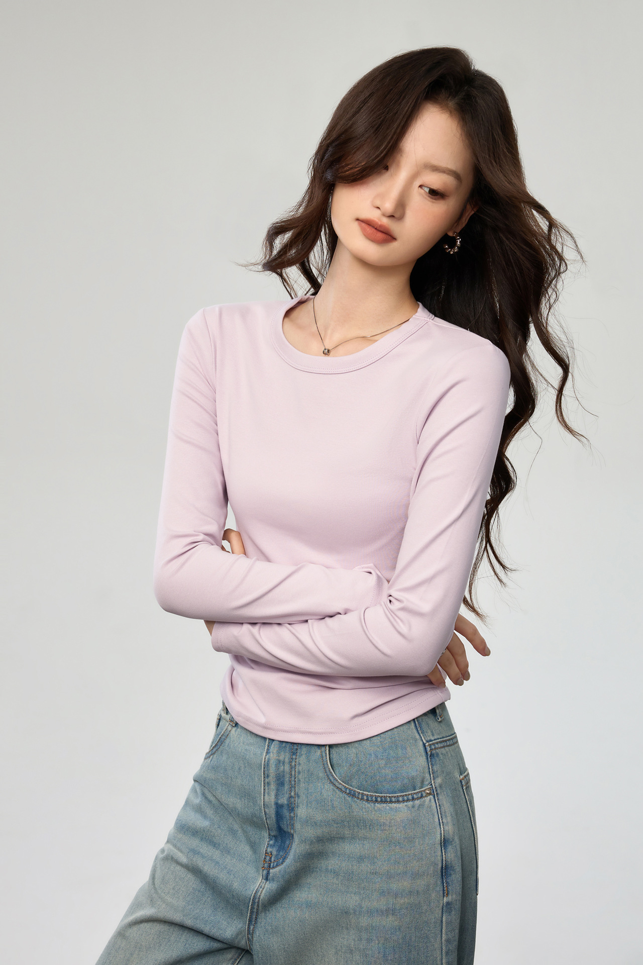 Combed pure cotton, bright line design versatile 2026 autumn new long-sleeved T-shirt women's simple crew neck bottoming shirt top