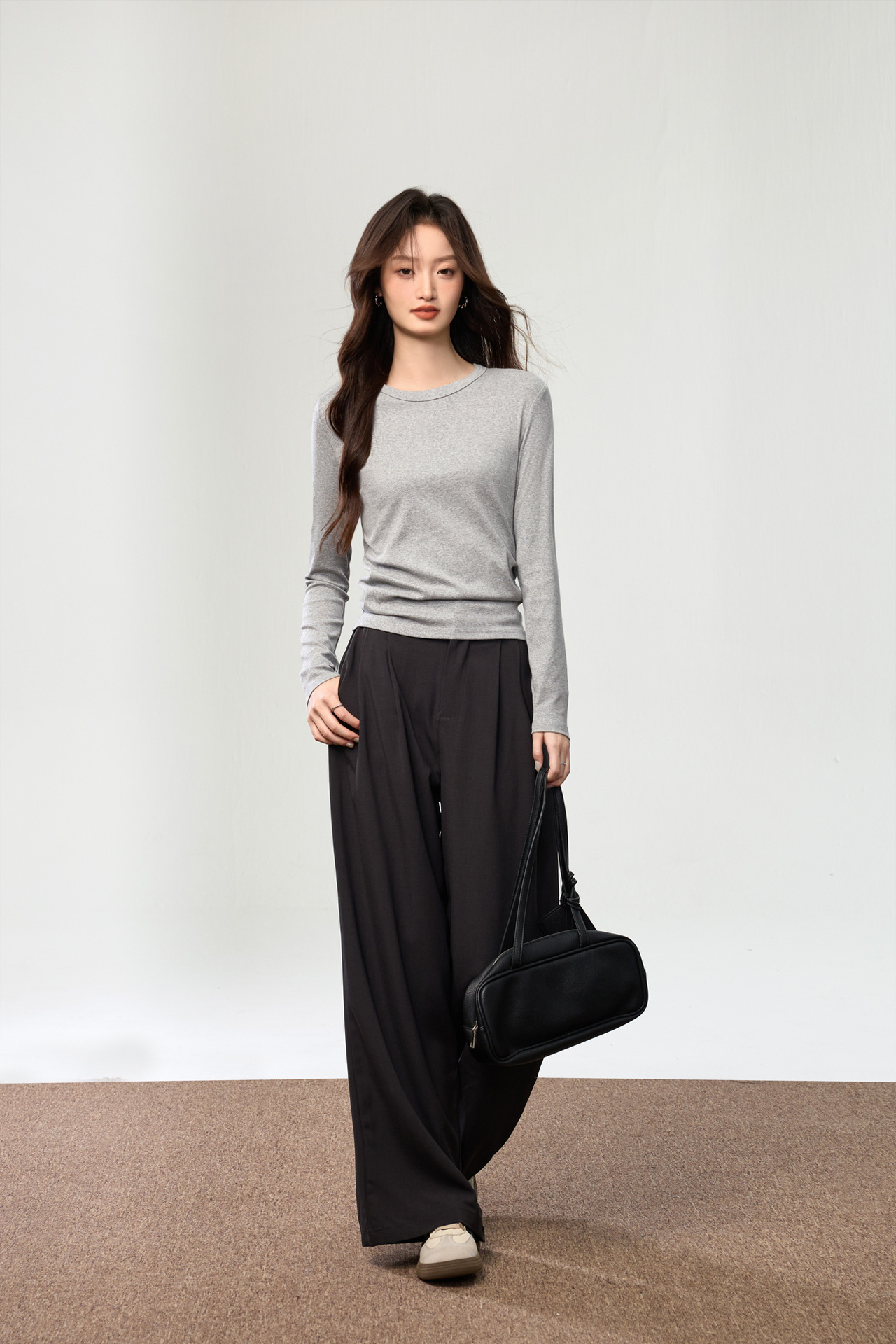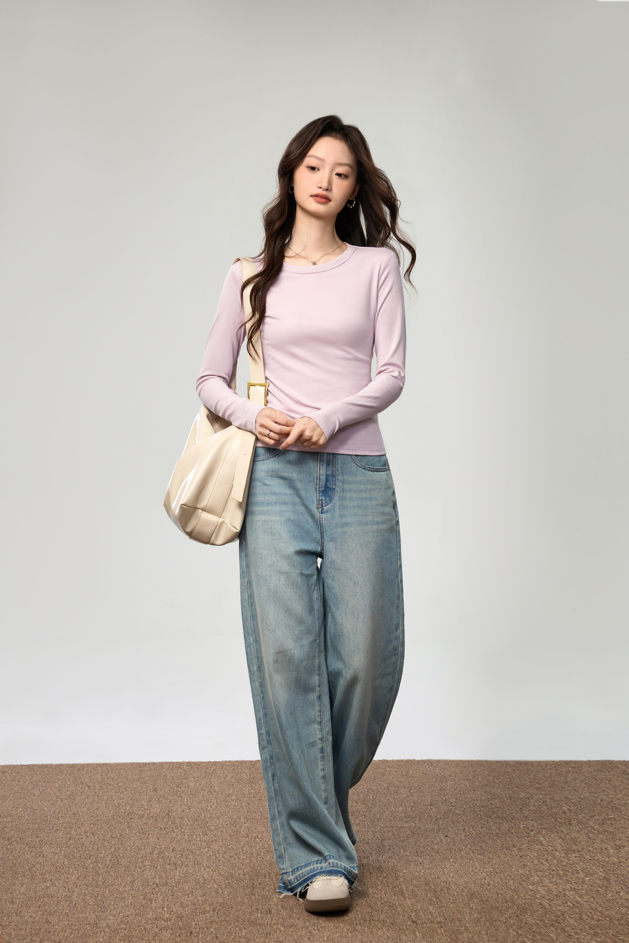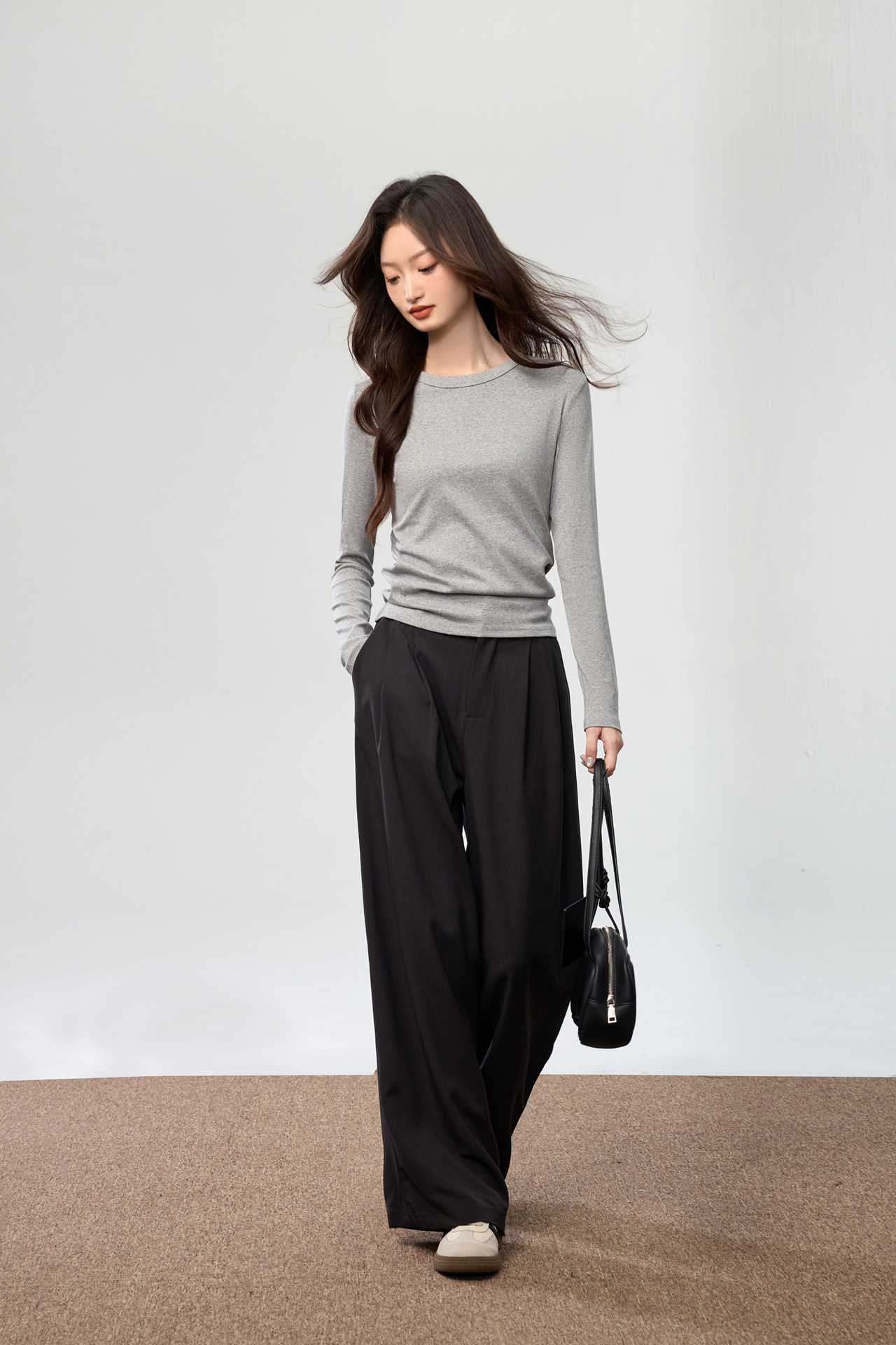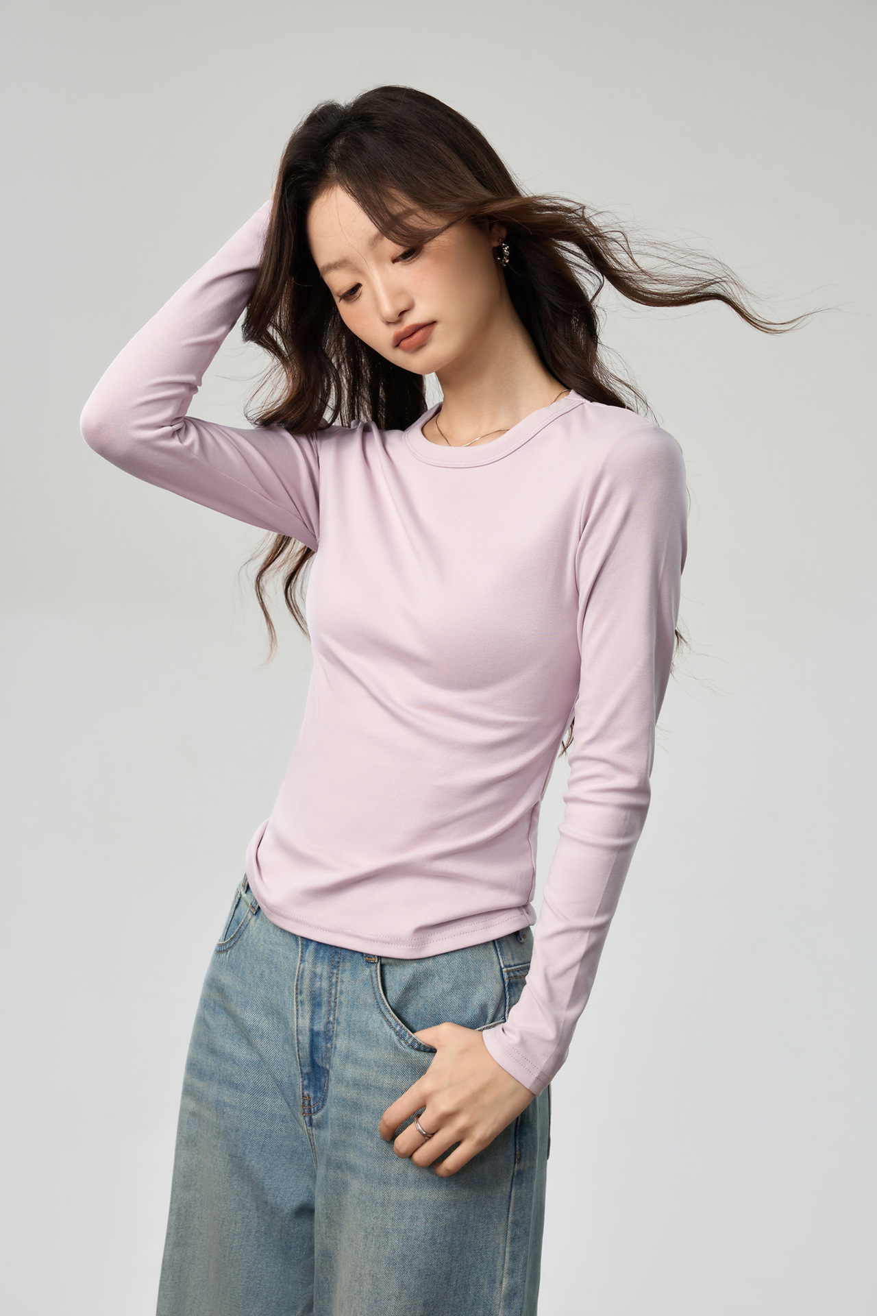 Combed pure cotton, bright line design versatile 2026 autumn new long-sleeved T-shirt women's simple crew neck bottoming shirt top