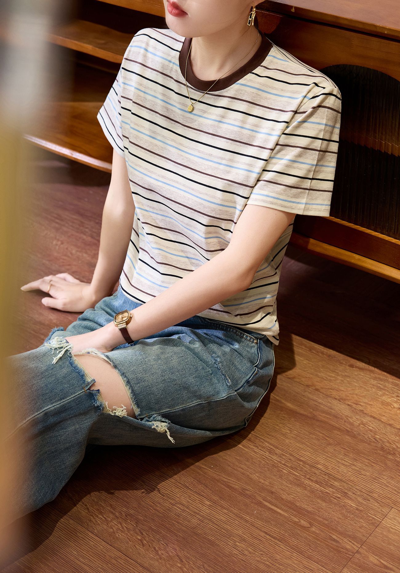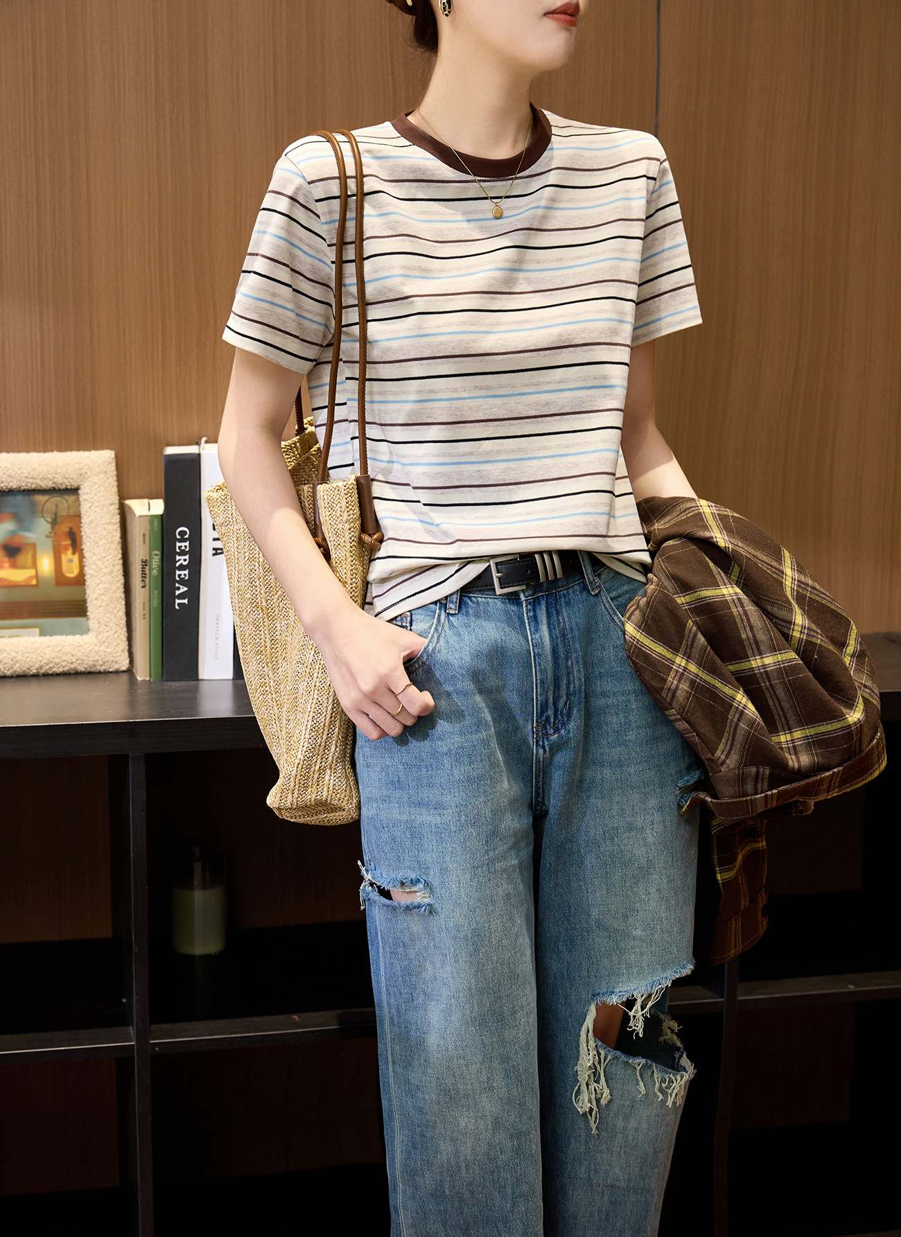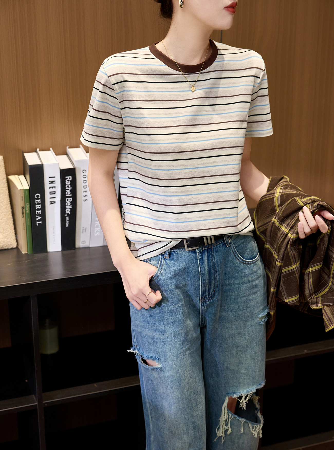 #Combed pure cotton #medium and long loose retro rainbow striped short-sleeved t-shirt women's summer 2026 new lazy top