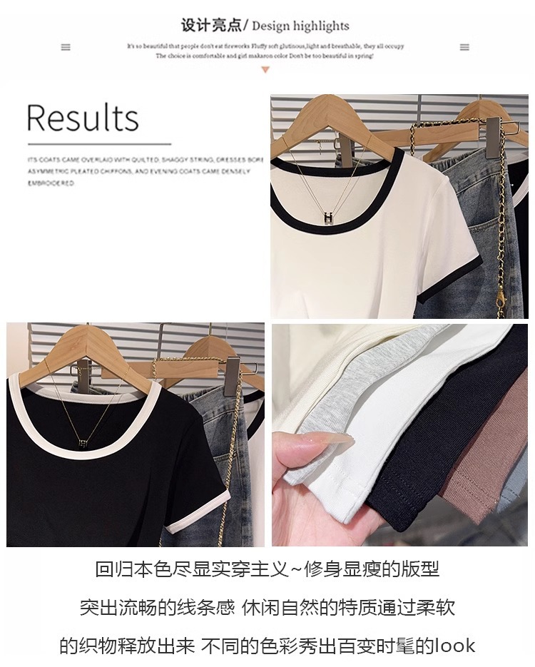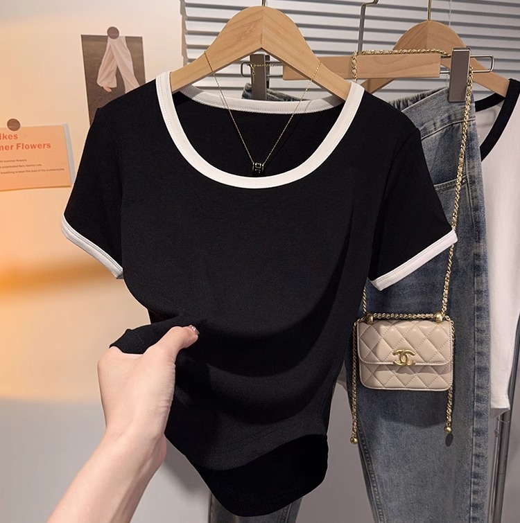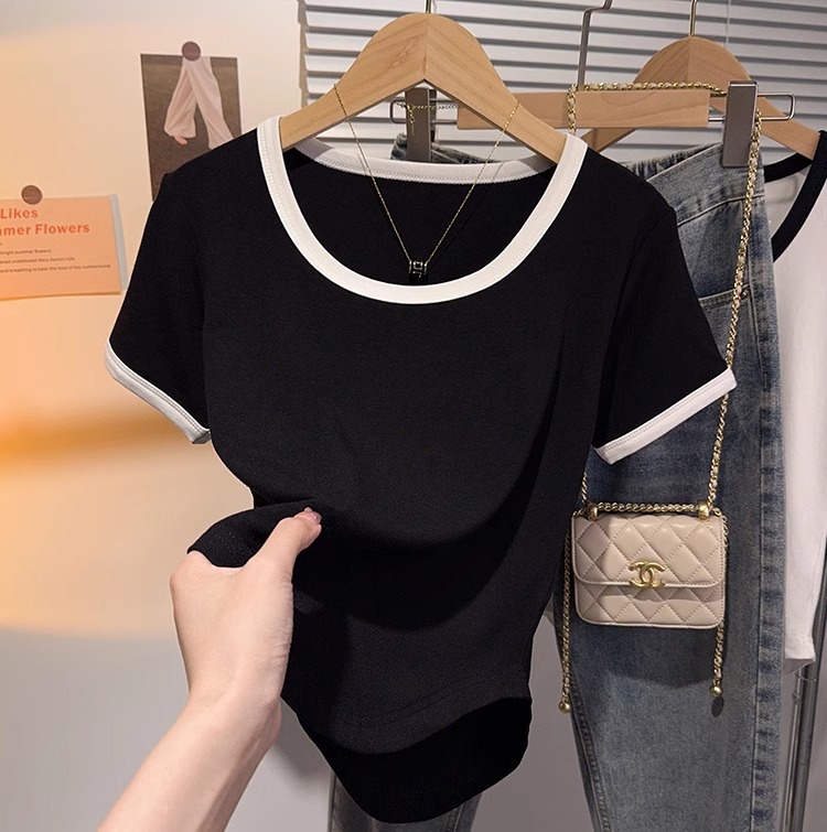 Contrasting colors, fashionable and foreign style u-neck bottoming shirt, slim-fitting and versatile summer unique top, short-sleeved T-shirt, women's new models in 2025