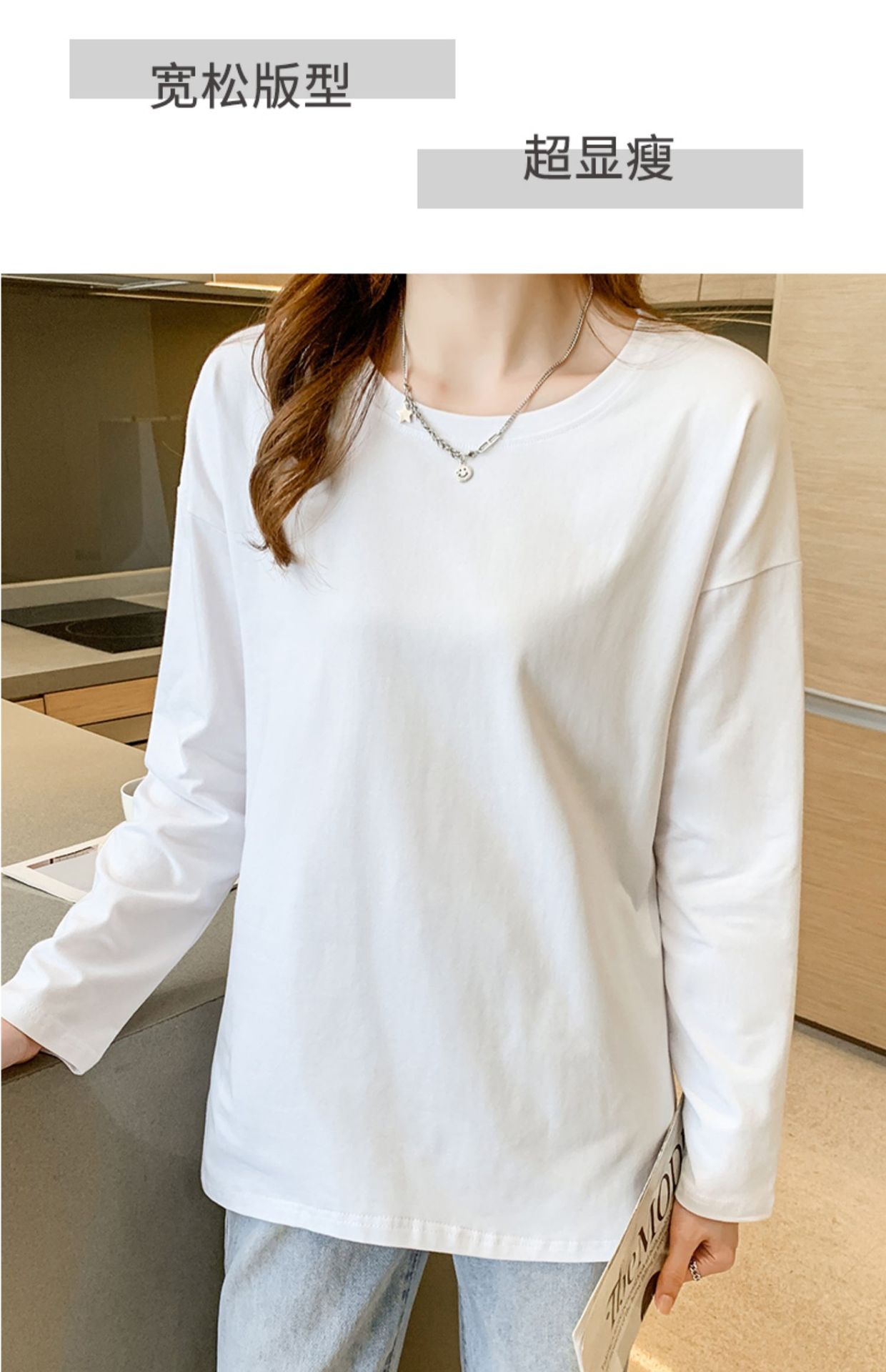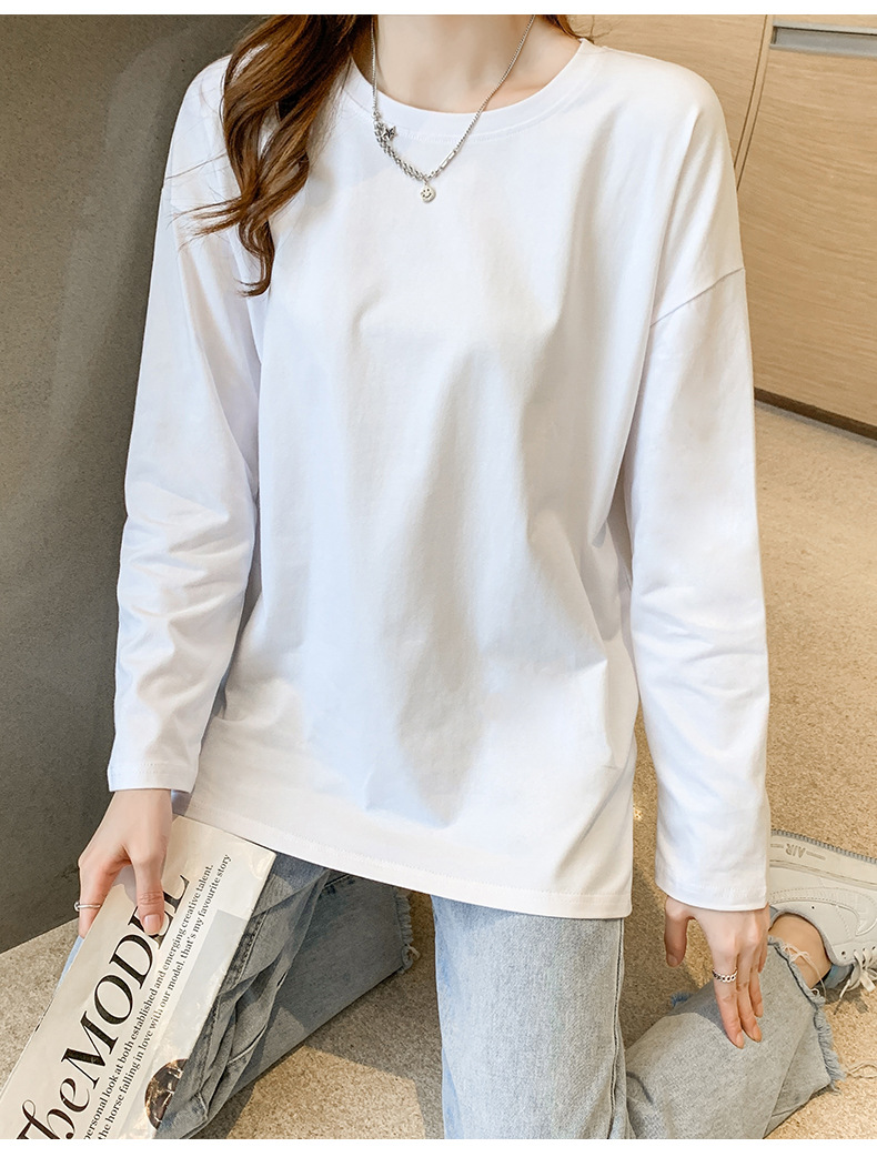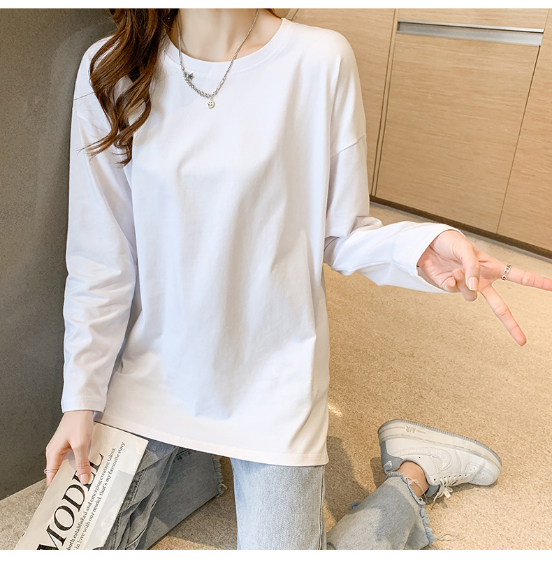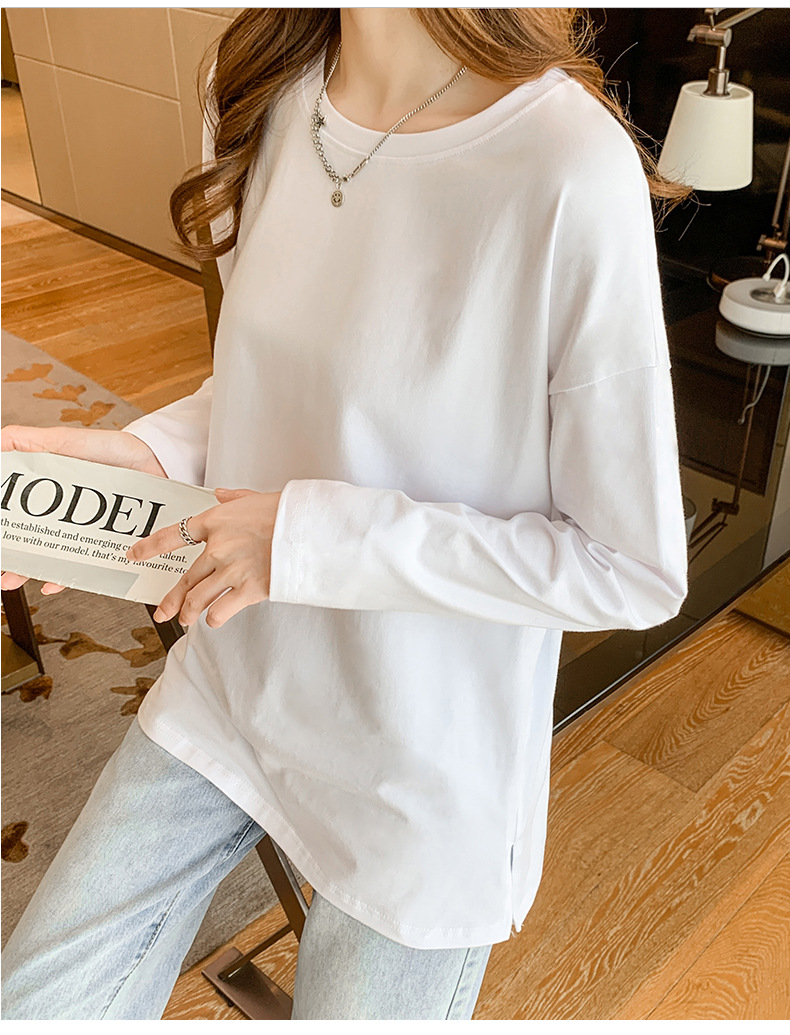 Cotton slit mid-length loose long-sleeved T-shirt base shirt women's crew neck spring and autumn new inner top
