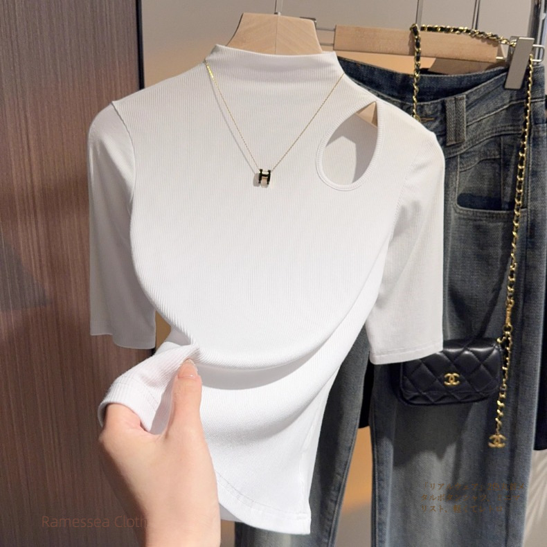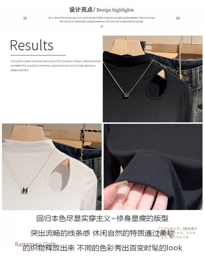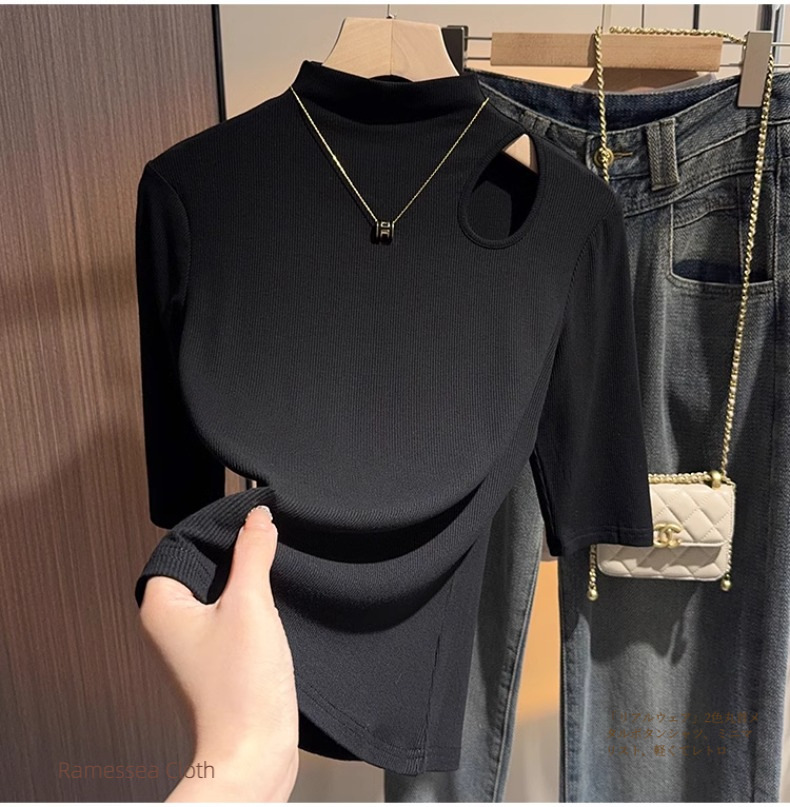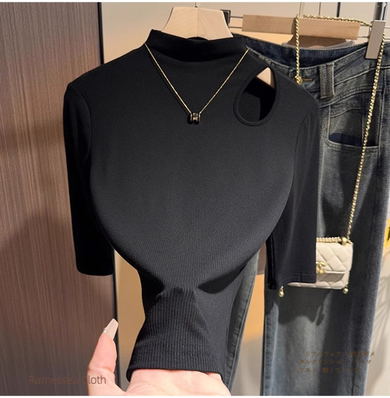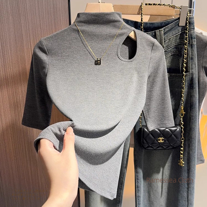 Dark gray hollowed-out semi-turtleneck five-quarter-sleeved t-shirt bottoming shirt women's spring and autumn Korean version versatile design medium-sleeved top