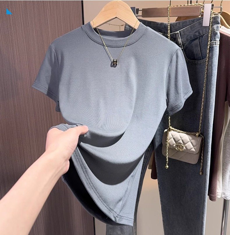 Dark gray short-sleeved t-shirt women's 2025 summer new small stand-up collar slim and thin versatile commuter top