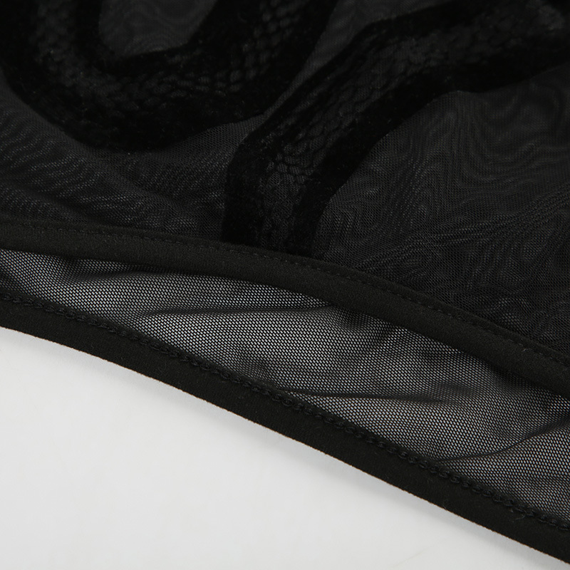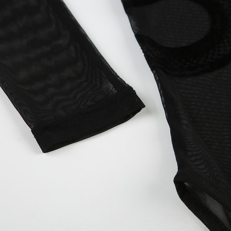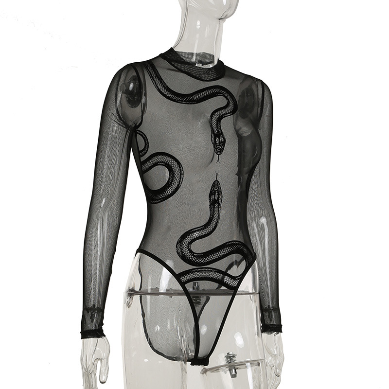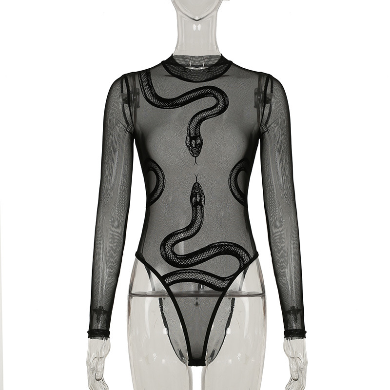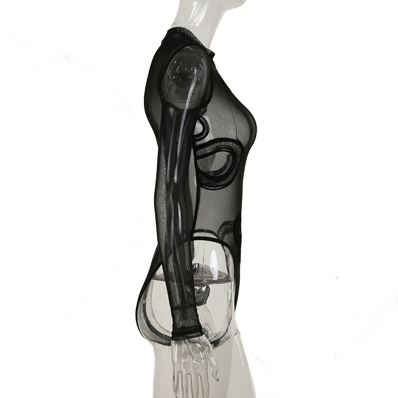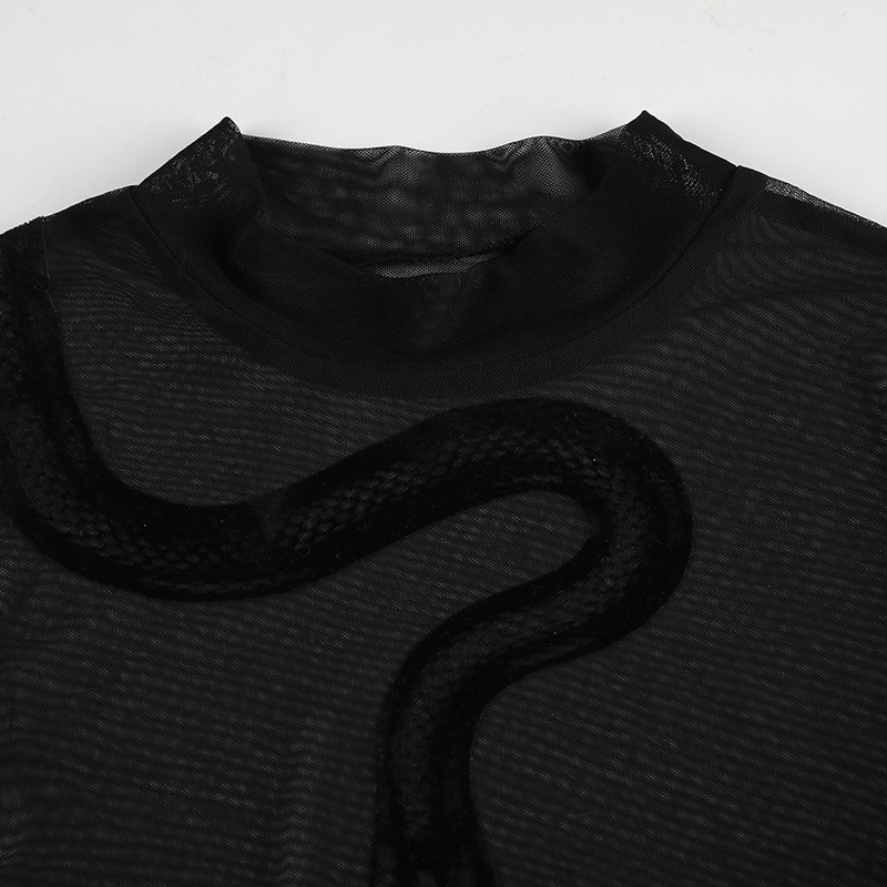 Design sense flocking snake pattern sexy perspective mesh onesie niche Spice Girl style semi-turtleneck elastic long-sleeved top