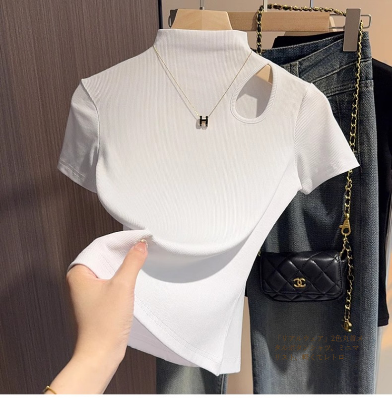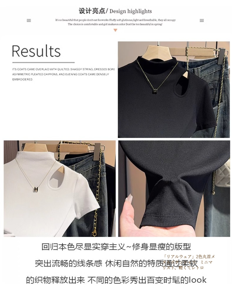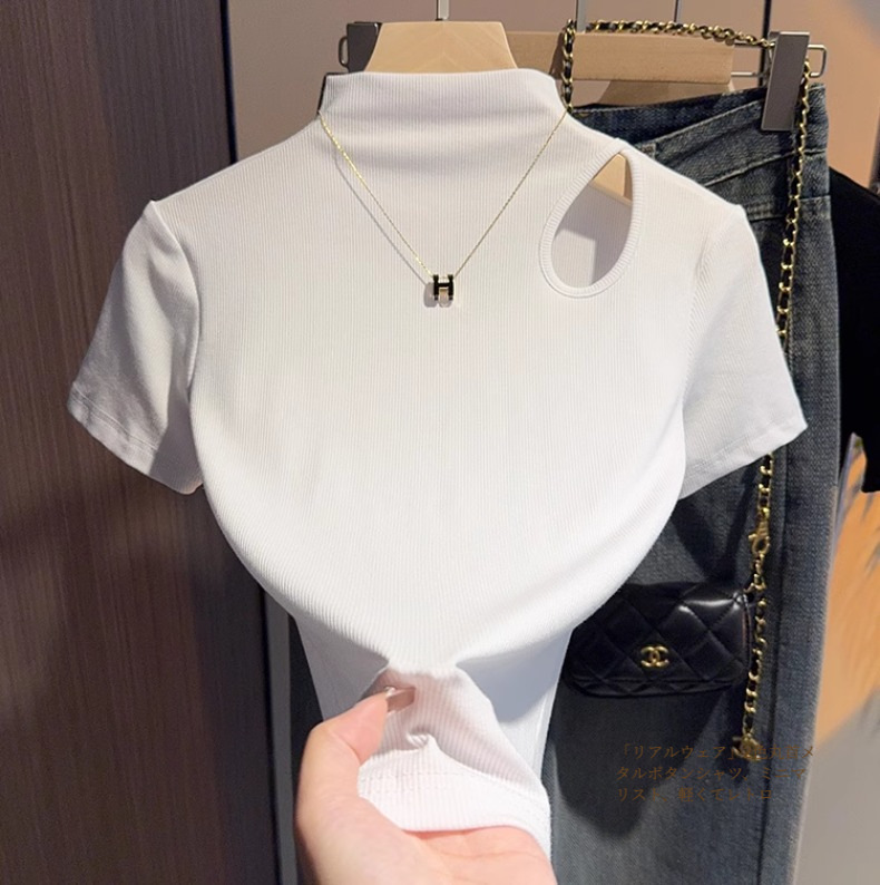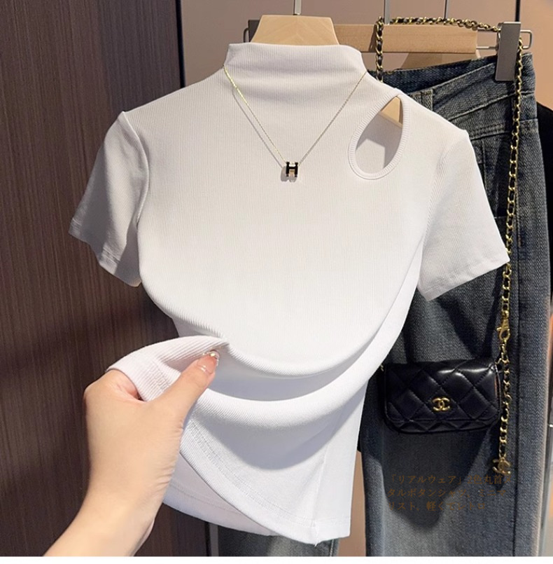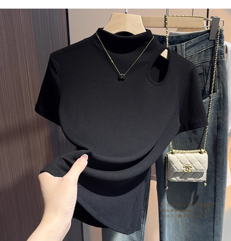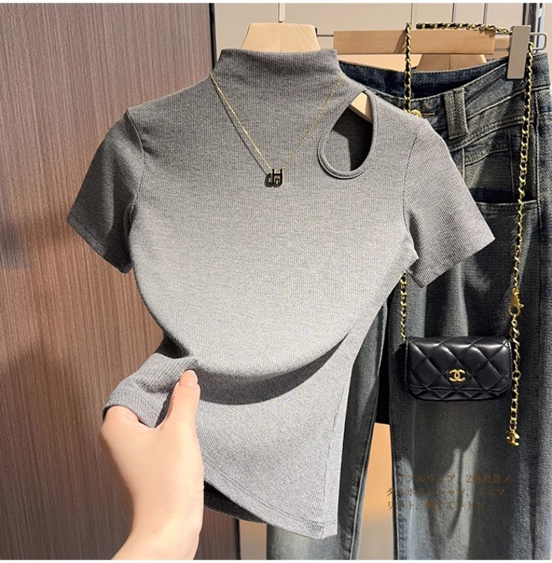 Design sense gray semi-turtleneck short-sleeved t-shirt women's 2025 summer new hollow knitted front shoulder thin top trendy