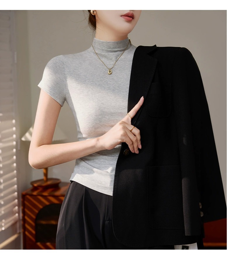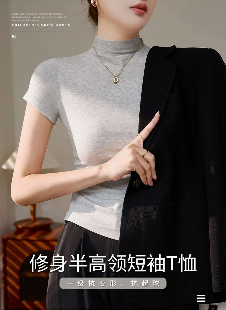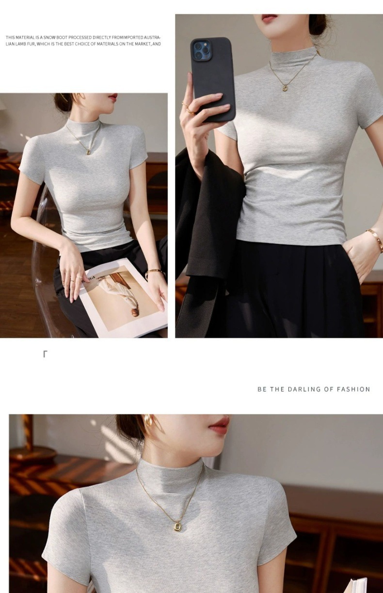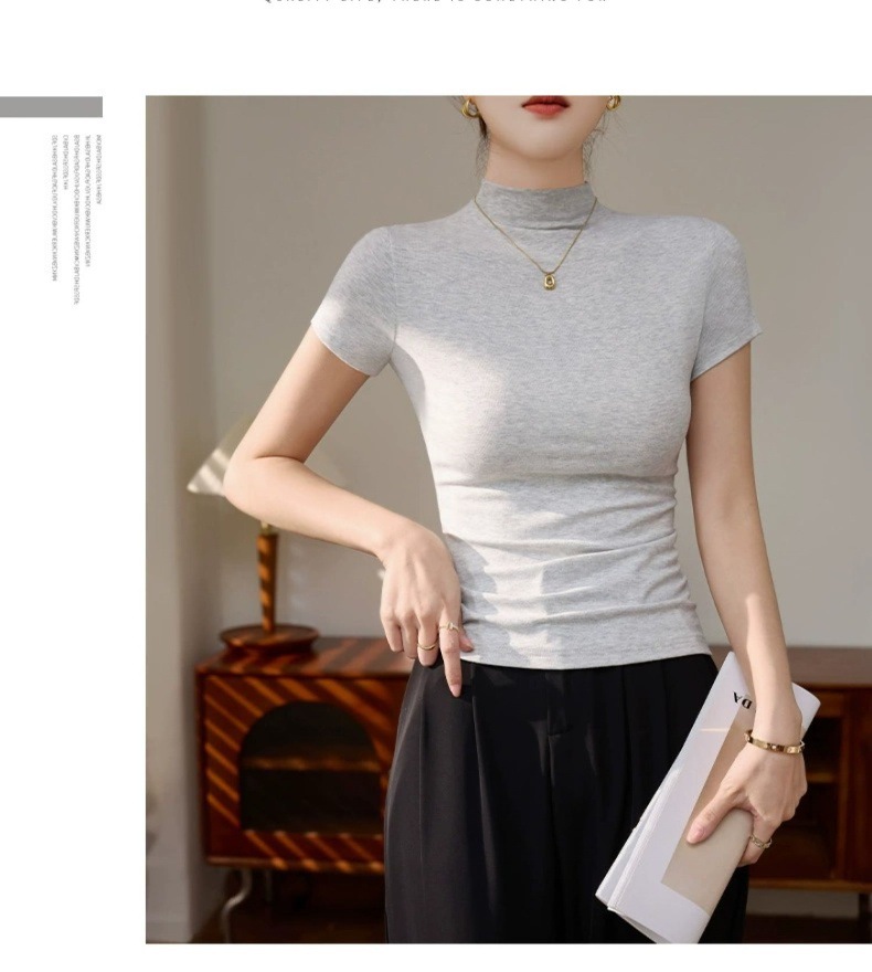 Dopamine summer short-sleeved T-shirt women's outfit semi-turtleneck base shirt thread knit slimming temperament straight shoulder top