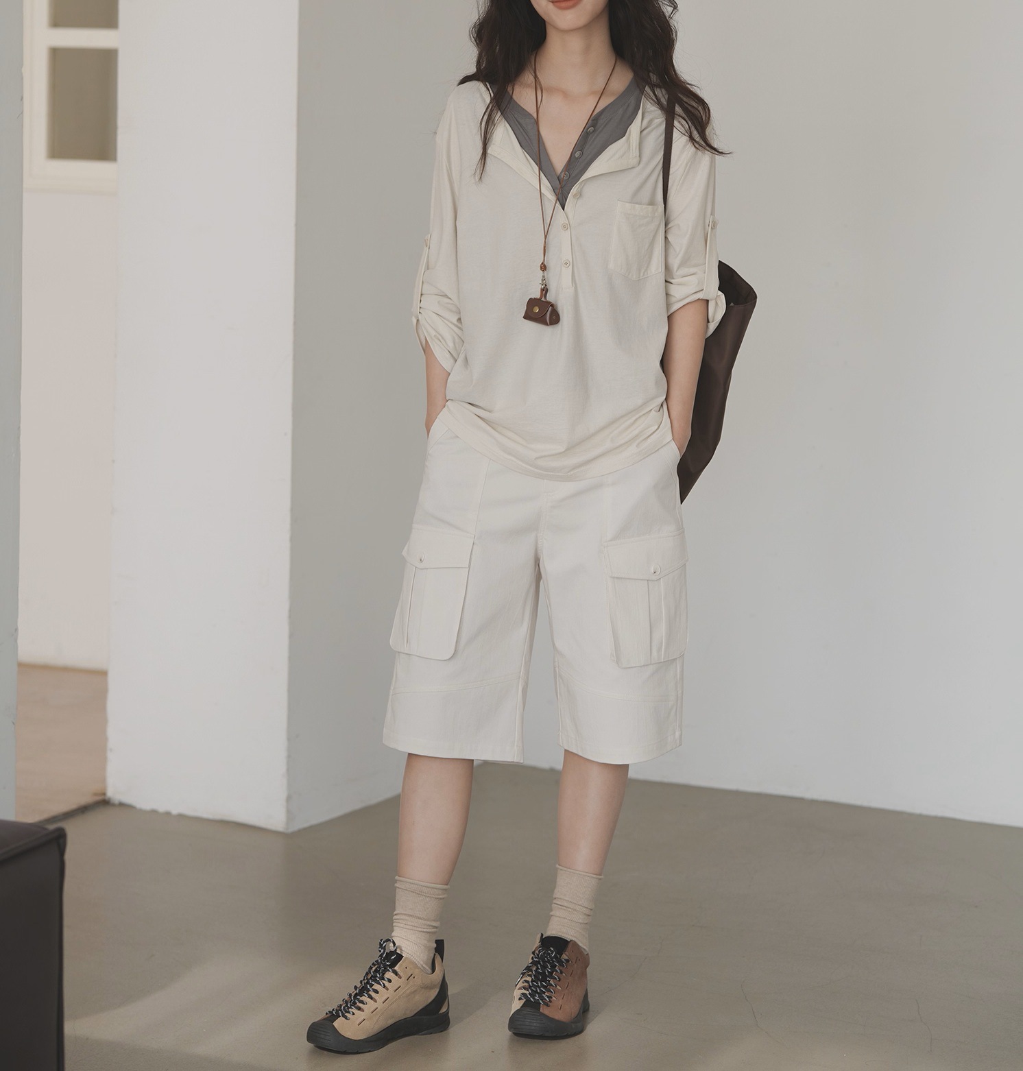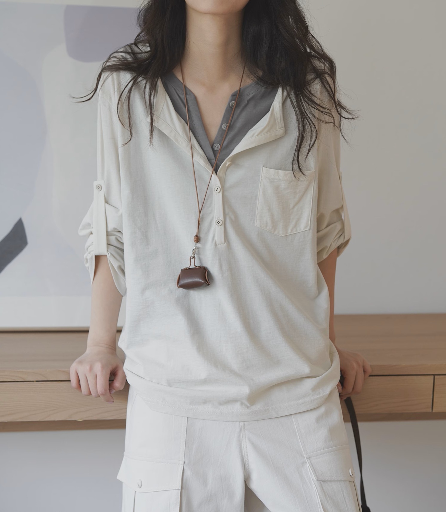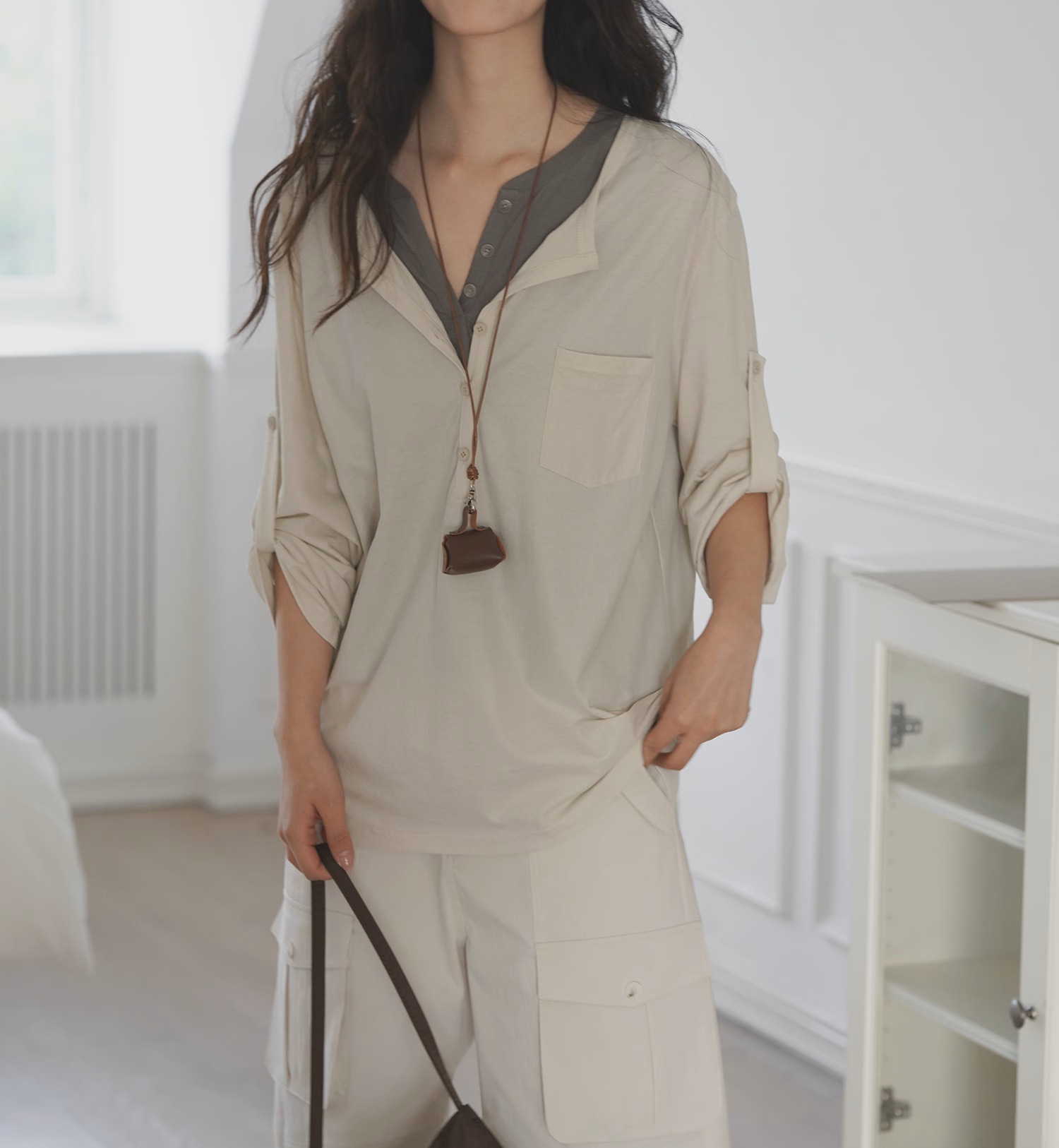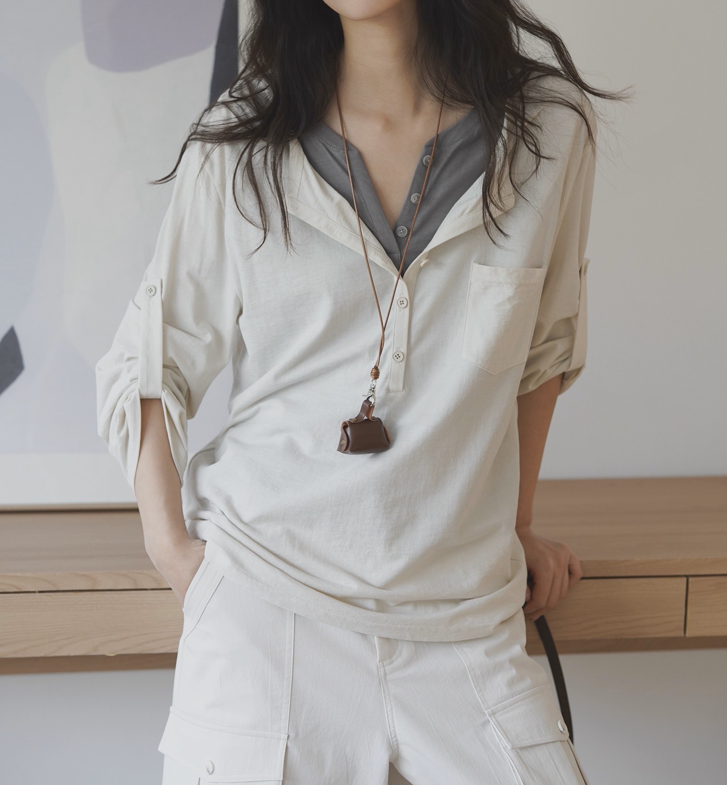 EIGHTMONTH contrasting fake two-piece loose T-shirt women's 2025 autumn new mid-sleeved shoulder-down niche top