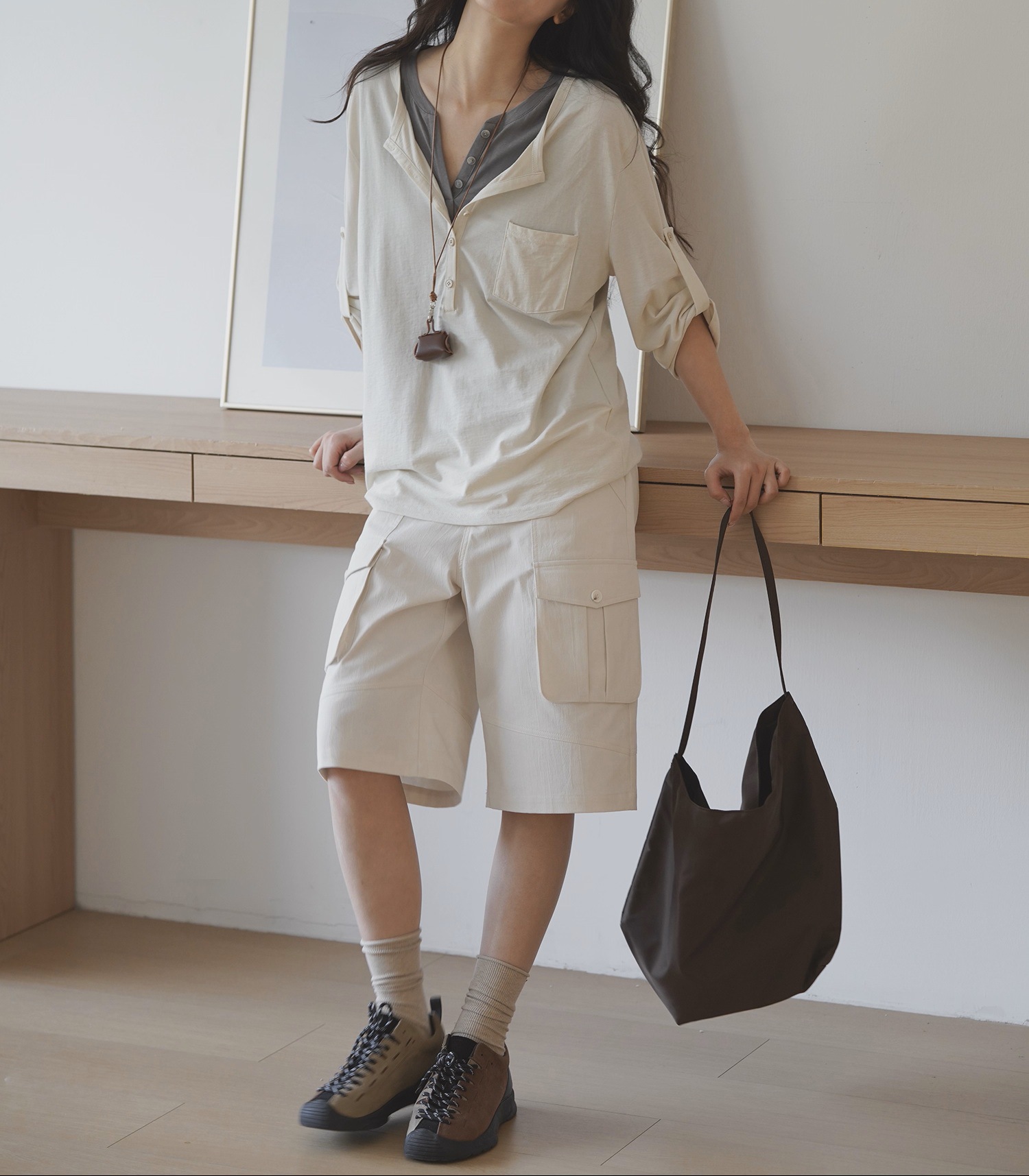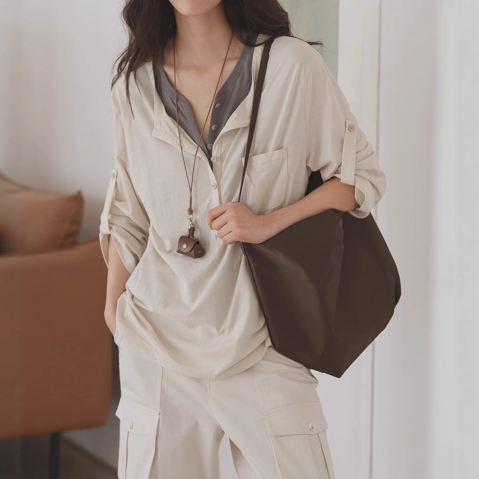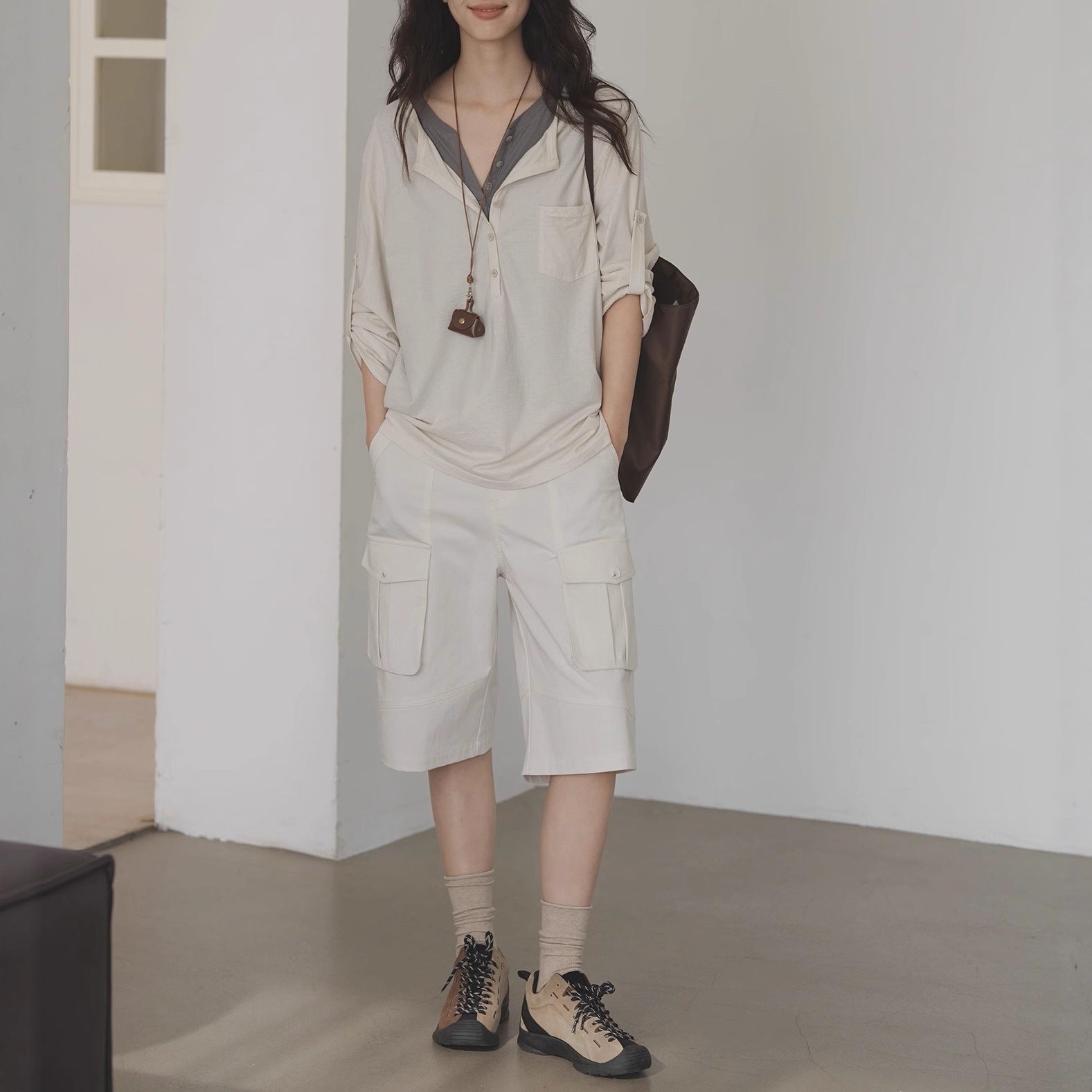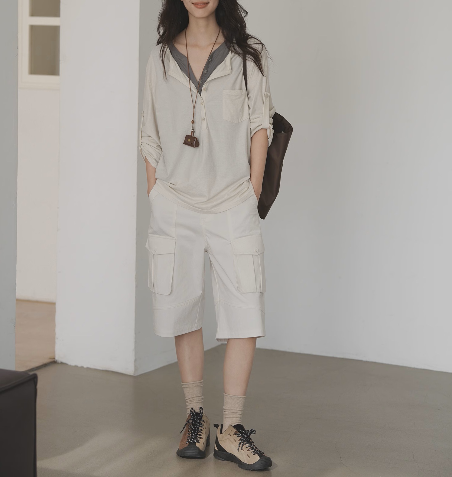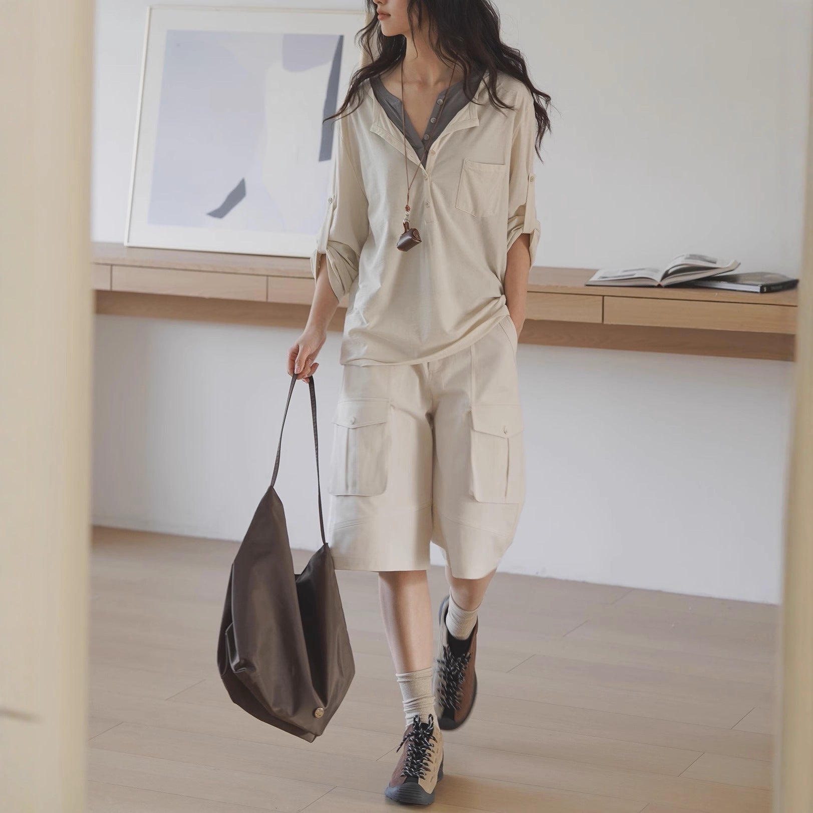 EIGHTMONTH contrasting fake two-piece loose T-shirt women's 2025 autumn new mid-sleeved shoulder-down niche top