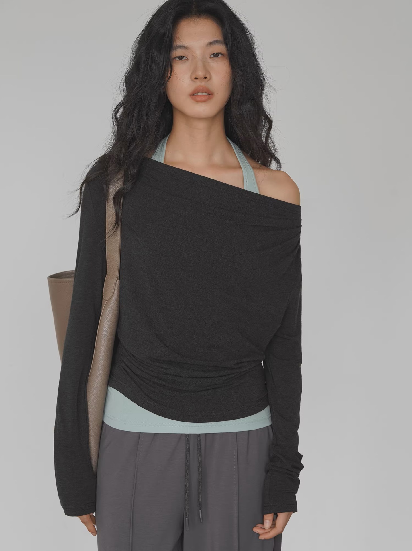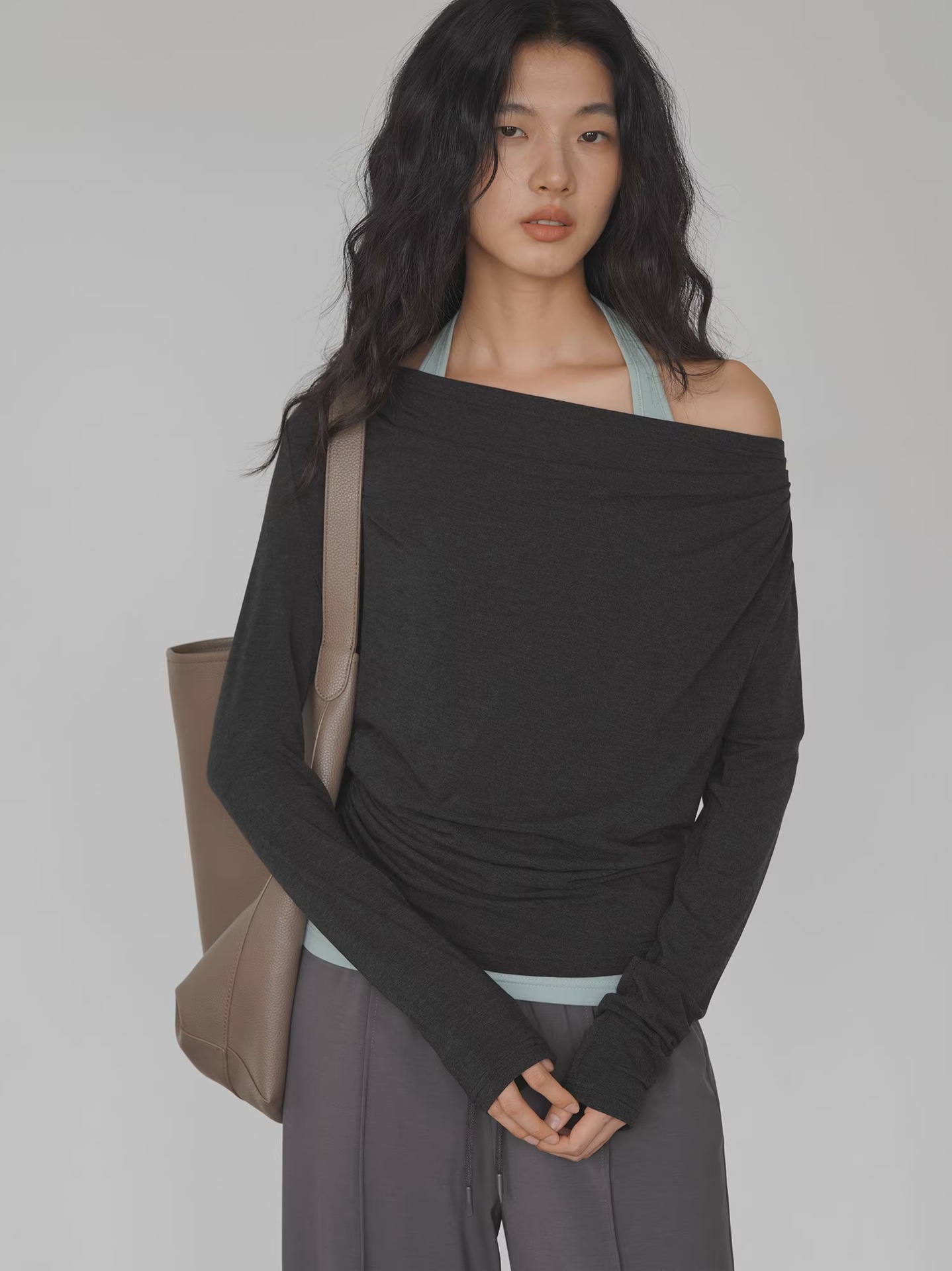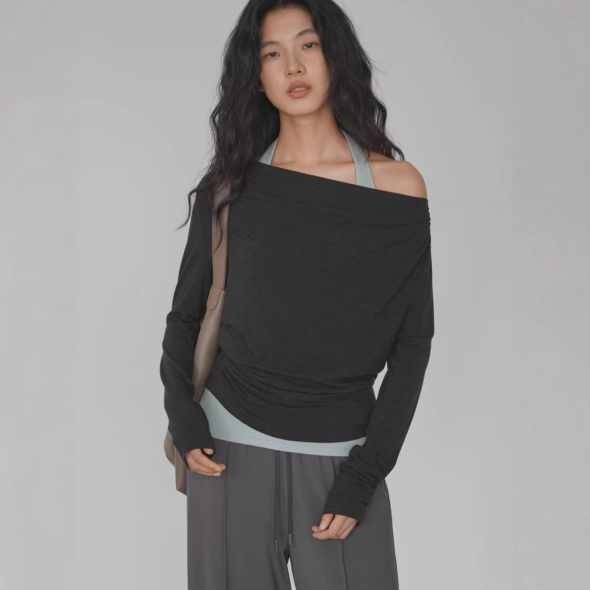EIGHTMONTH Spice Girl Stacking Suit Gray Off-Shoulder Top + Light Green Inner Fashion Careful Machine Two-piece Set