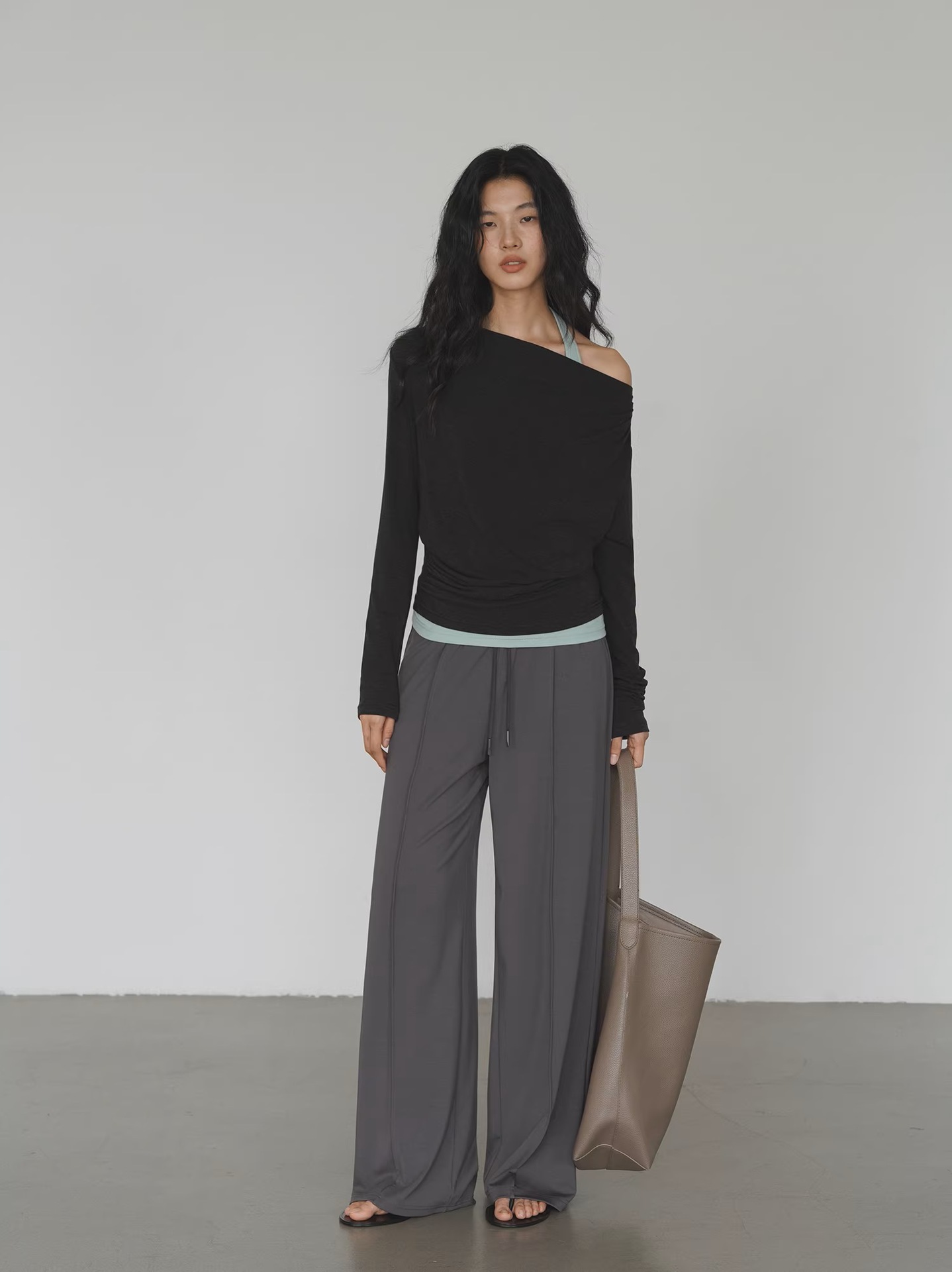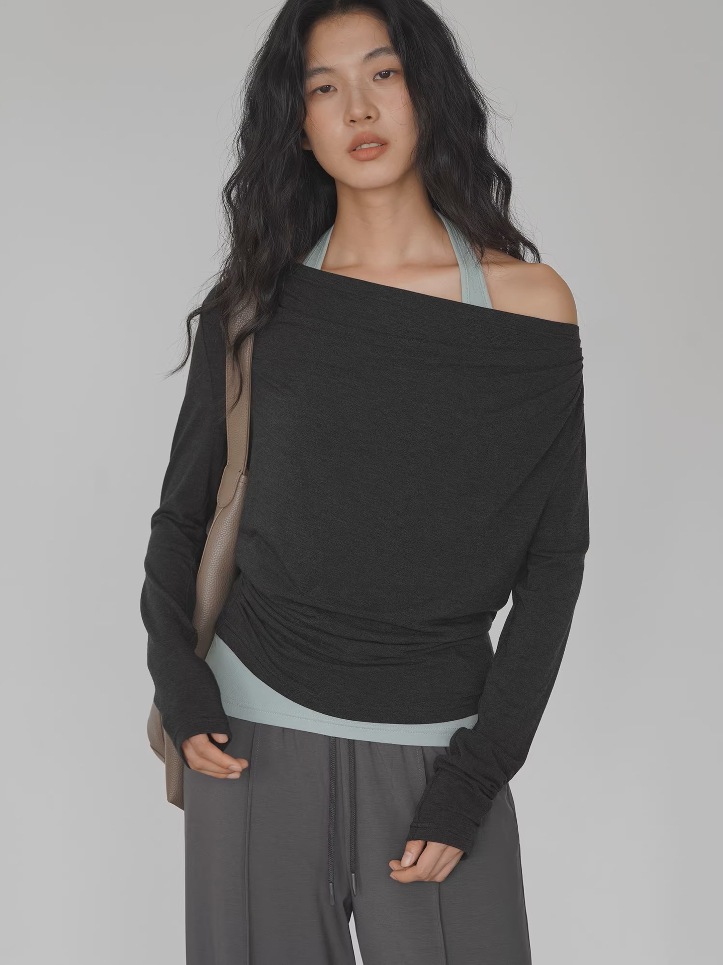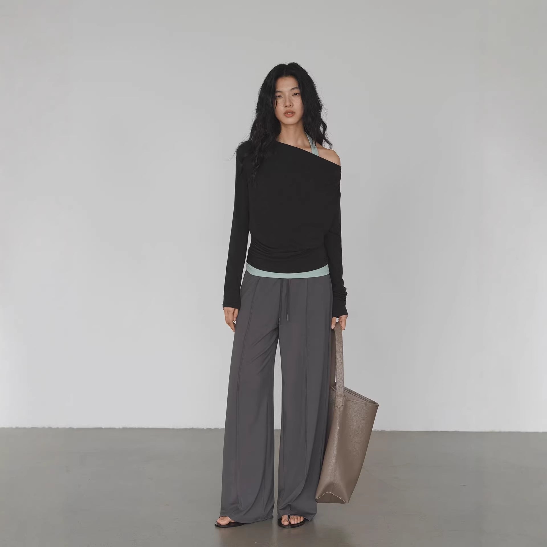 EIGHTMONTH Spice Girl Stacking Suit Gray Off-Shoulder Top + Light Green Inner Fashion Careful Machine Two-piece Set