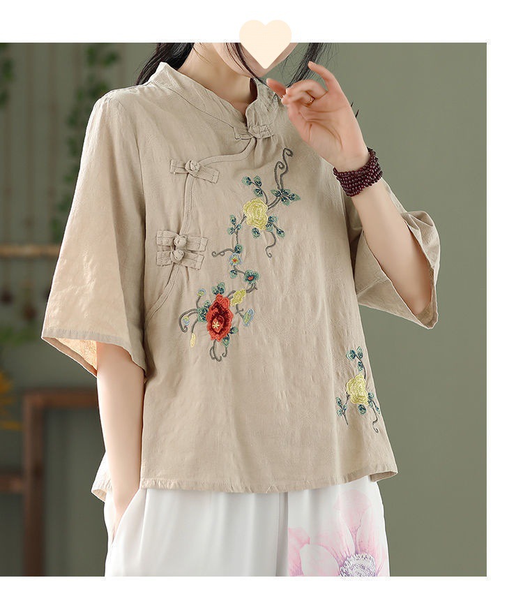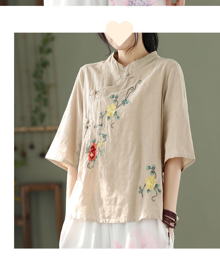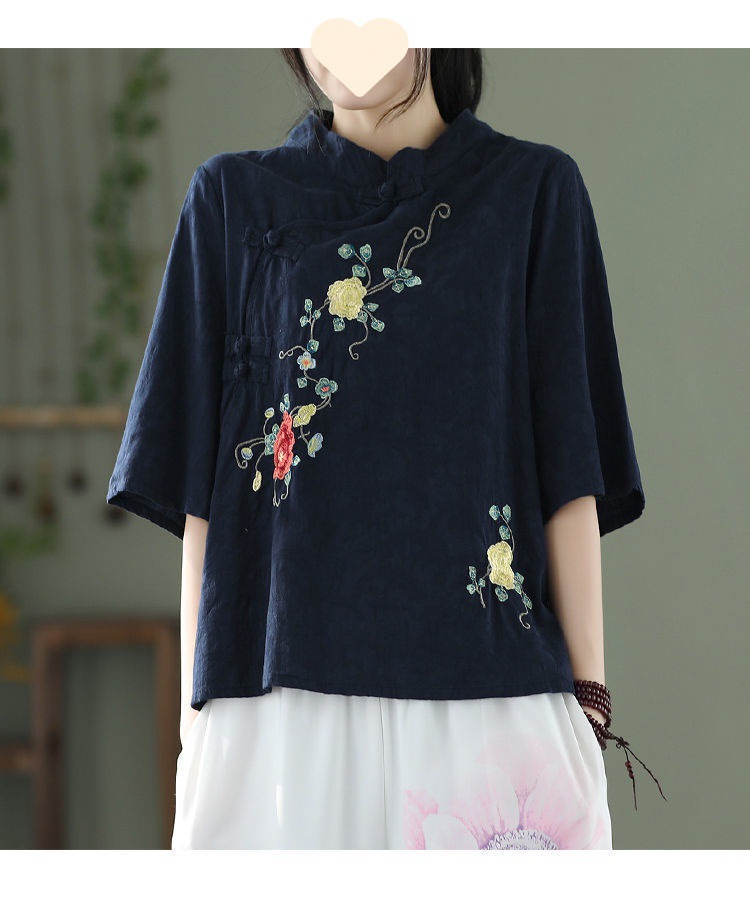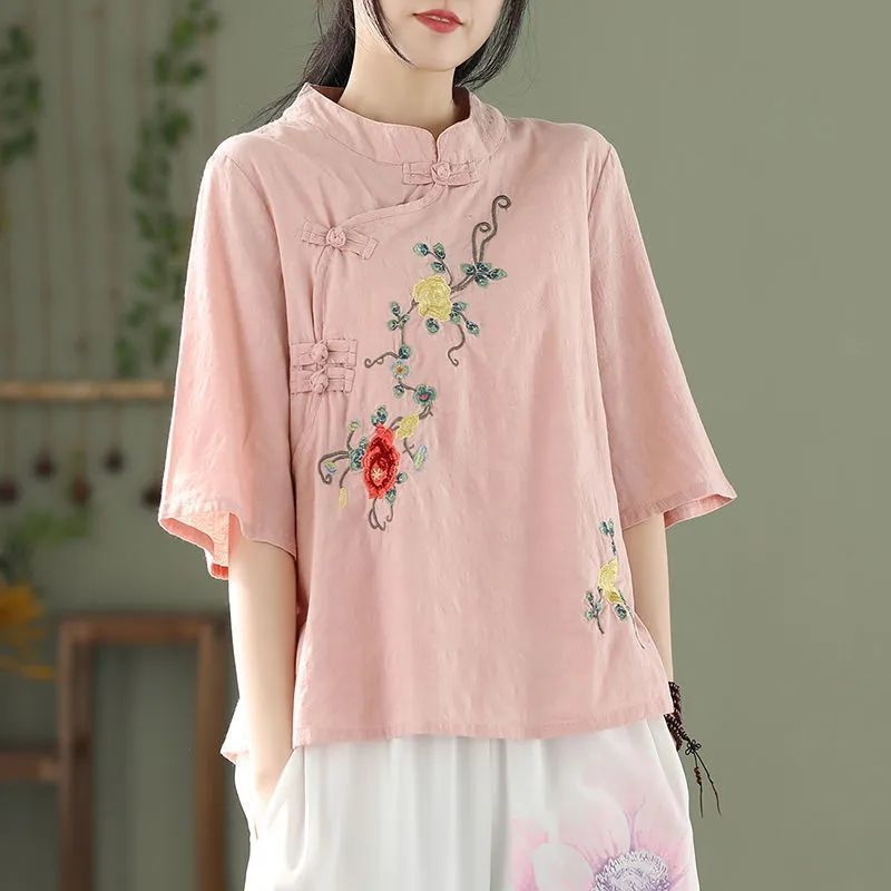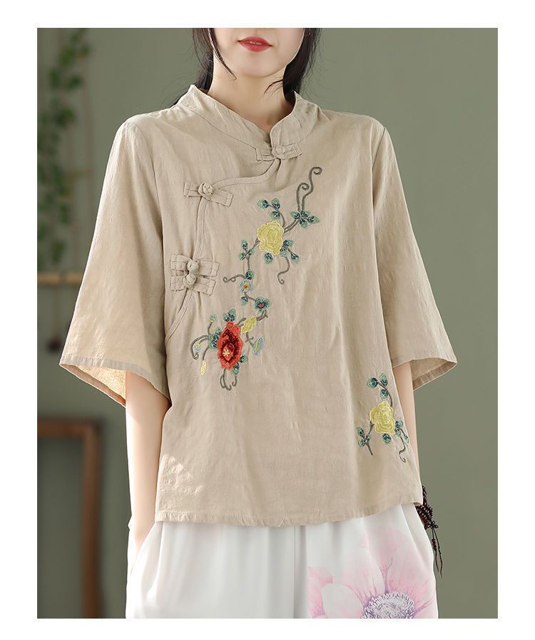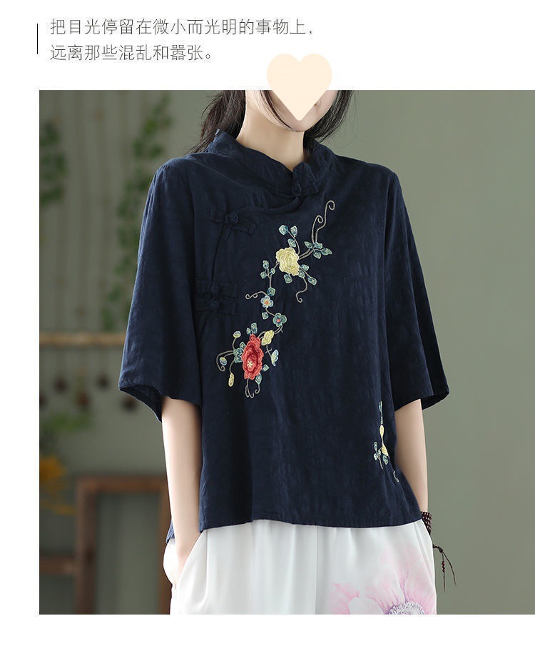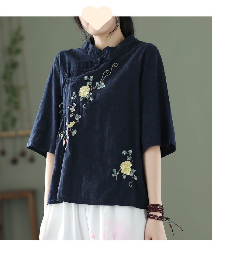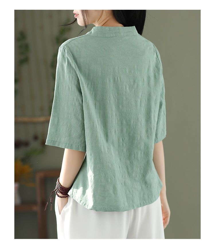 Ethnic style large size stand-up collar diagonal placket embroidered retro buckle solid color pullover medium sleeve cotton and linen short top women's summer wear