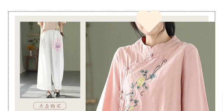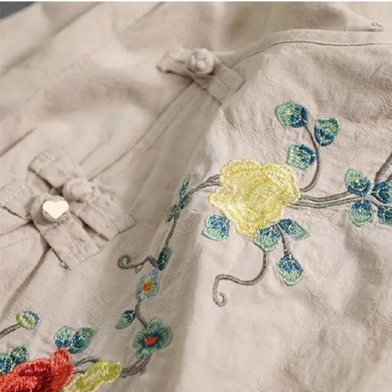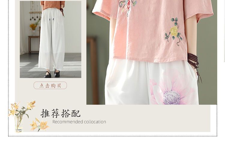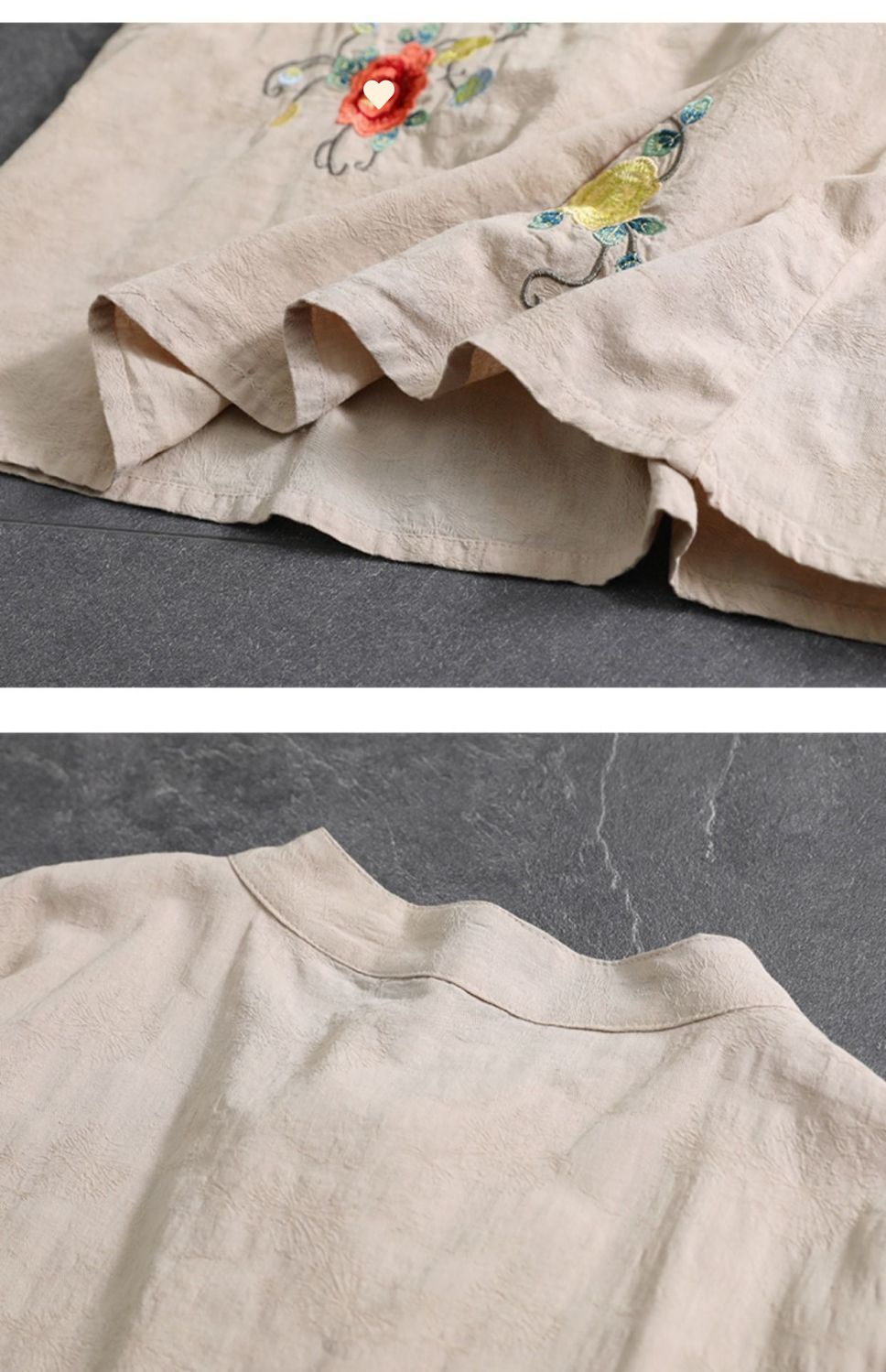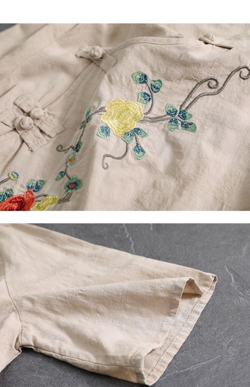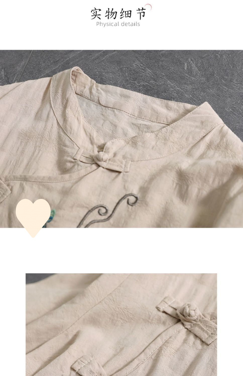 Ethnic style large size stand-up collar diagonal placket embroidered retro buckle solid color pullover medium sleeve cotton and linen short top women's summer wear