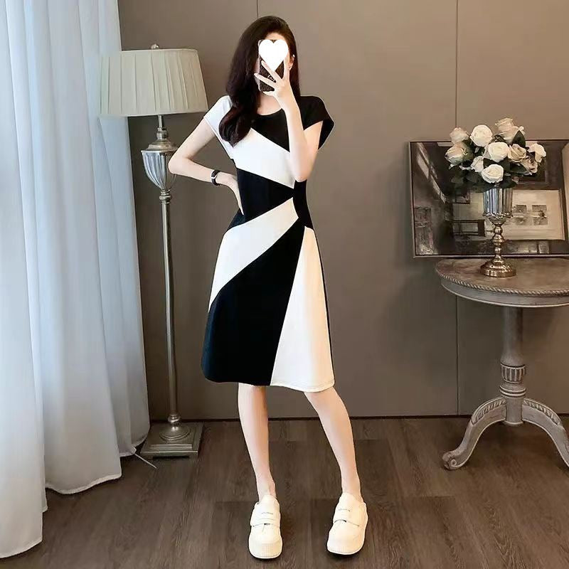 French dress summer 2024 new temperament waist thin high black and white splicing casual skirt