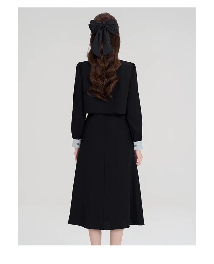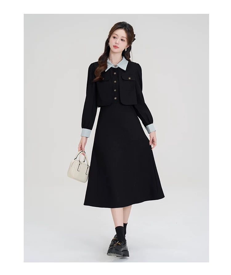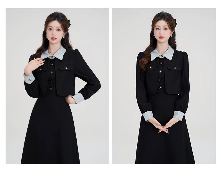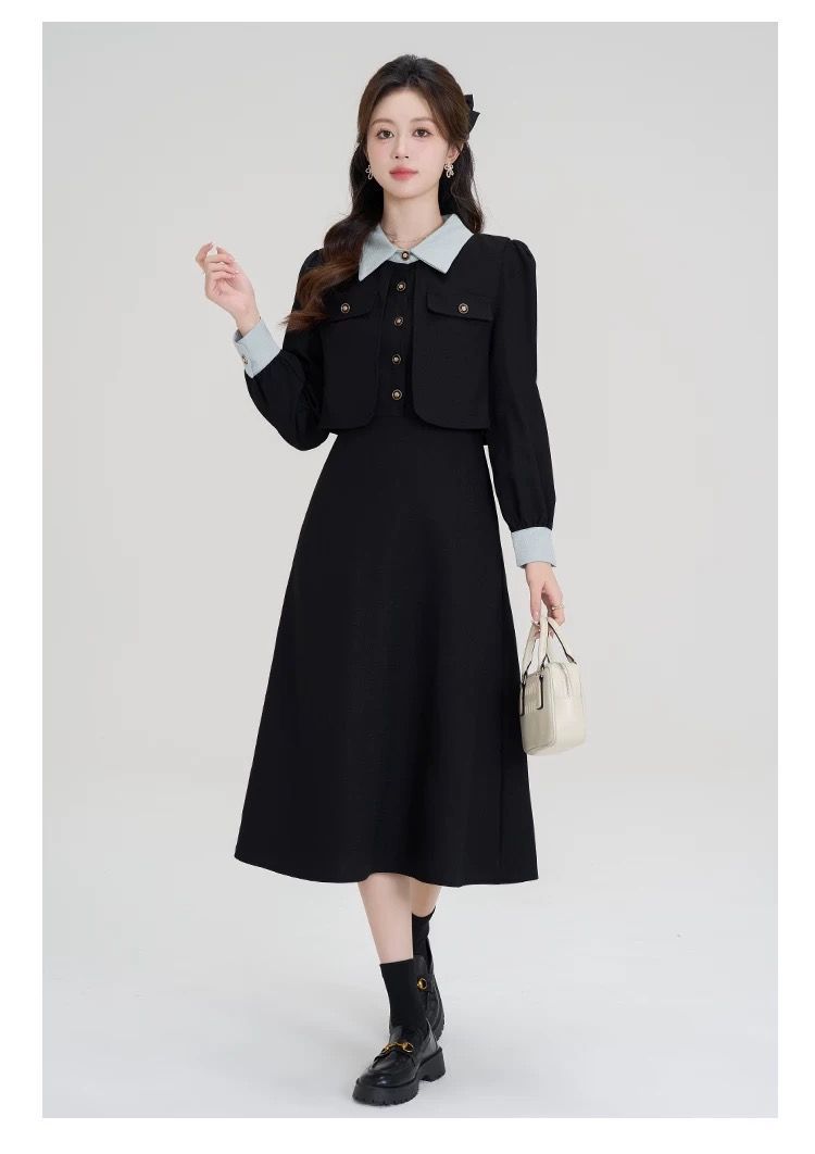 French fake two-piece temperament high-end black long-sleeved large size fat mm2025 autumn and winter women's clothing waist dress