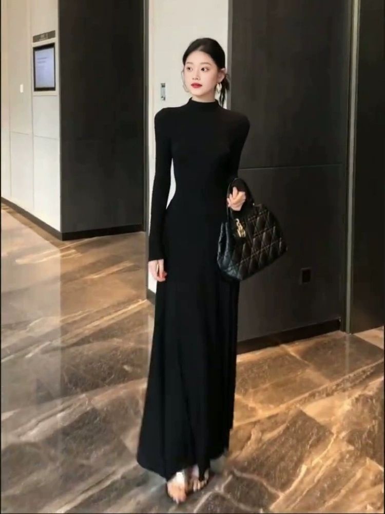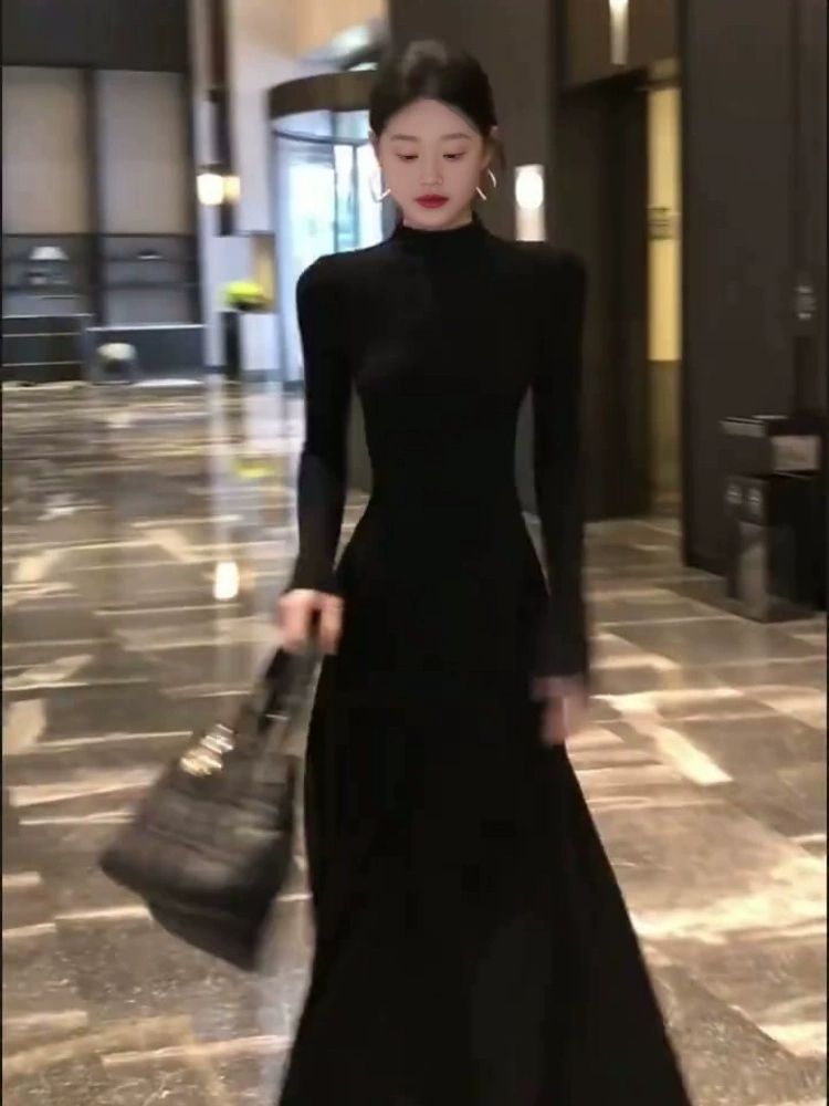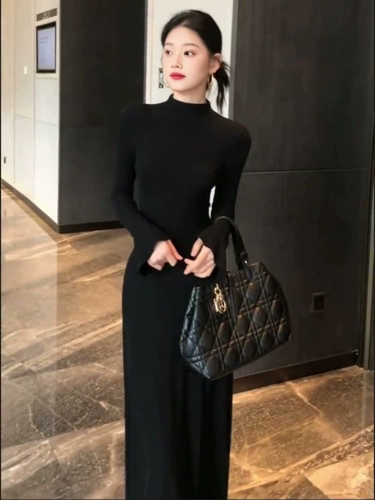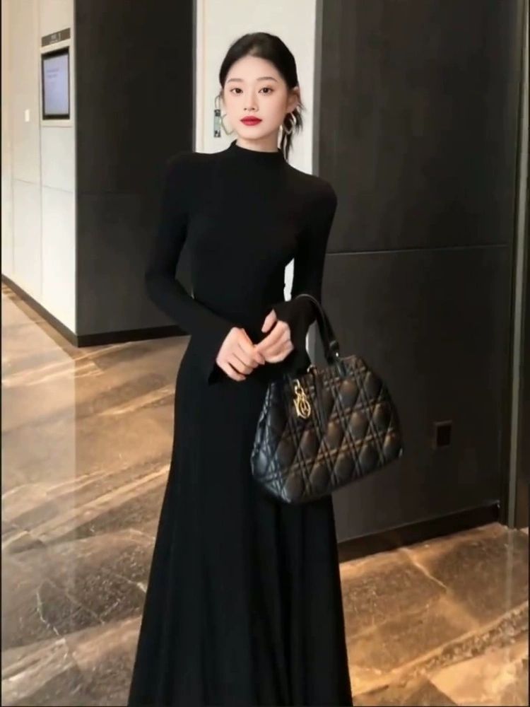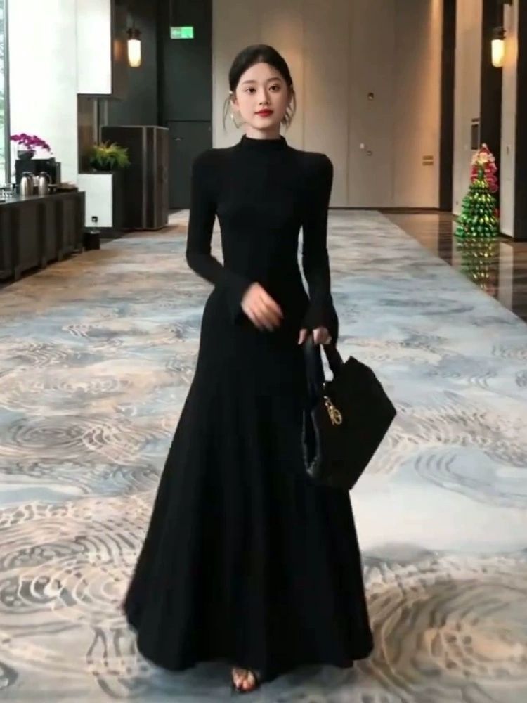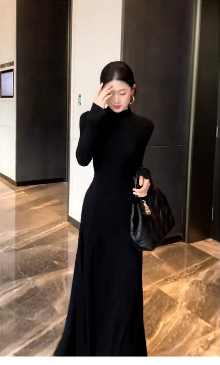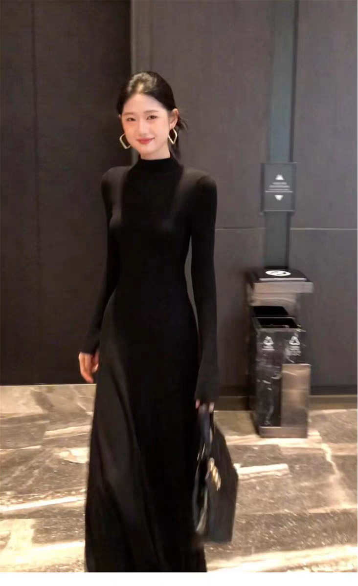French high-end black long-sleeved dress 2025 autumn and winter new slim-fitting and thin semi-turtleneck bottomed knitted skirt