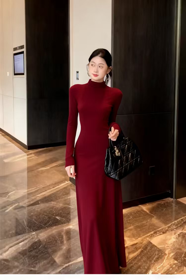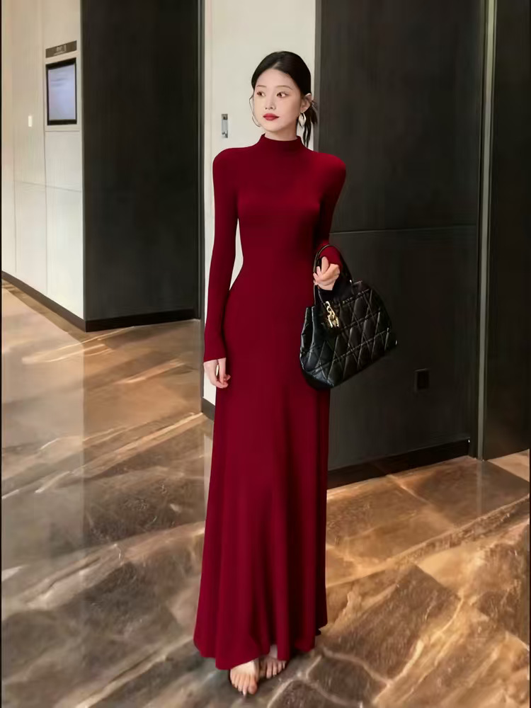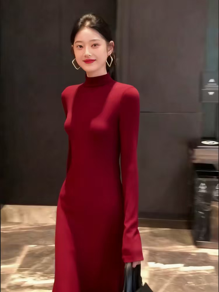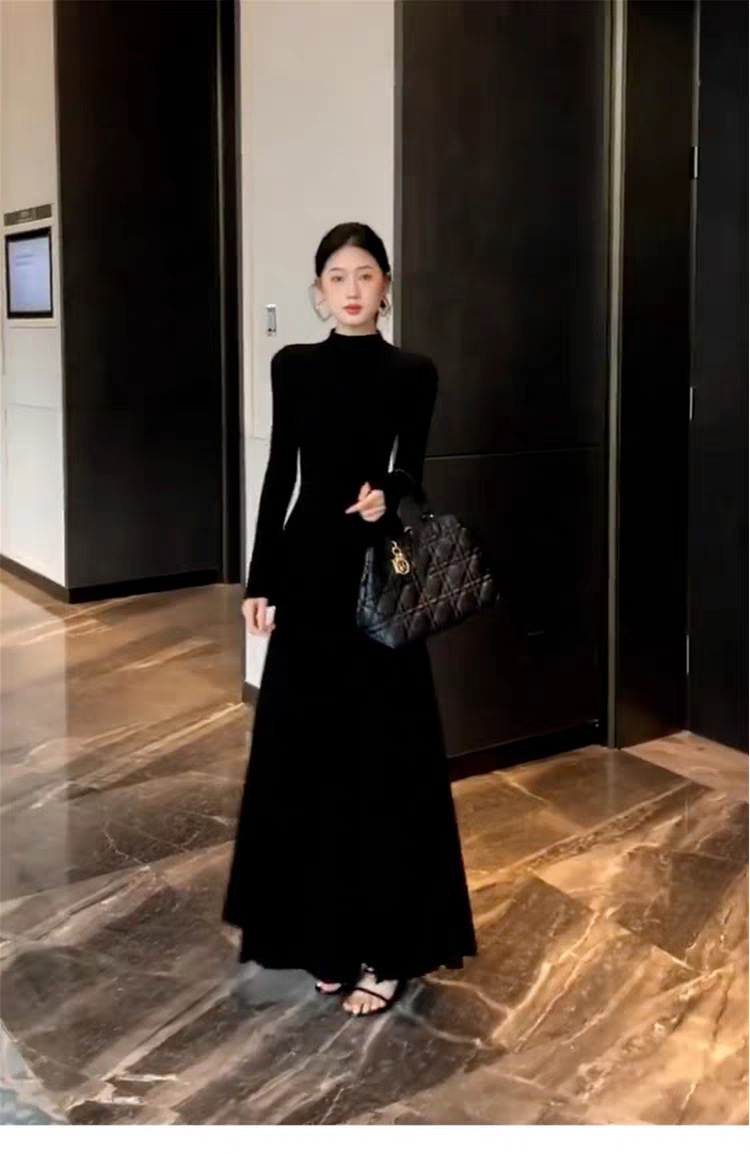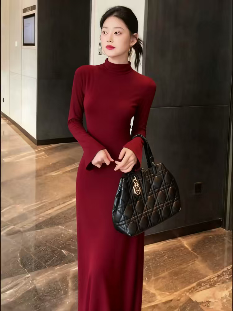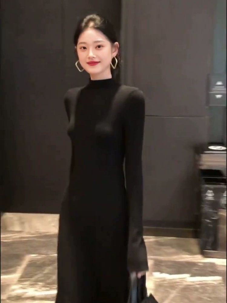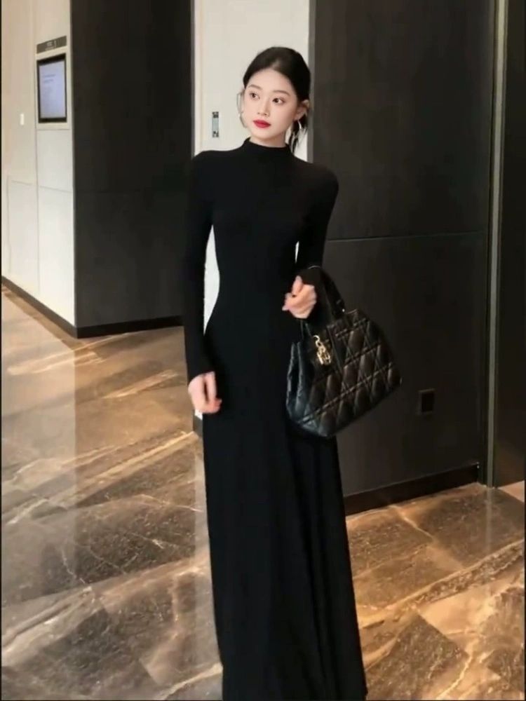 French high-end black long-sleeved dress 2025 autumn and winter new slim-fitting and thin semi-turtleneck bottomed knitted skirt