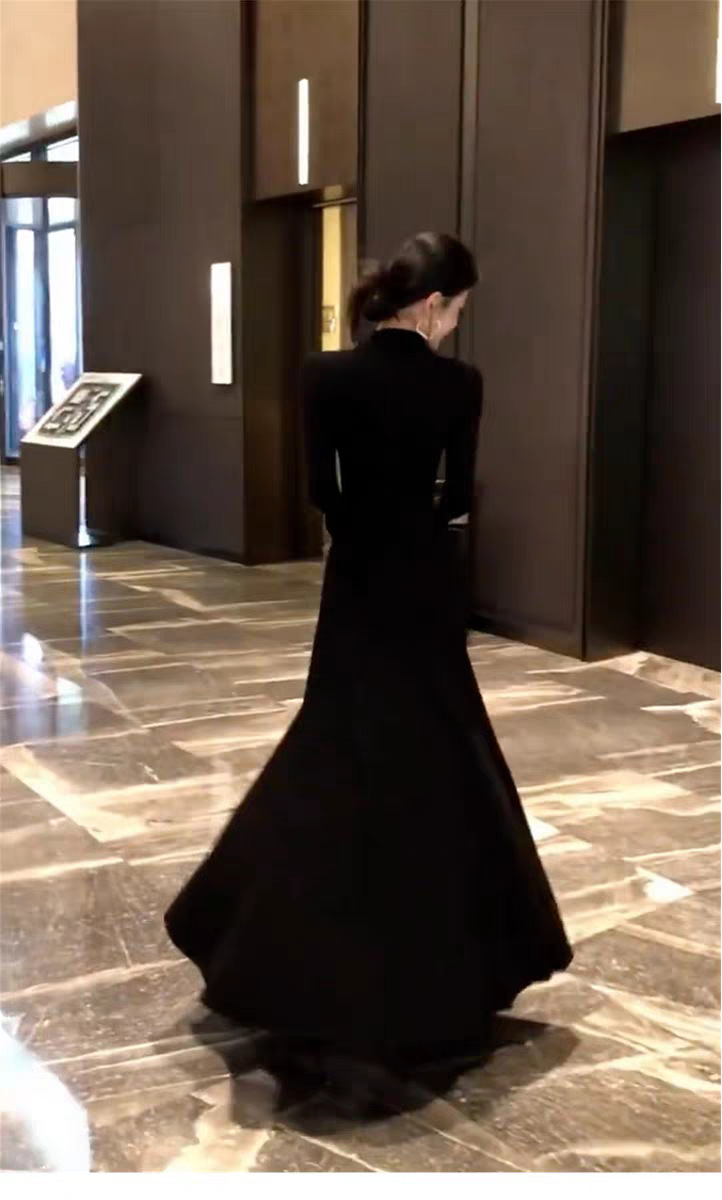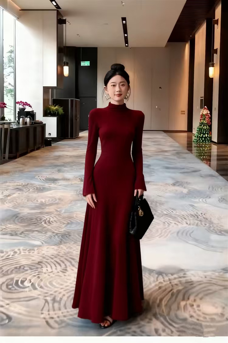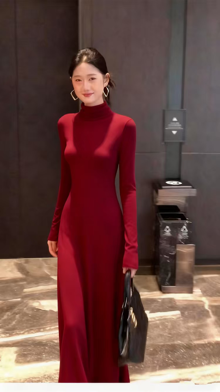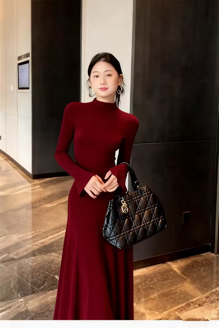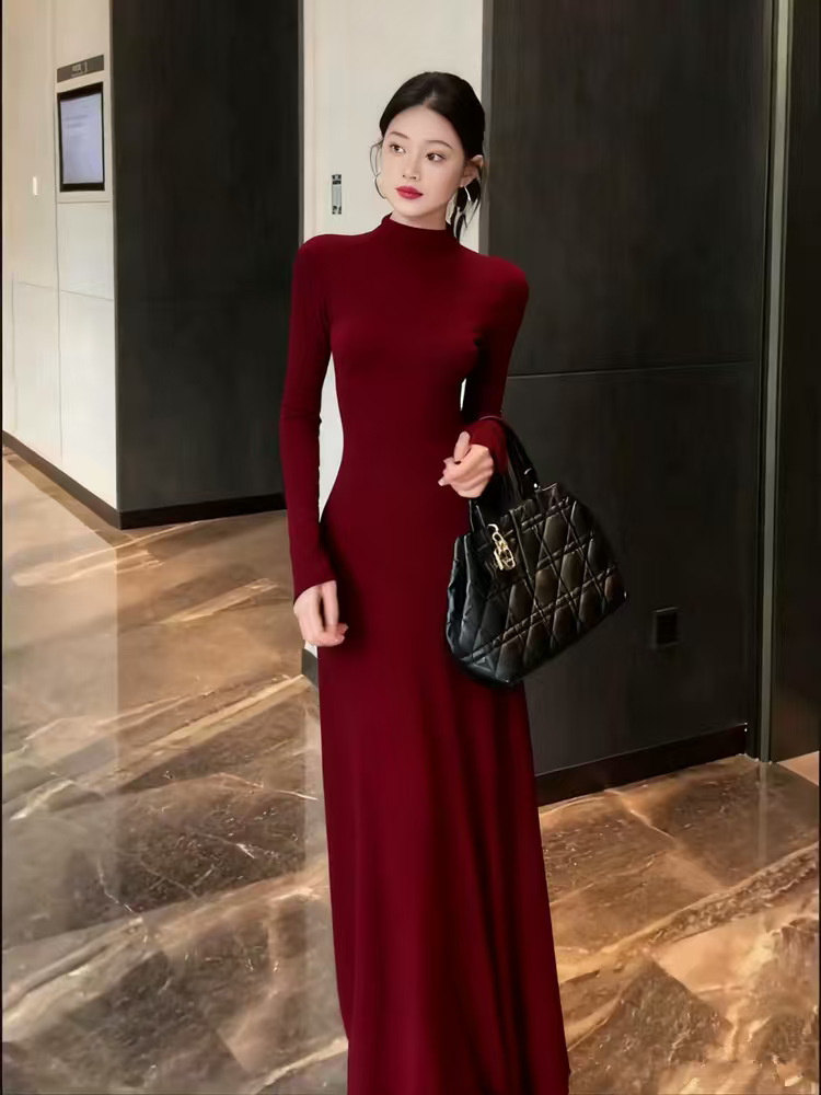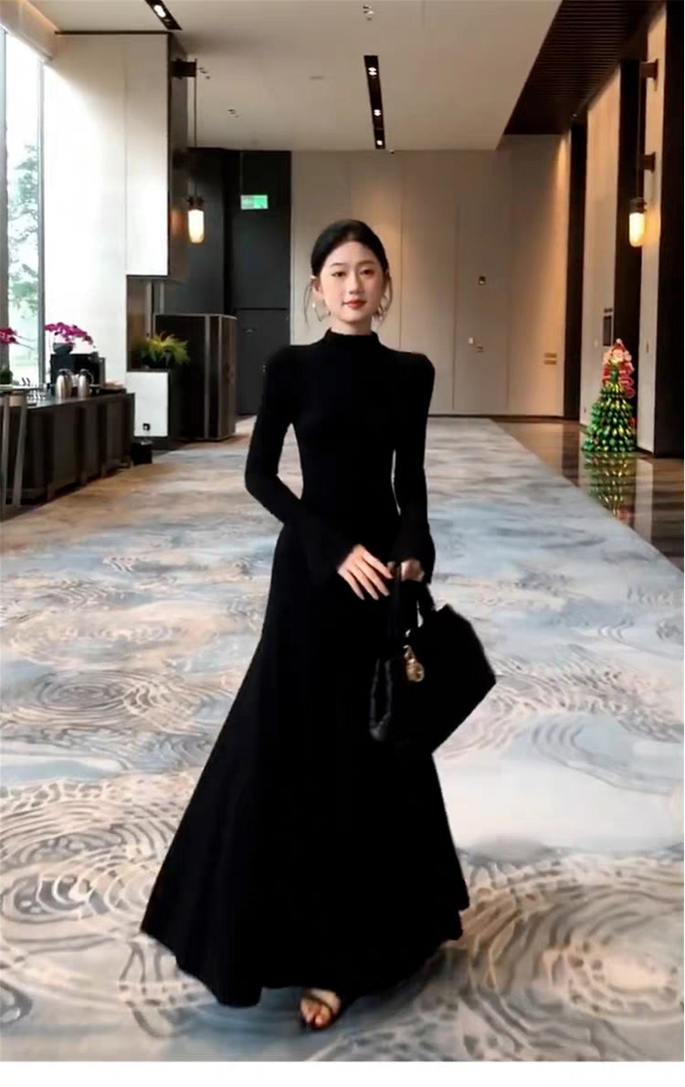 French high-end black long-sleeved dress 2025 autumn and winter new slim-fitting and thin semi-turtleneck bottomed knitted skirt
