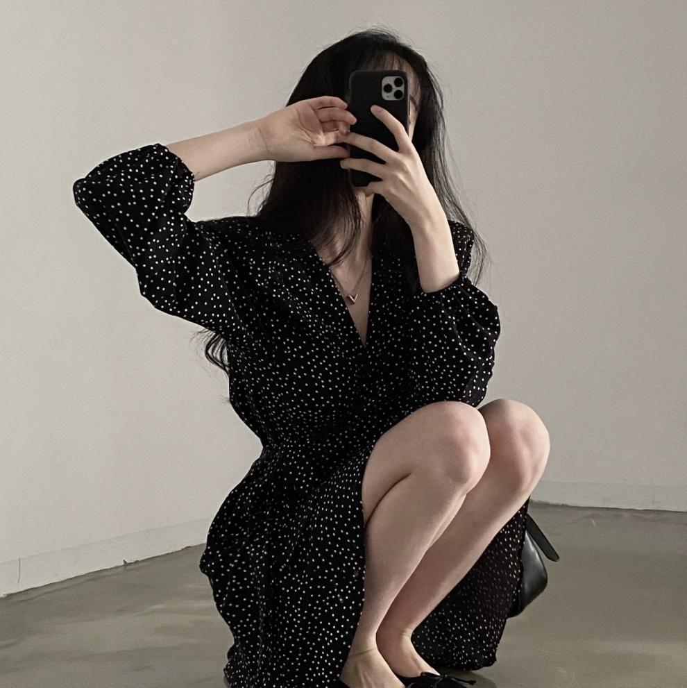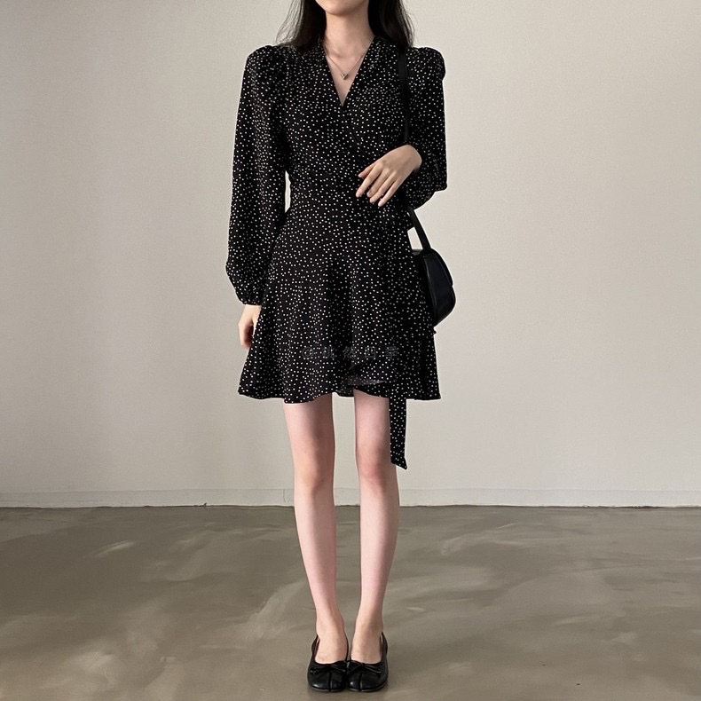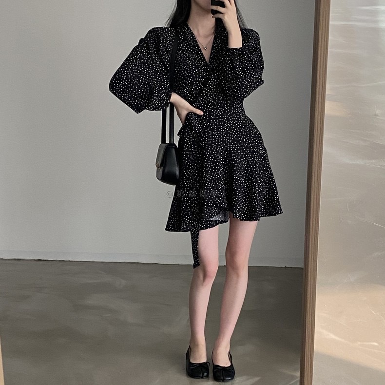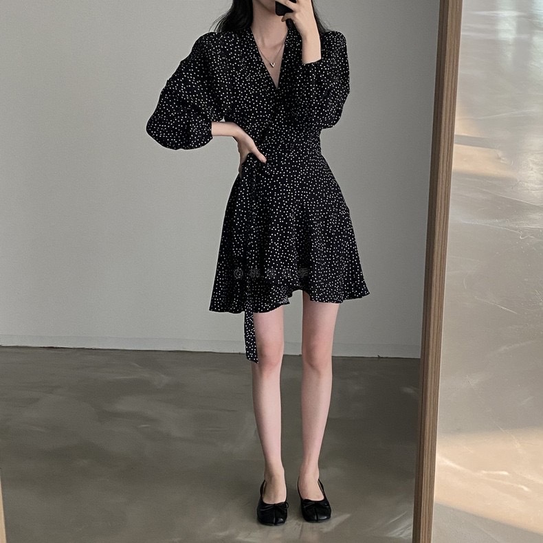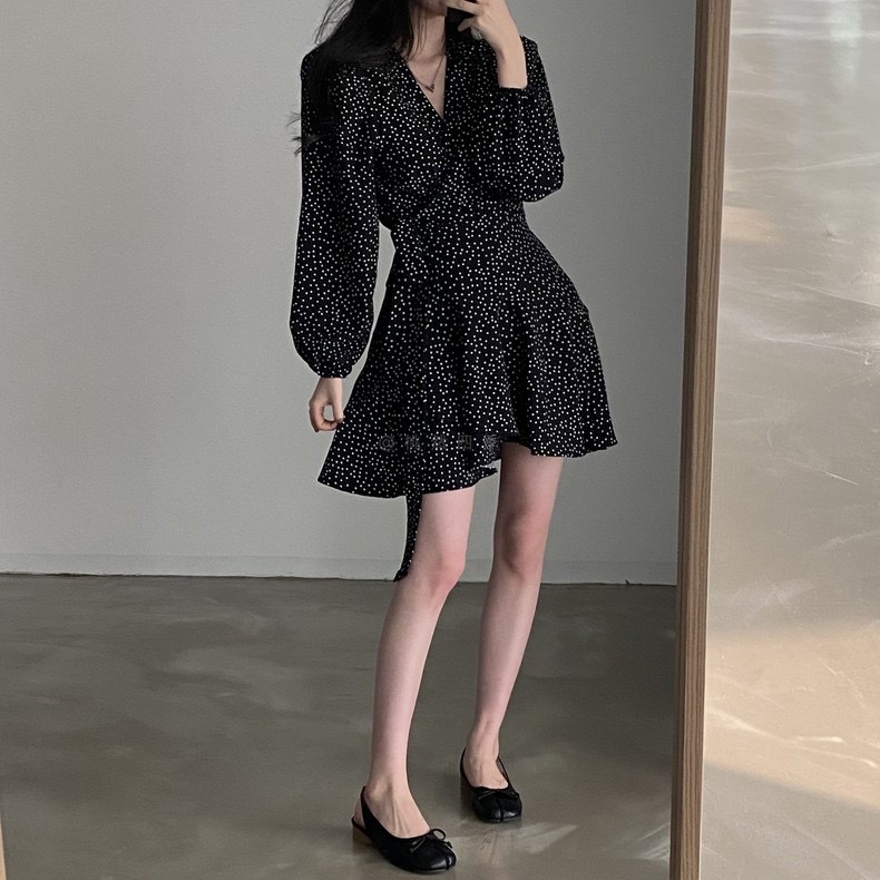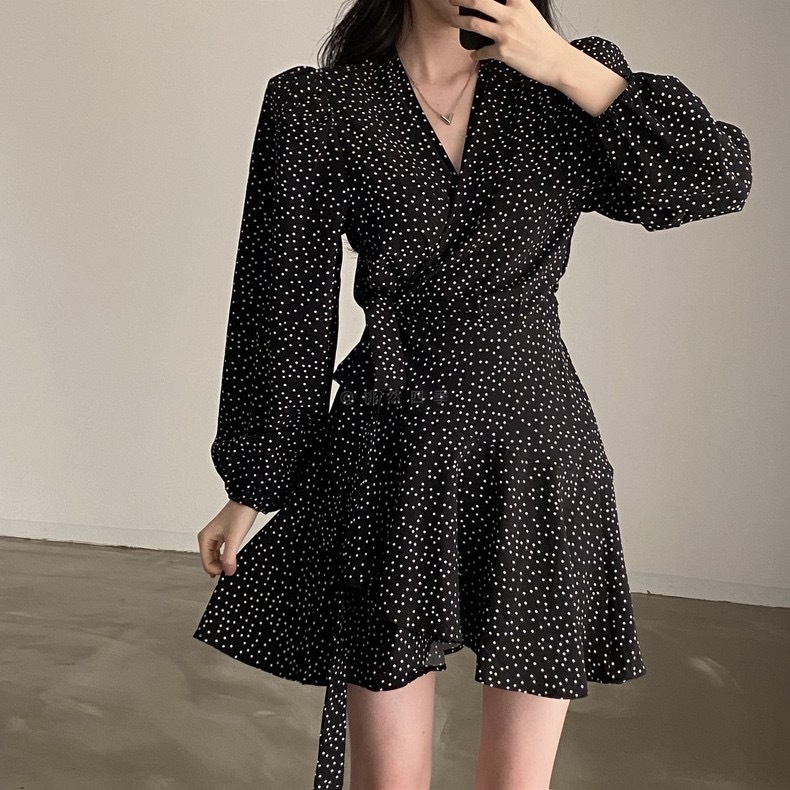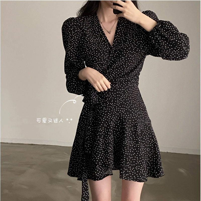 French polka dot V-neck long-sleeved dress, women's one-piece belt, spring and autumn suit, small short skirt