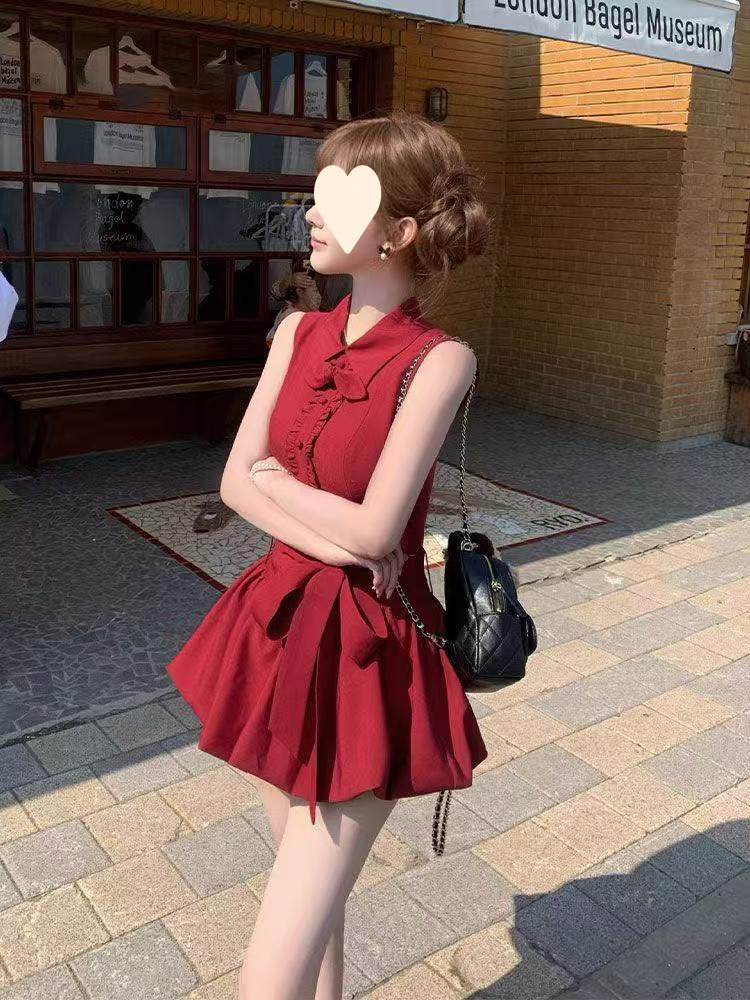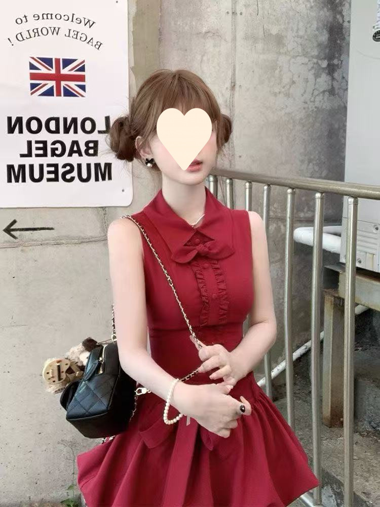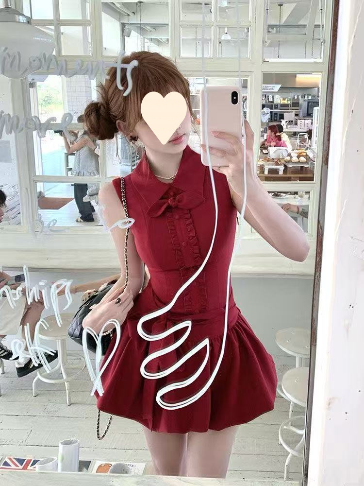 French small man, sweet temperament, high-end cherries, red rabbit ears, shirt collar, lace-up bud dress, women's summer