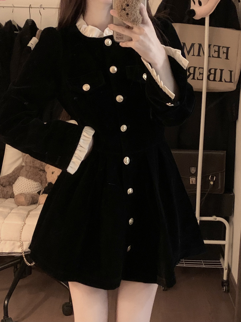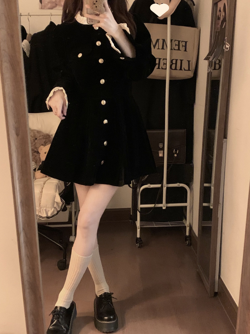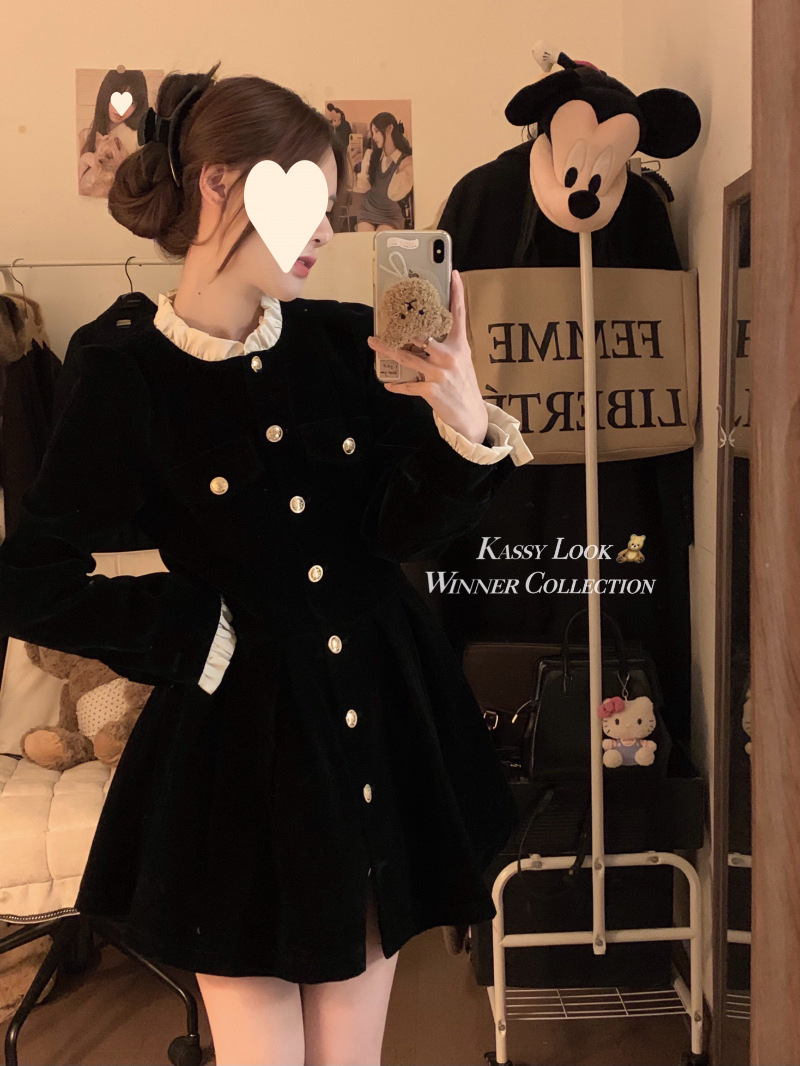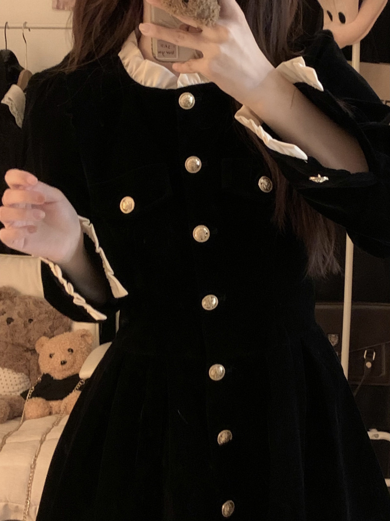 French velvet dress women's long-sleeved small black dress 2025 autumn and winter new single-breasted design waist and thin temperament