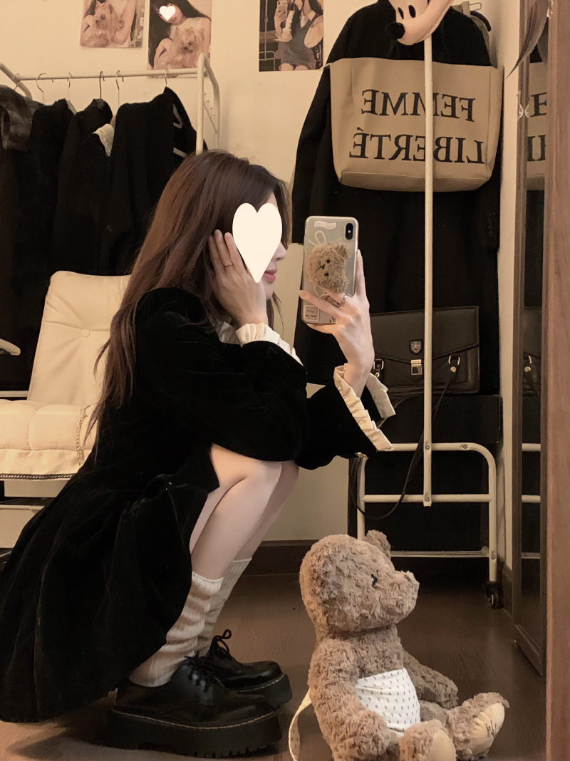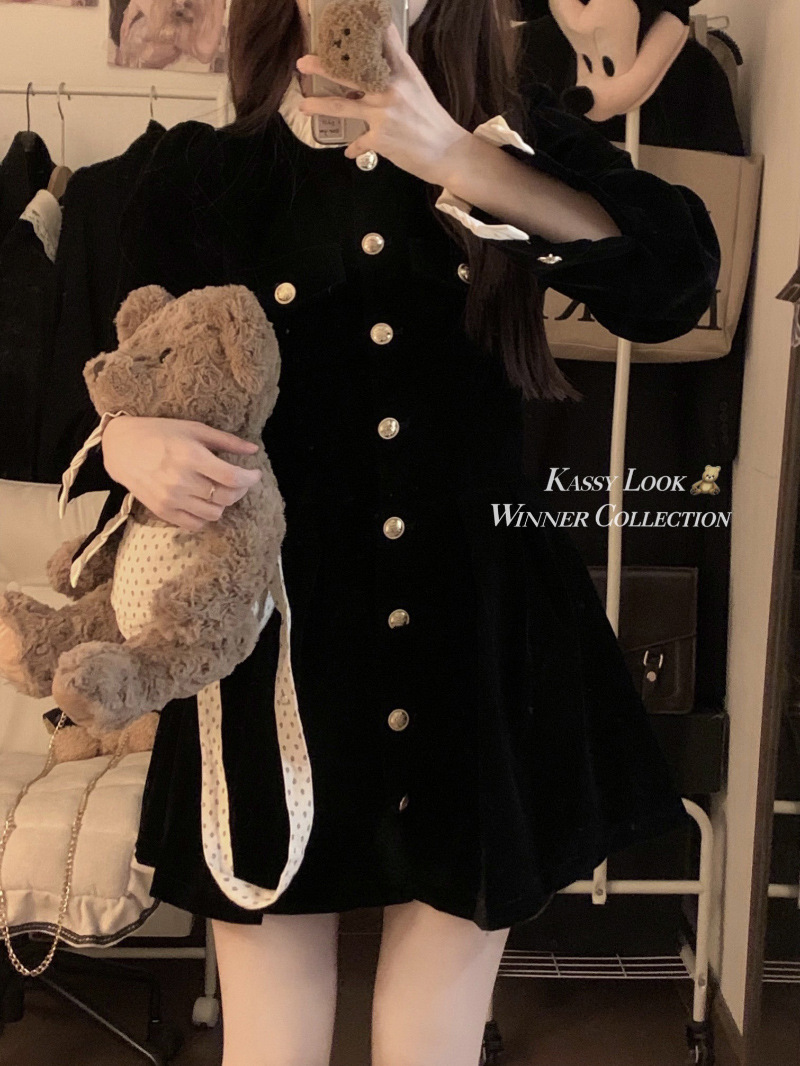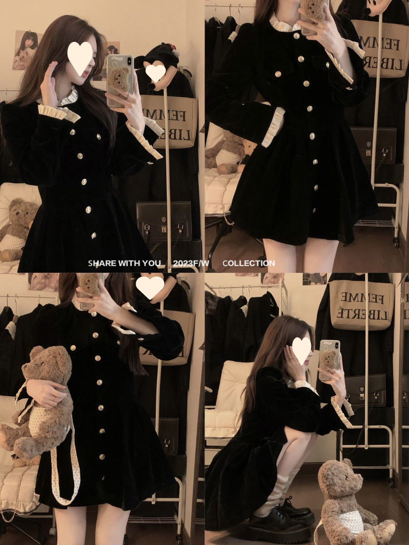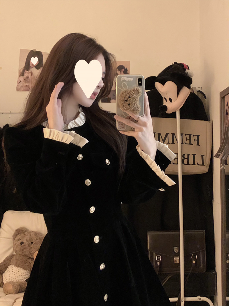 French velvet dress women's long-sleeved small black dress 2025 autumn and winter new single-breasted design waist and thin temperament