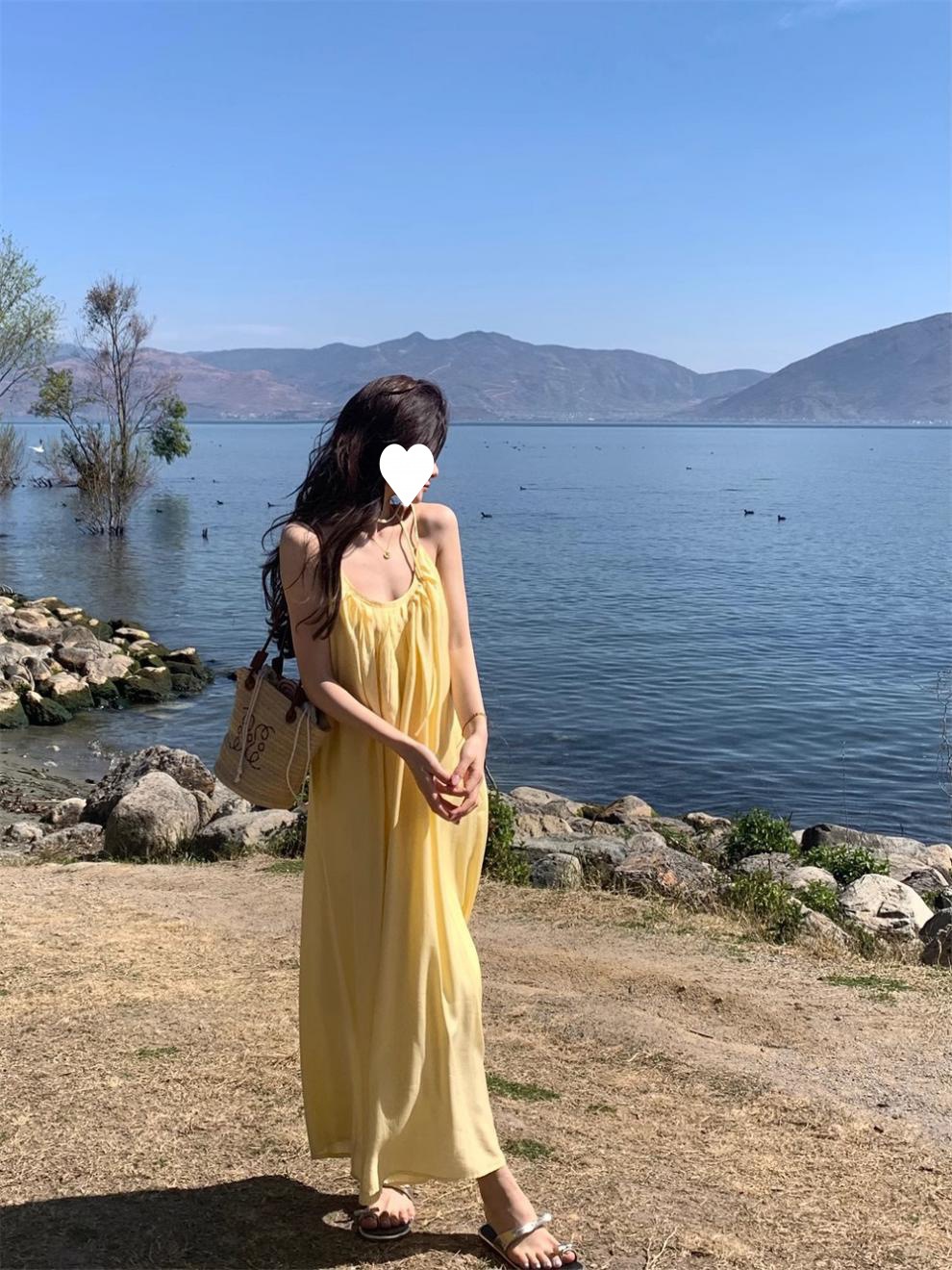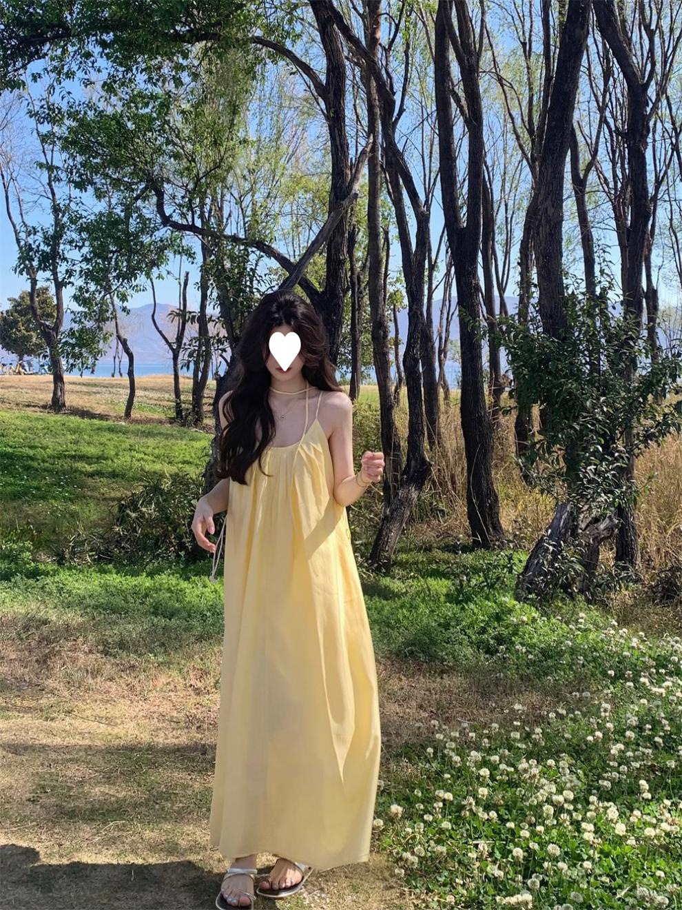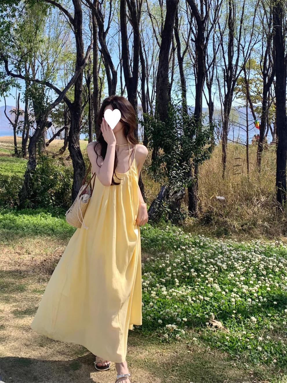French yellow suspender dress women's clothing summer seaside vacation style wear skirt loose A-shaped skirt long skirt