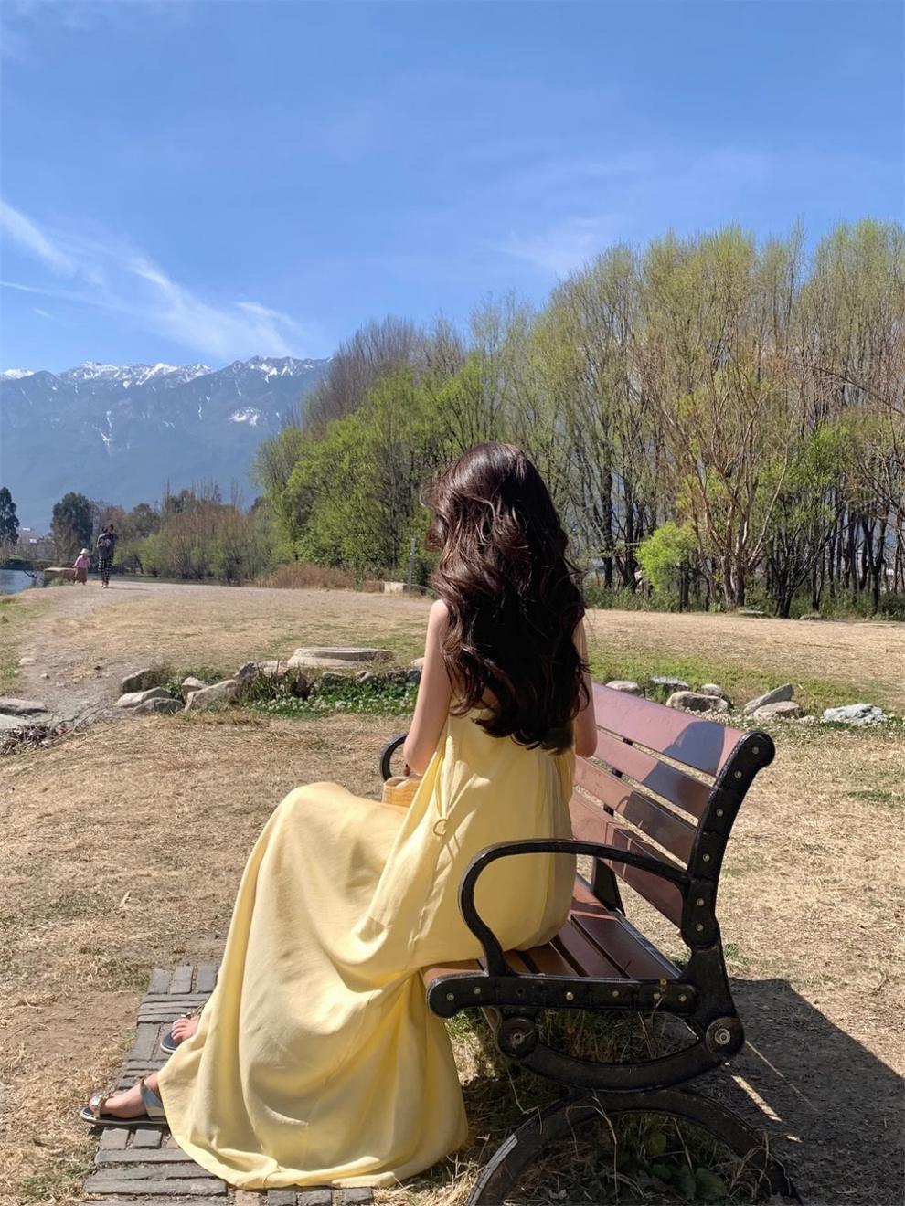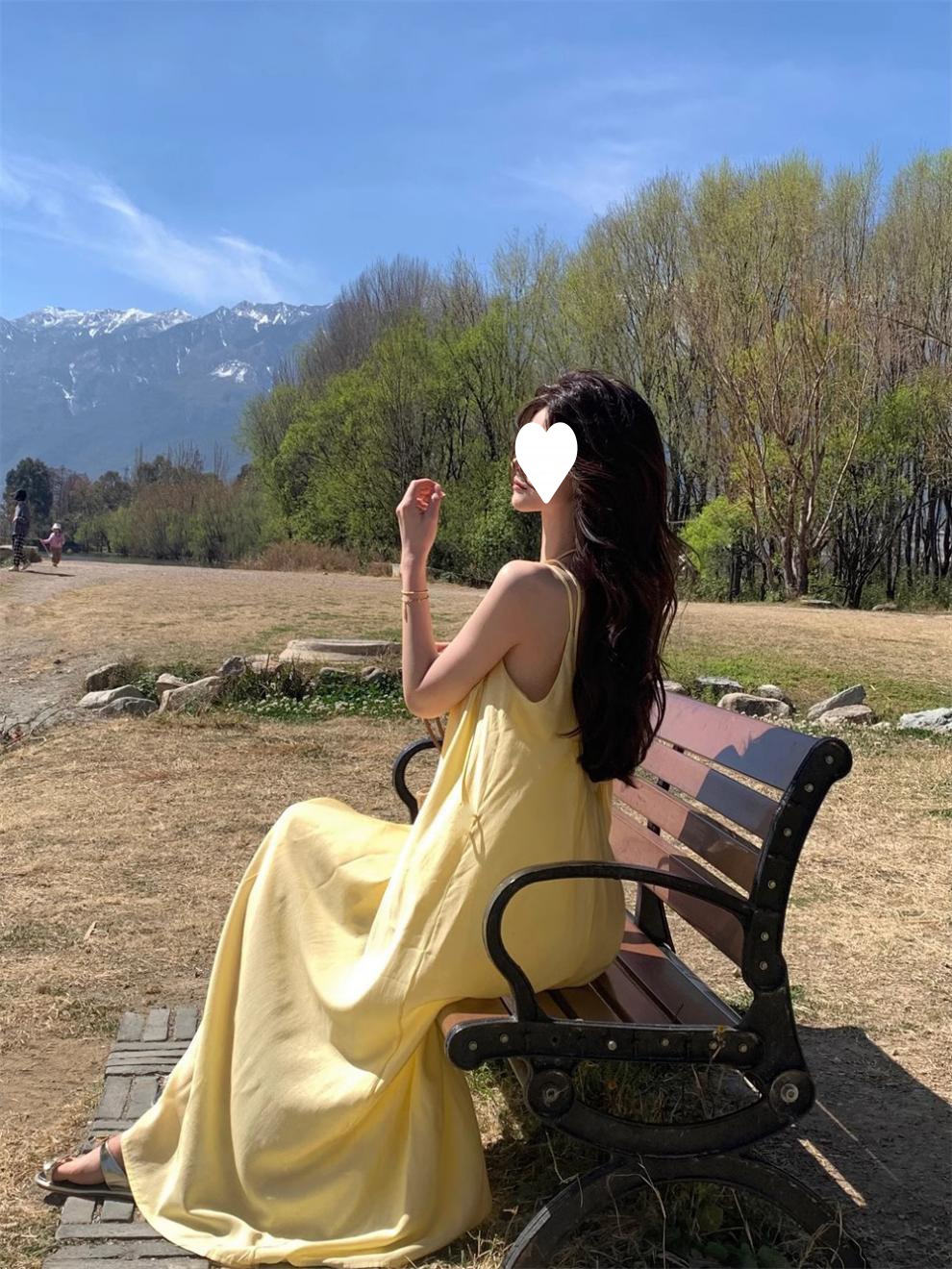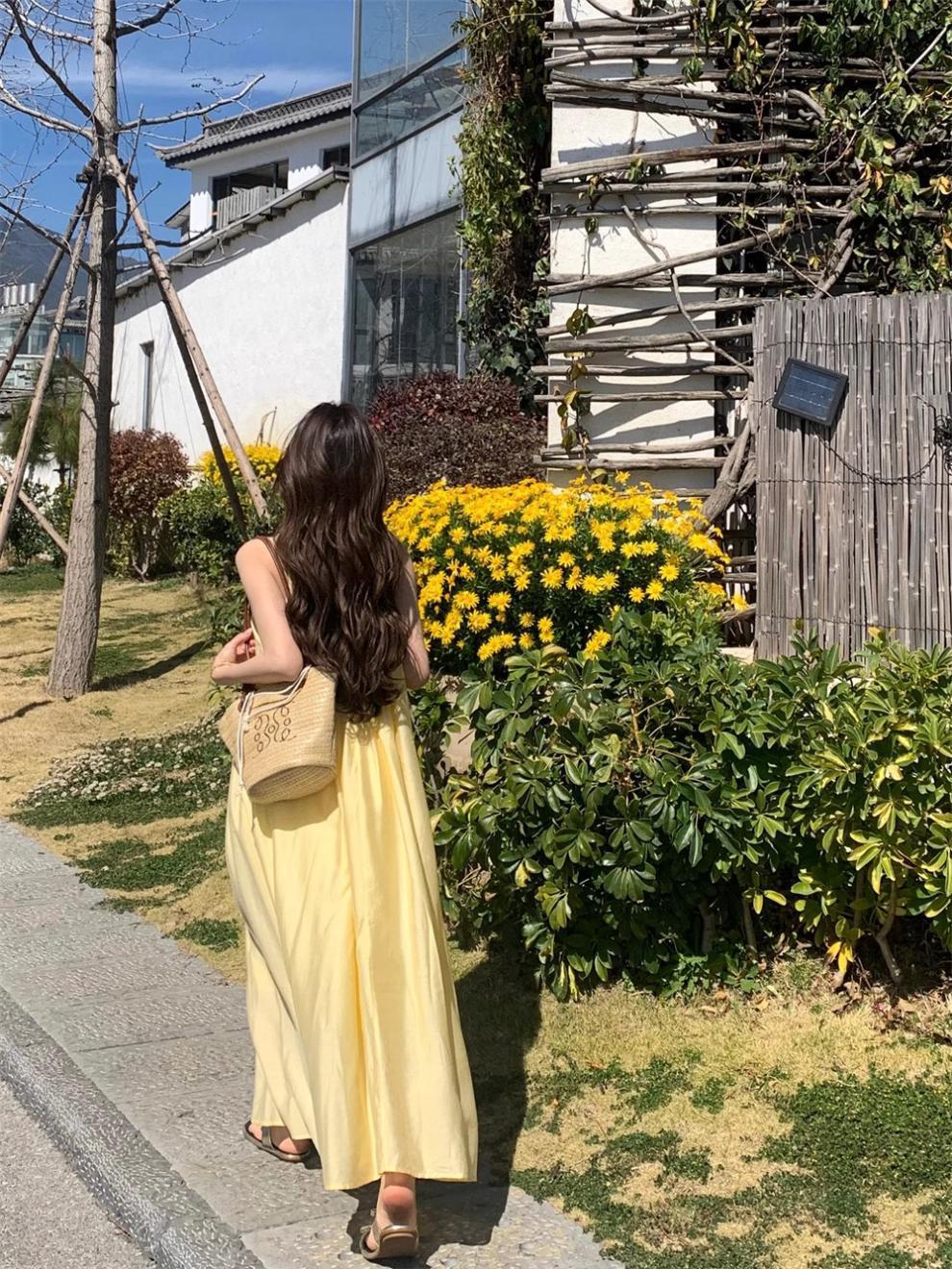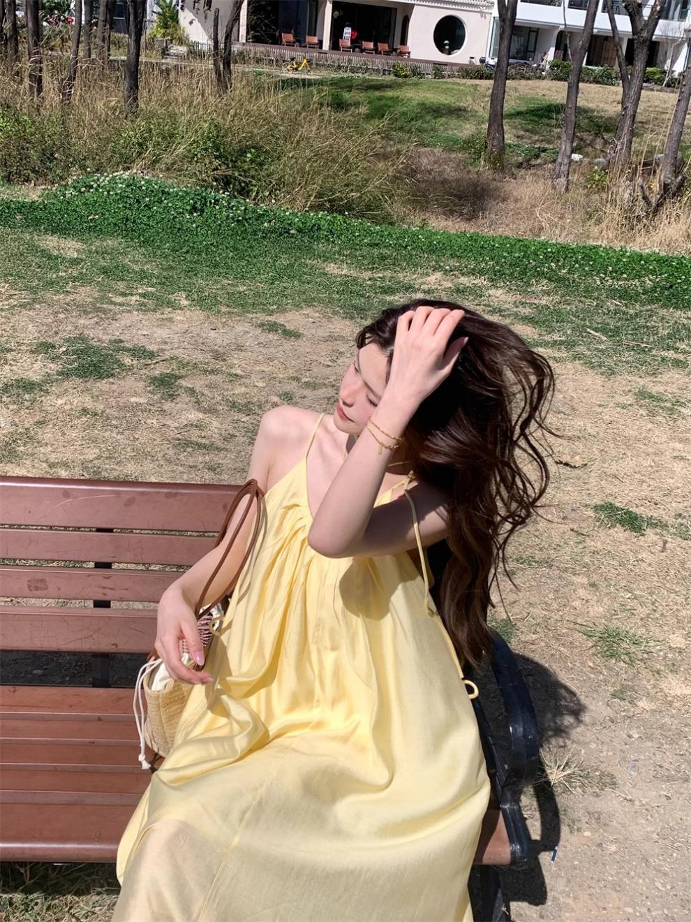 French yellow suspender dress women's clothing summer seaside vacation style wear skirt loose A-shaped skirt long skirt
