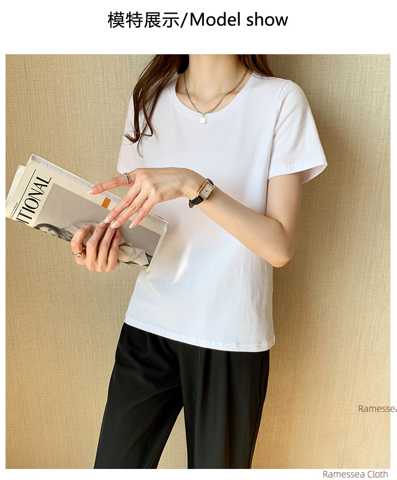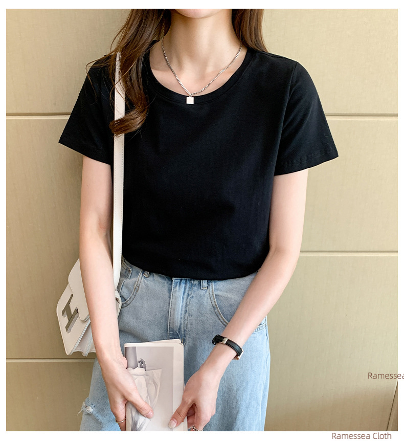 Front Shoulder Short Sleeve Grey T-Shirt Women's Summer Cotton Women's Top Loose Senior Skinny T-Shirt with Crew Neck