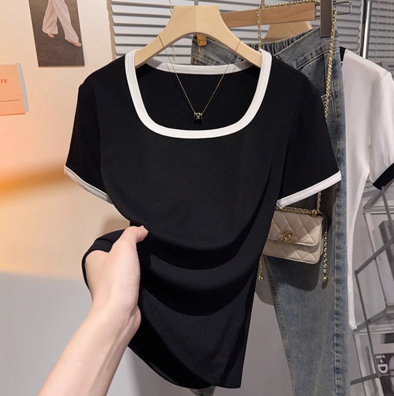 Front shoulder square collar contrasting color splicing slim-fitting white short-sleeved T-shirt Spice Girls niche chic ice silk top bottoming shirt