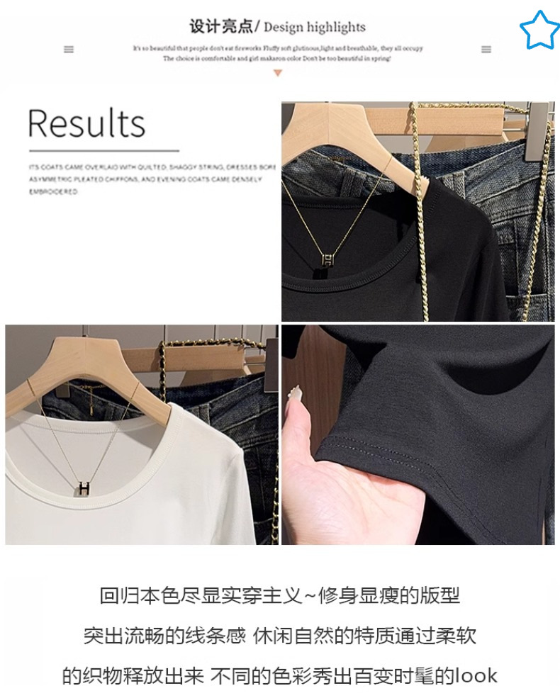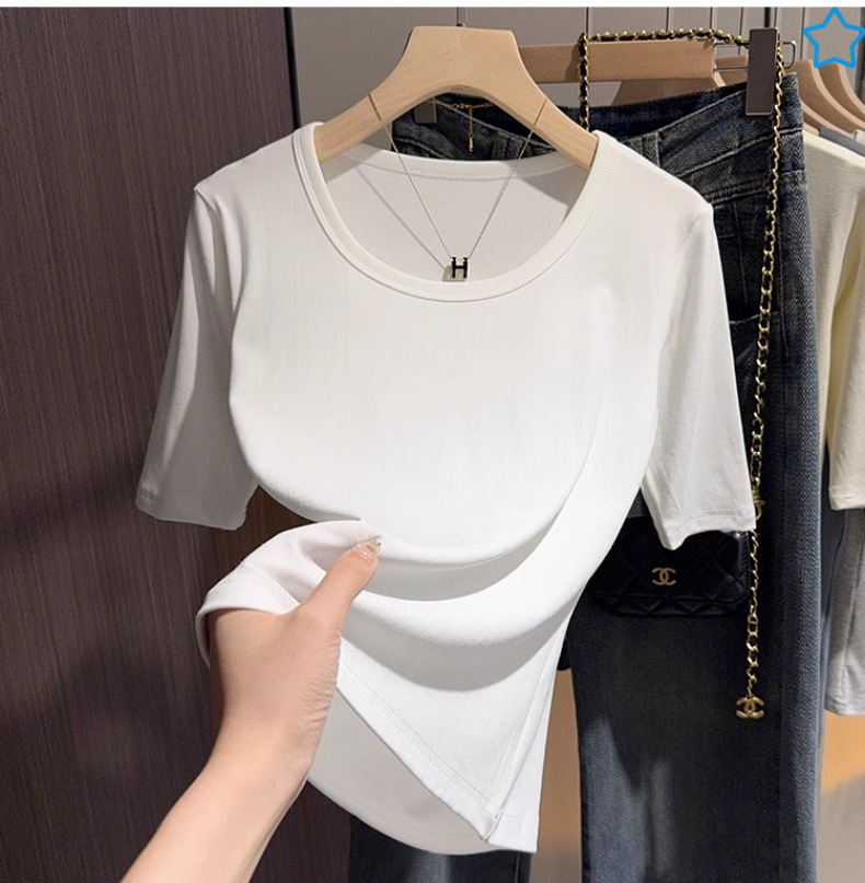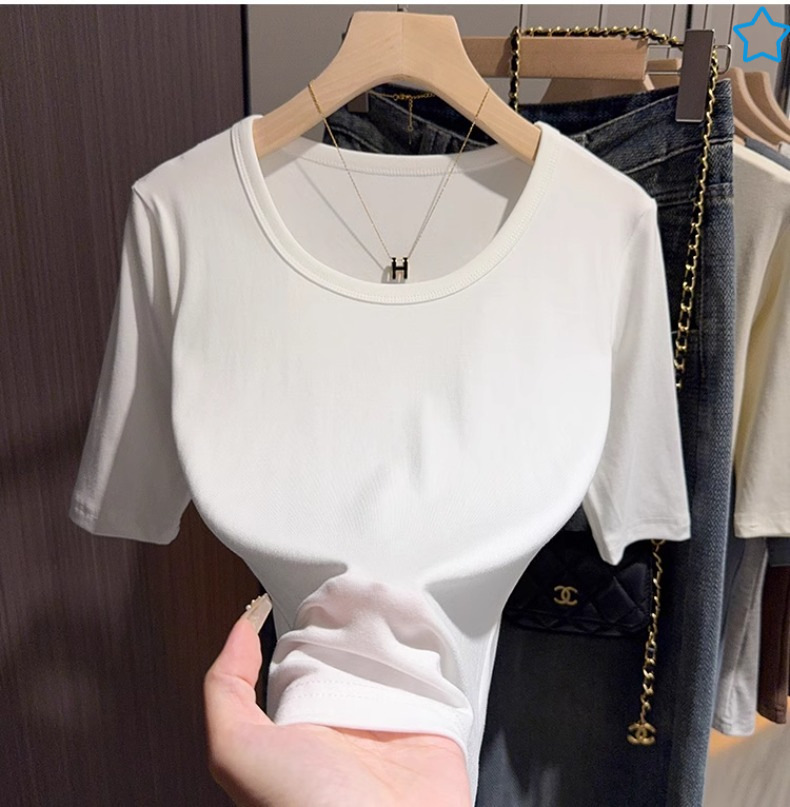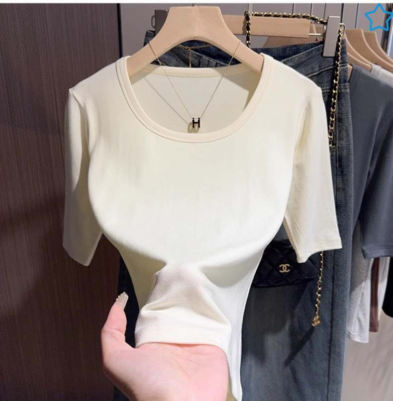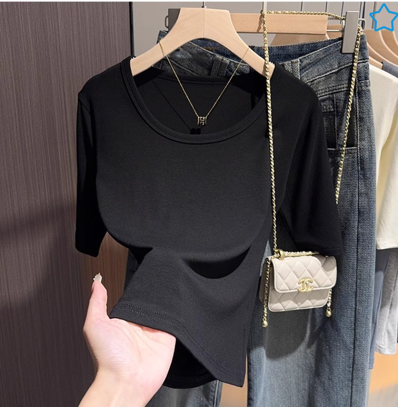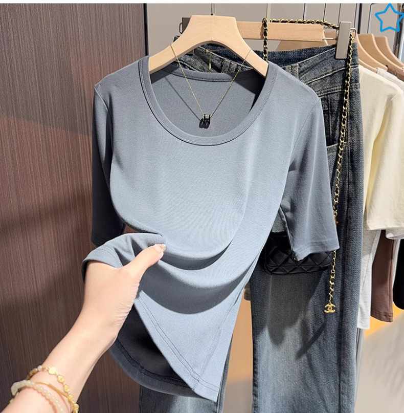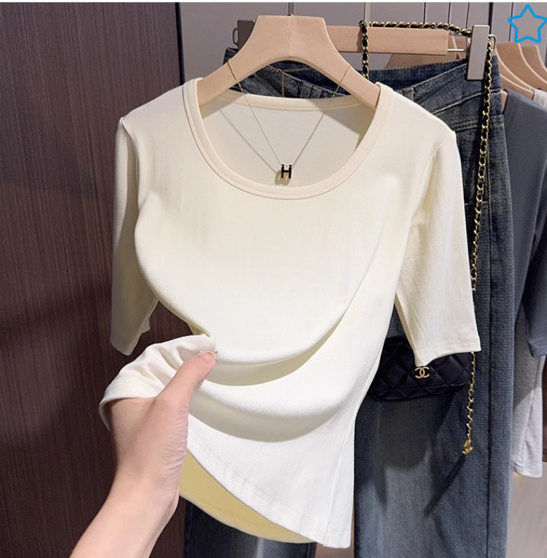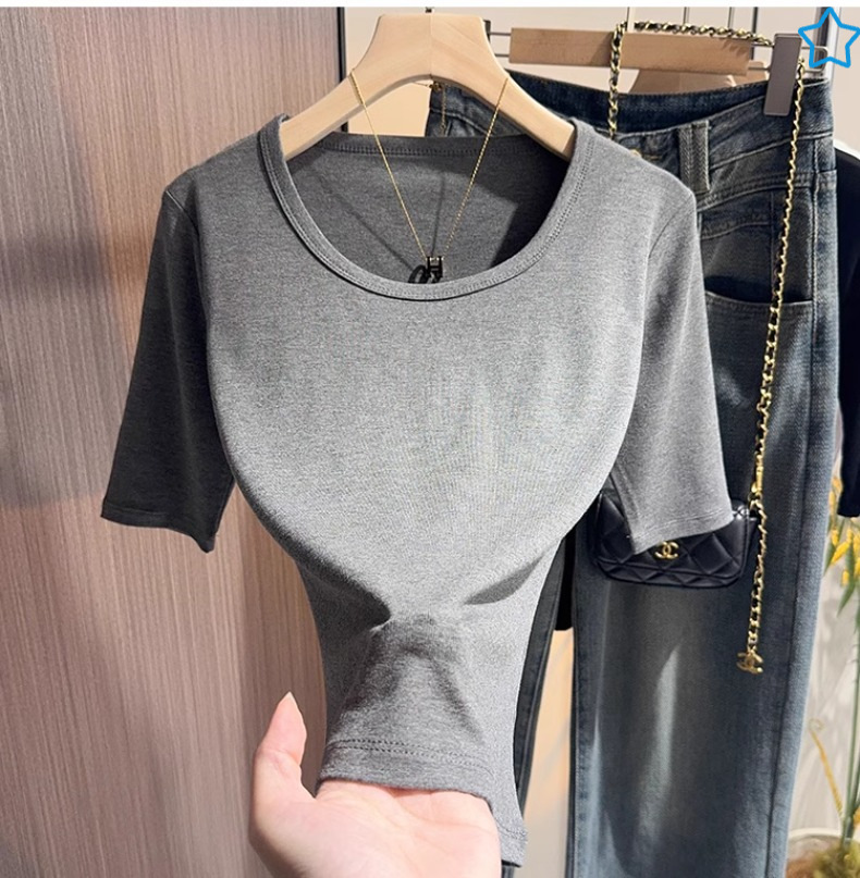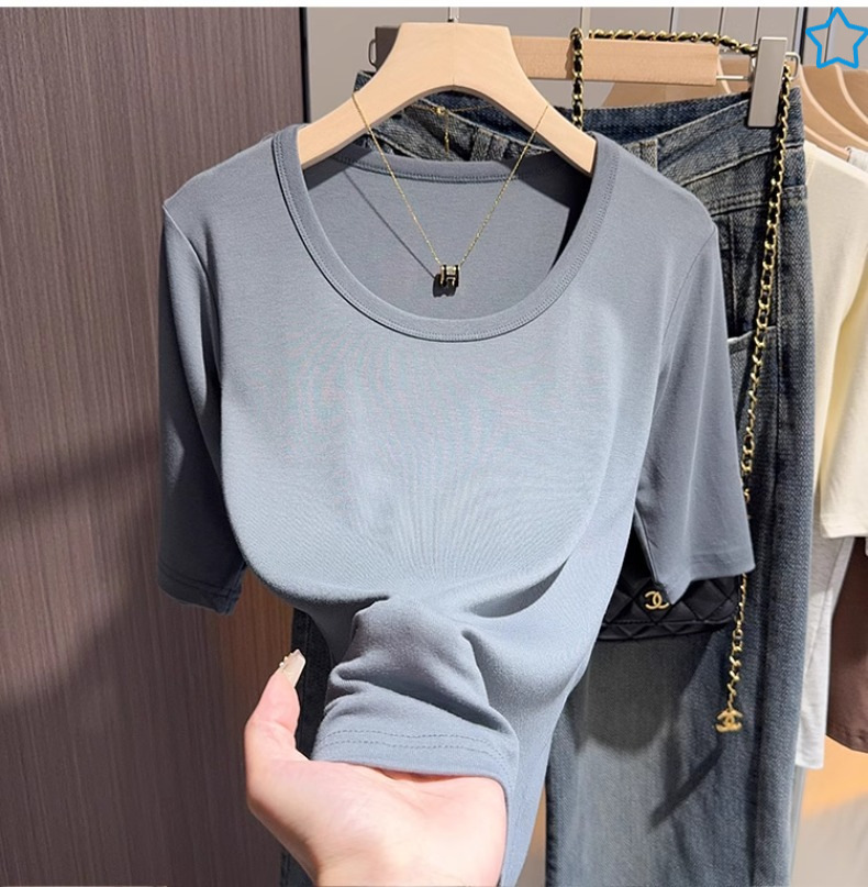 Gray knitted five-quarter-sleeved bottoming shirt T-shirt women's spring versatile half-sleeved U-neck medium-sleeved crew-neck top shirt