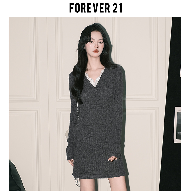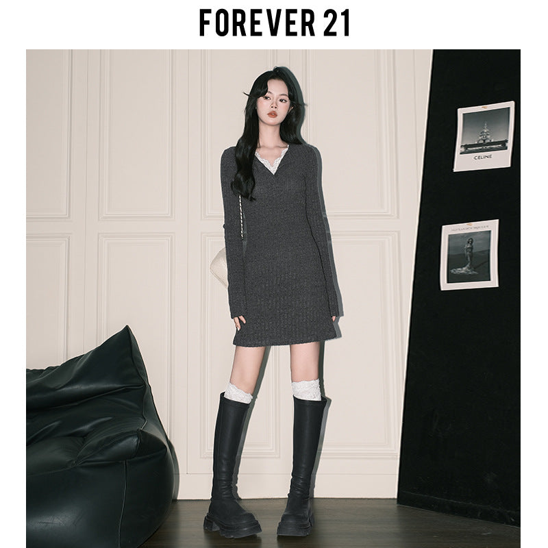 Gray's grey slim-fit knitted hip-wrapped skirt women's pure lace V-neck bottoming dress