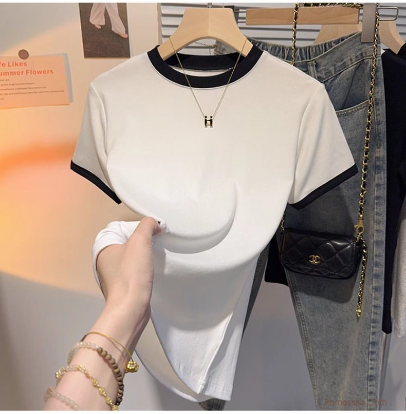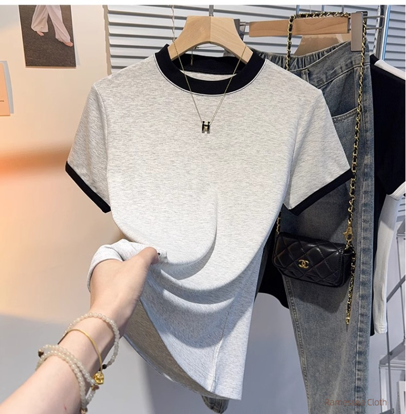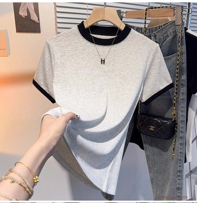 Grey small stand-up collar bottoming shirt for women's inner wear 2025 summer new high-end versatile top contrasting color short-sleeved T-shirt