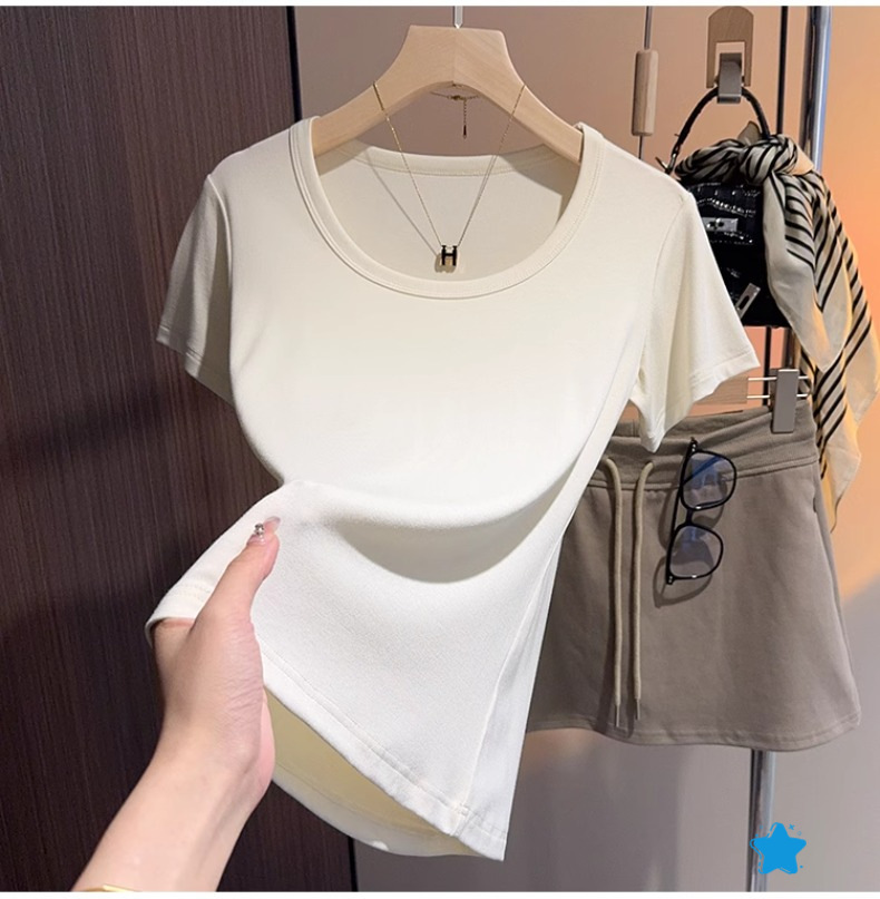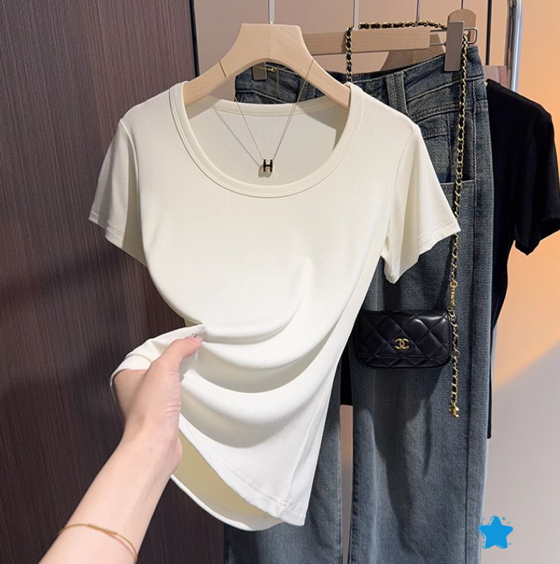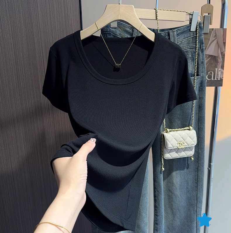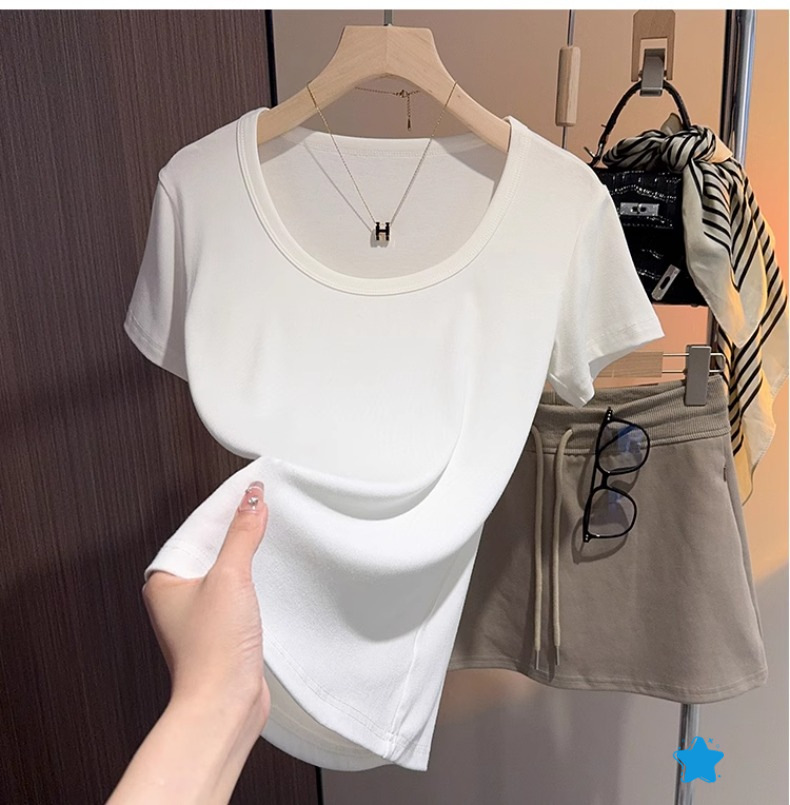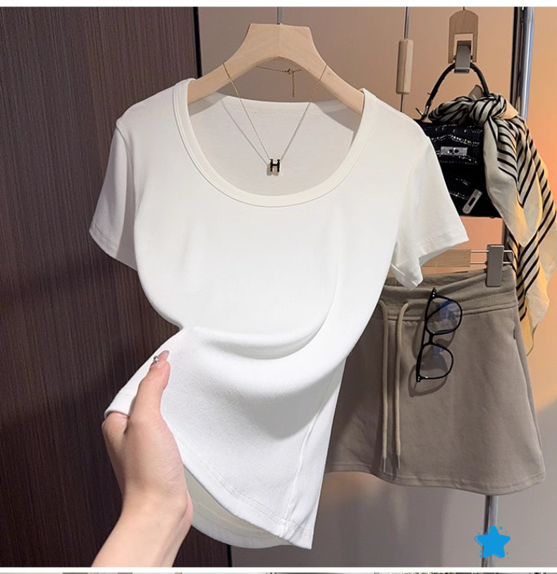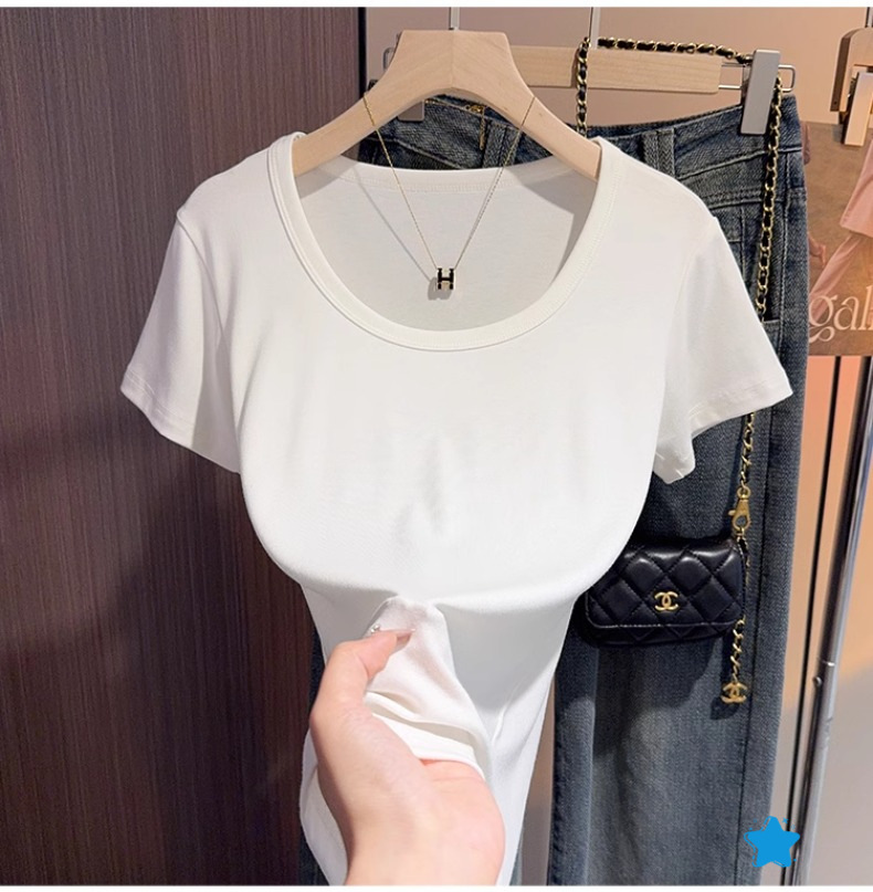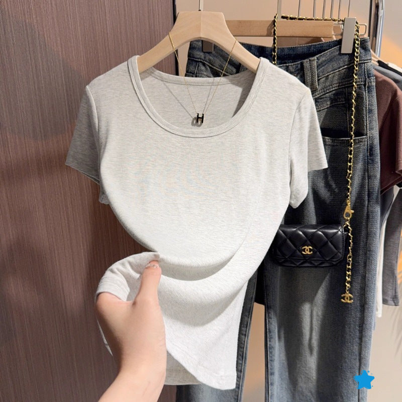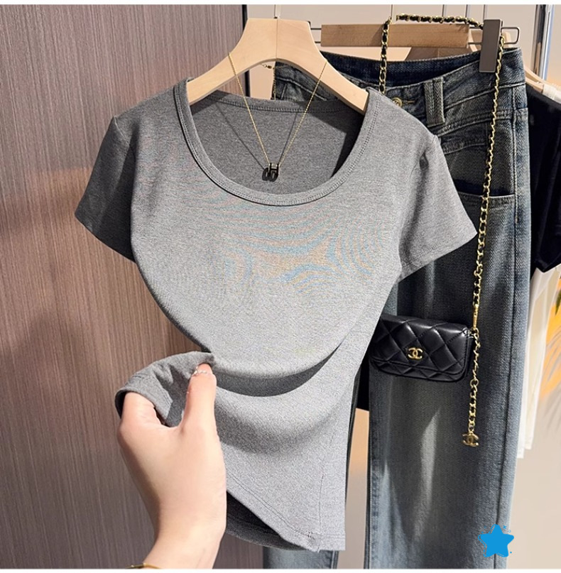 Grey u-neck short-sleeved t-shirt women's summer front shoulder Korean version versatile tight round neck inner bottoming shirt slim top