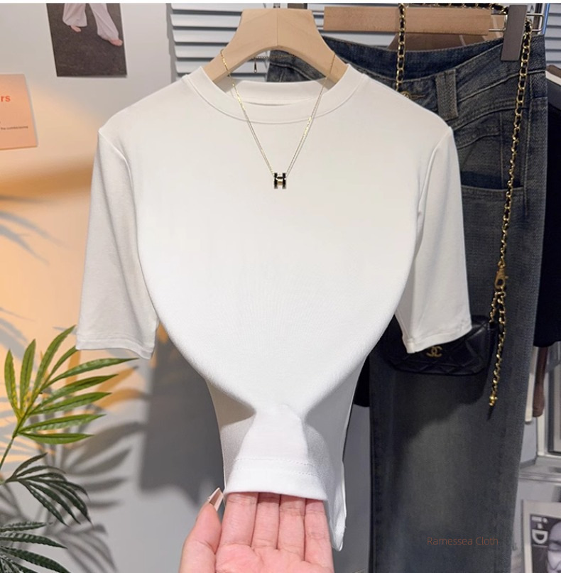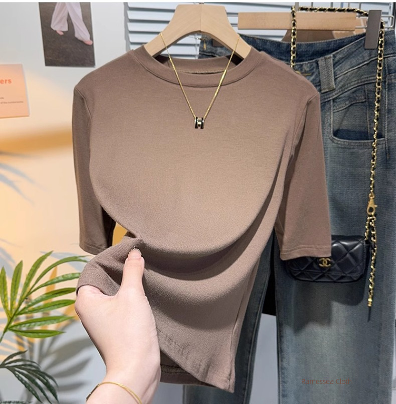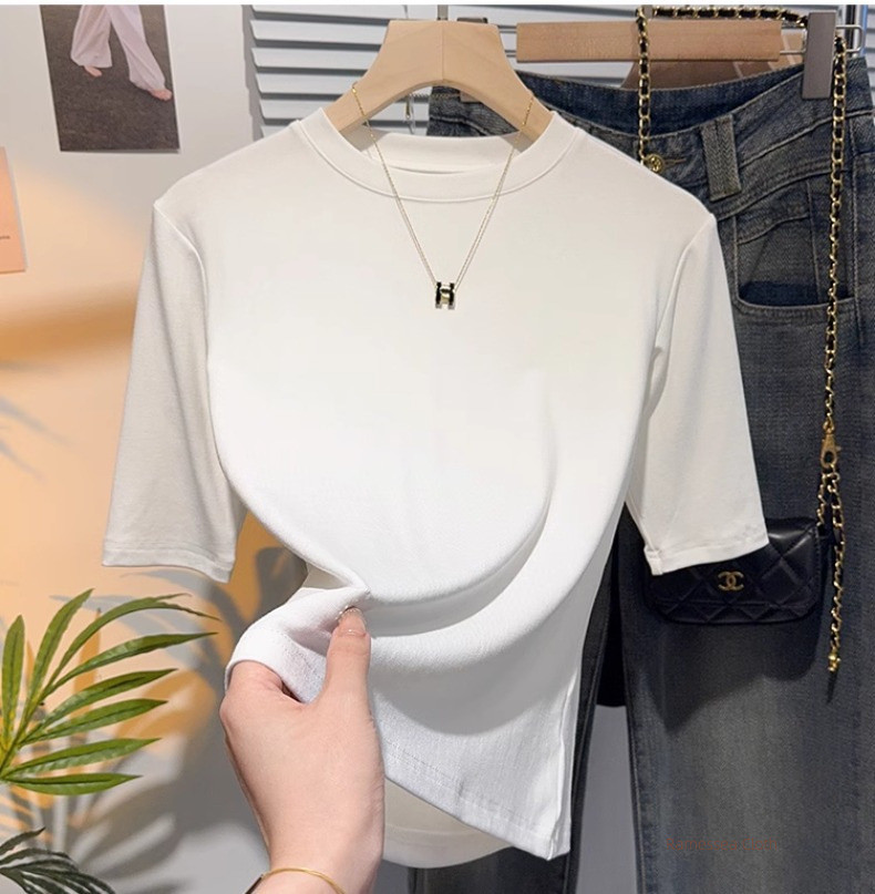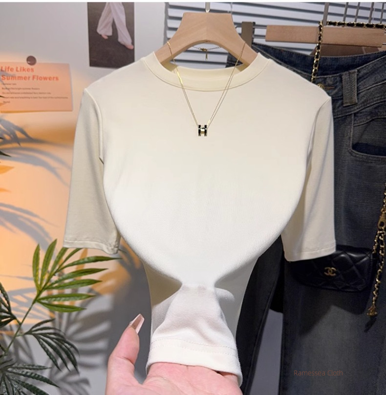 Half-sleeved T-shirt, women's five-quarter-sleeved apricot small stand-up collar, medium-sleeved top, bottoming shirt, spring and autumn Korean version, thin and advanced