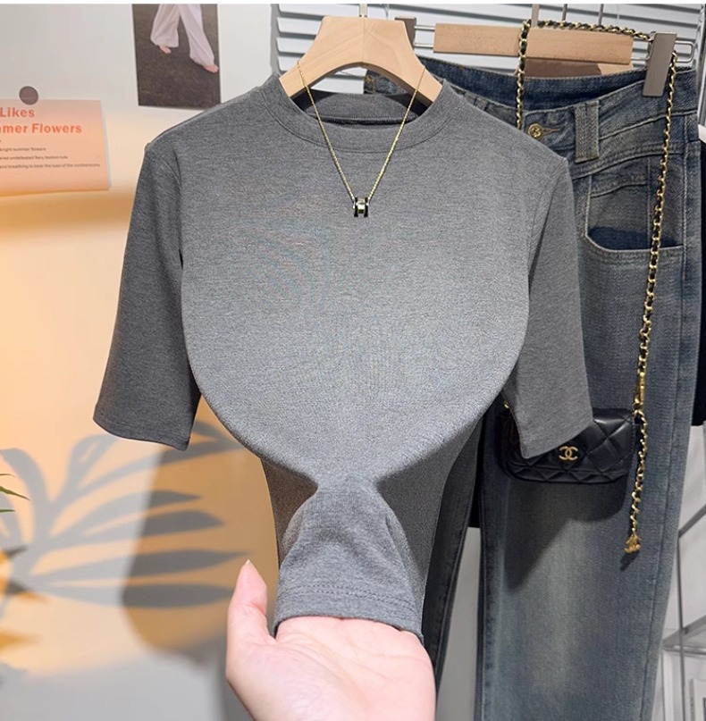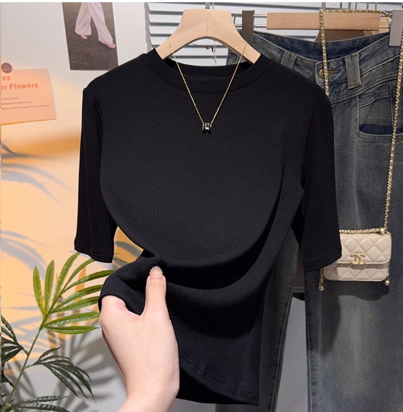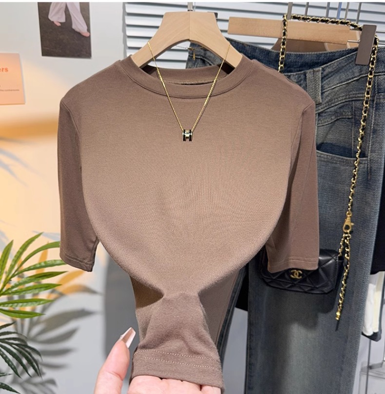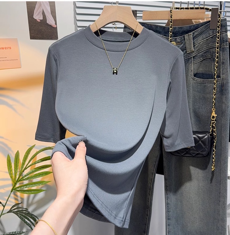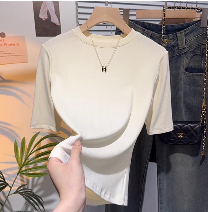 Half-sleeved T-shirt women's five-quarter-sleeved white small stand-up collar medium-sleeved top bottoming shirt spring and autumn 2025 new high-end sense