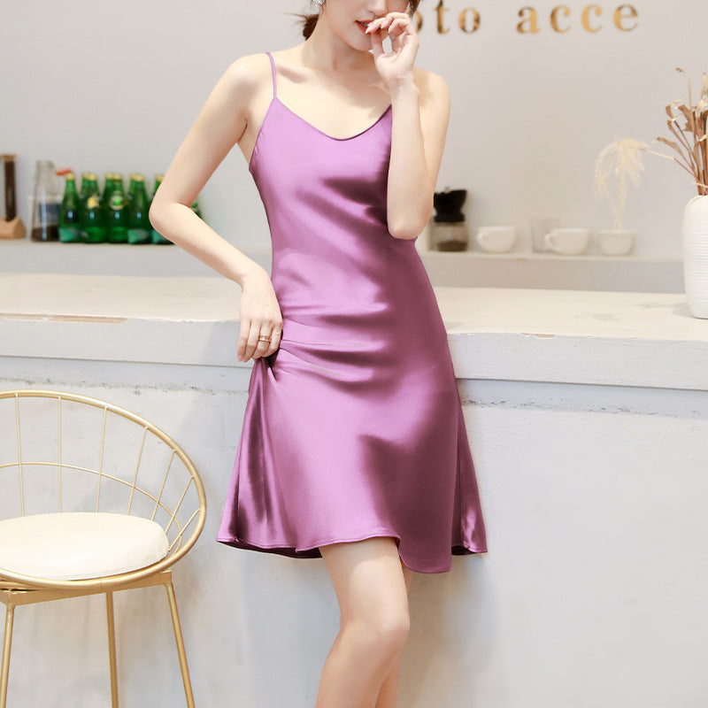 Haute couture acetic acid satin dress high-end suspender V-neck skirt temperament small man thin silky outer dress