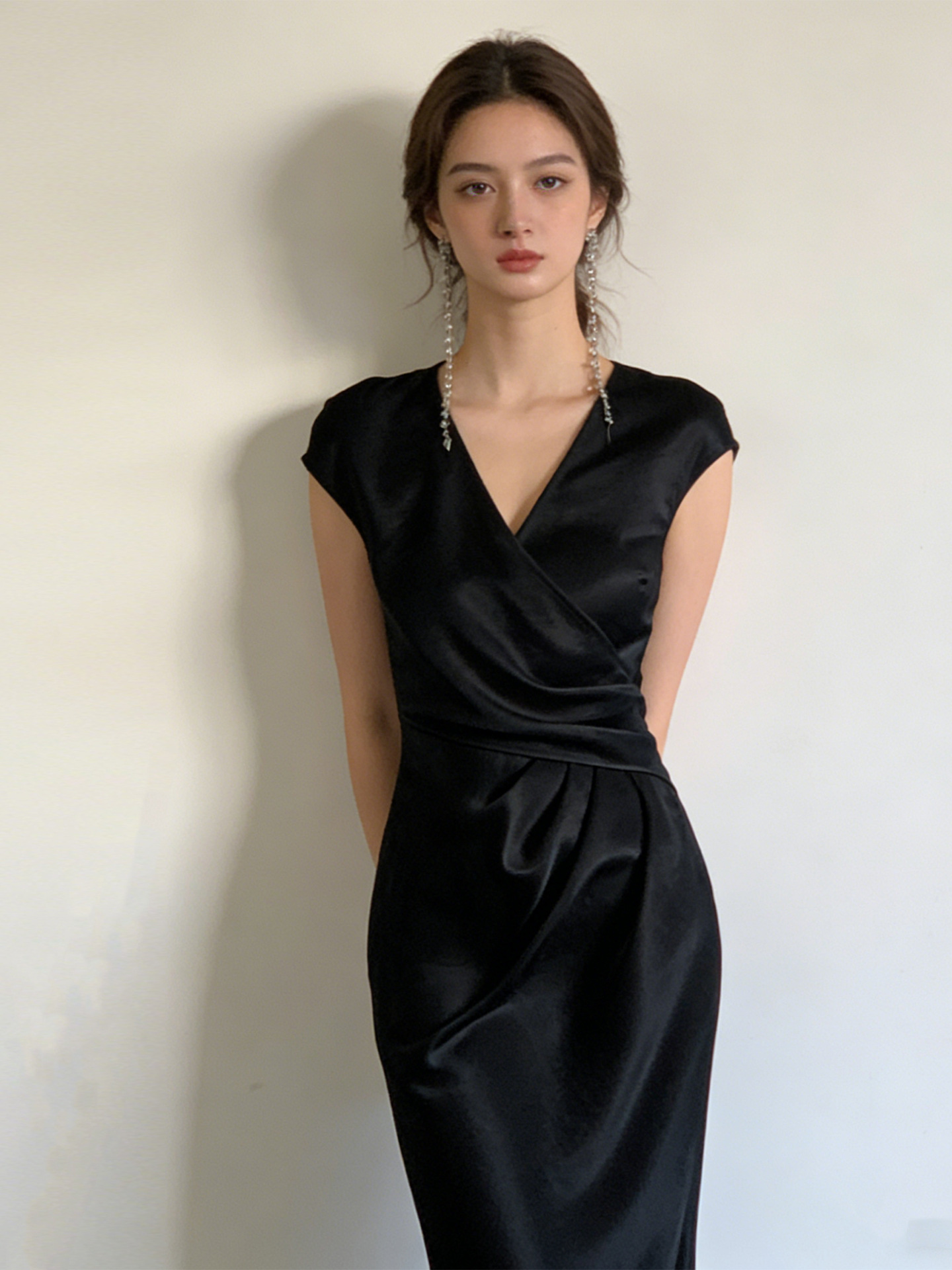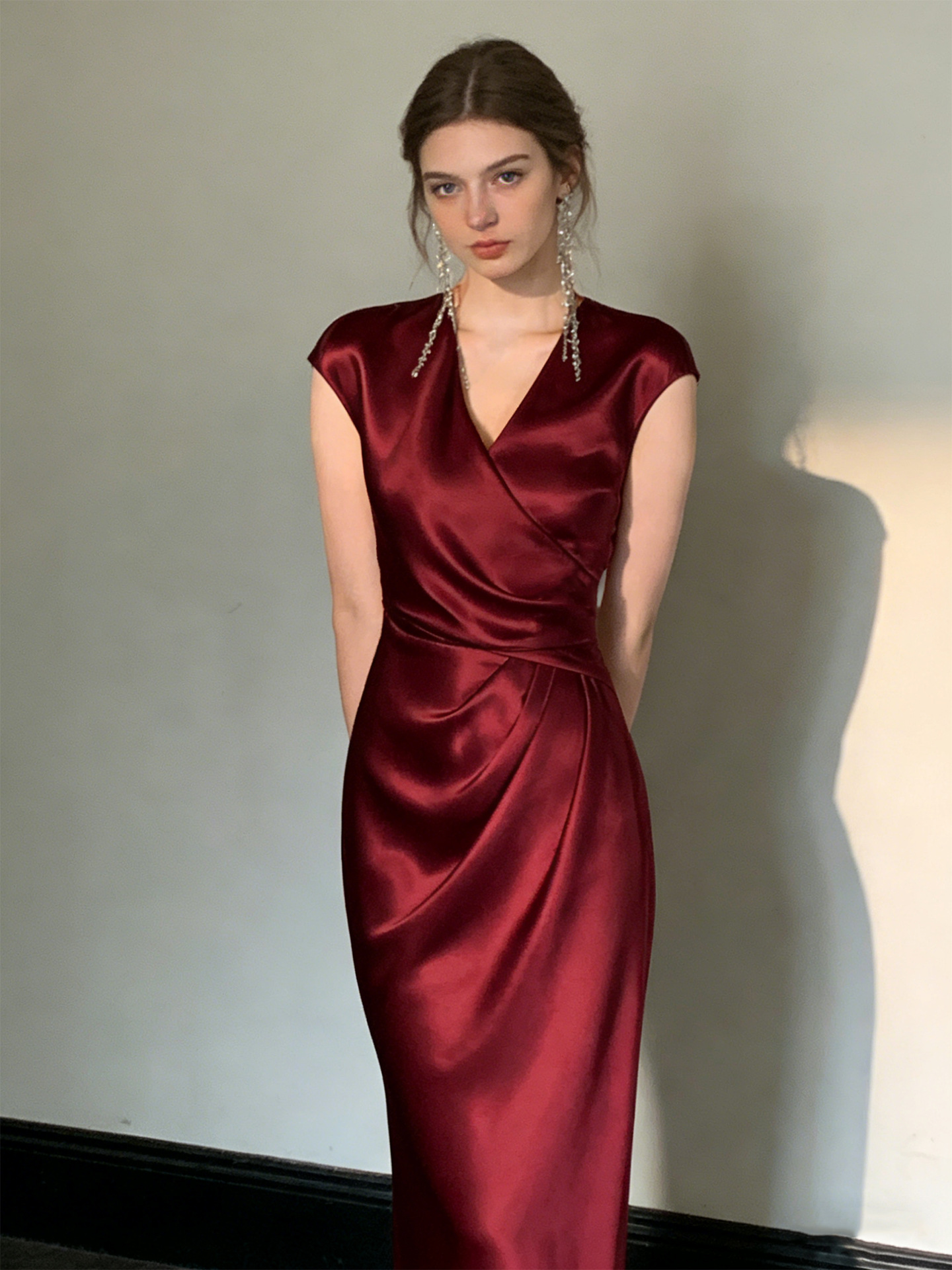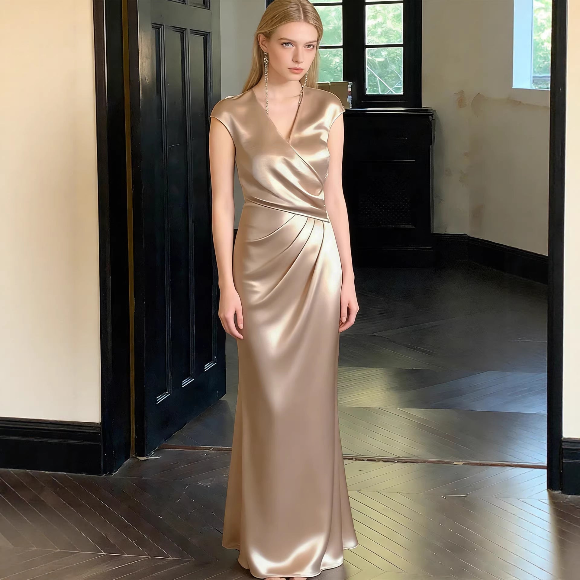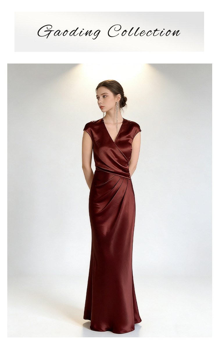 Haute couture French high-end feeling daughter feeling expensive feeling temperament satin overlapping V-neck summer waist thin fishtail dress