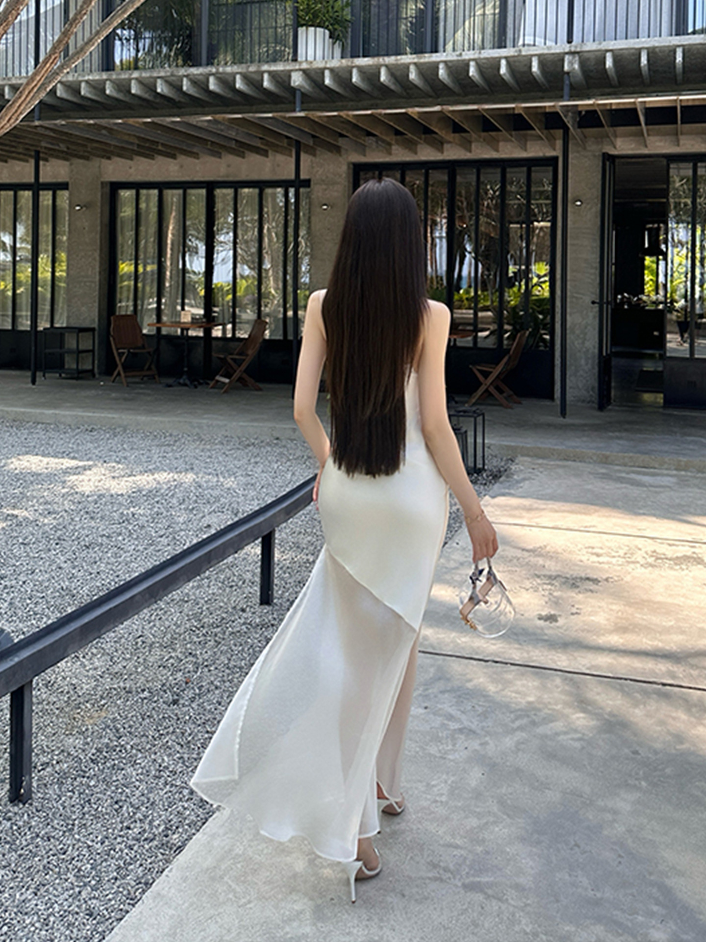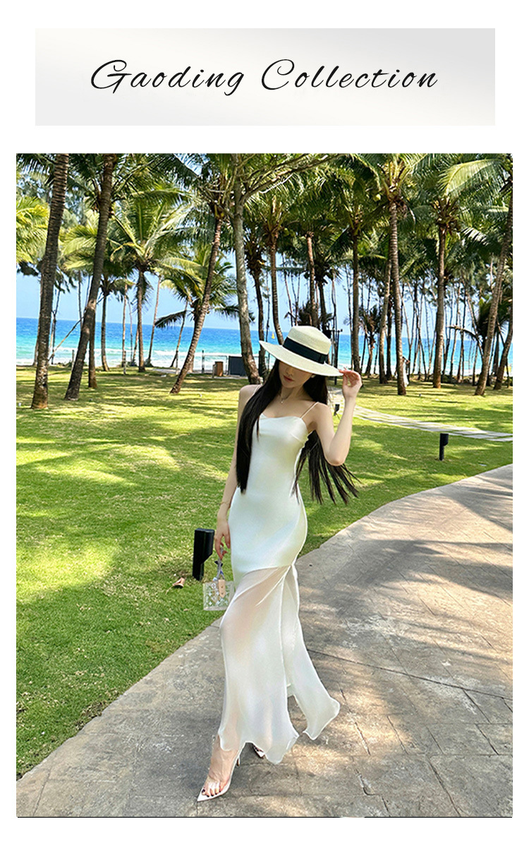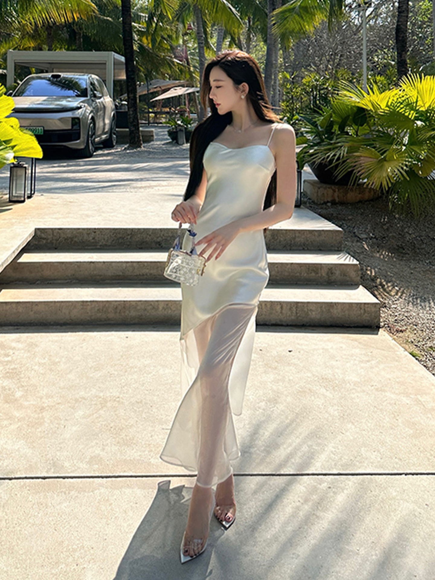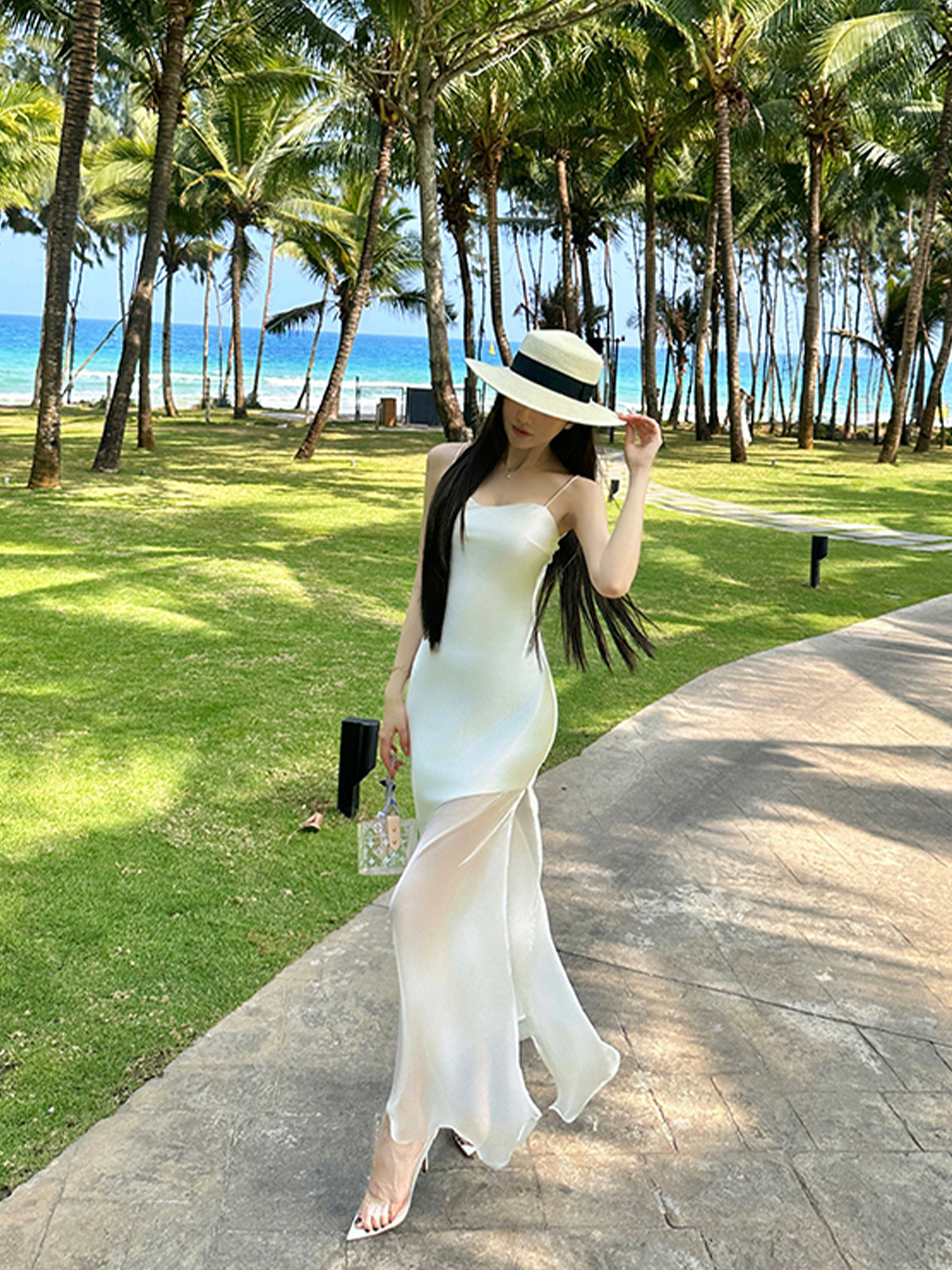 Haute couture imported acetic acid advanced sense splicing tulle suspender long skirt slim temperament Muse seaside vacation fishtail skirt