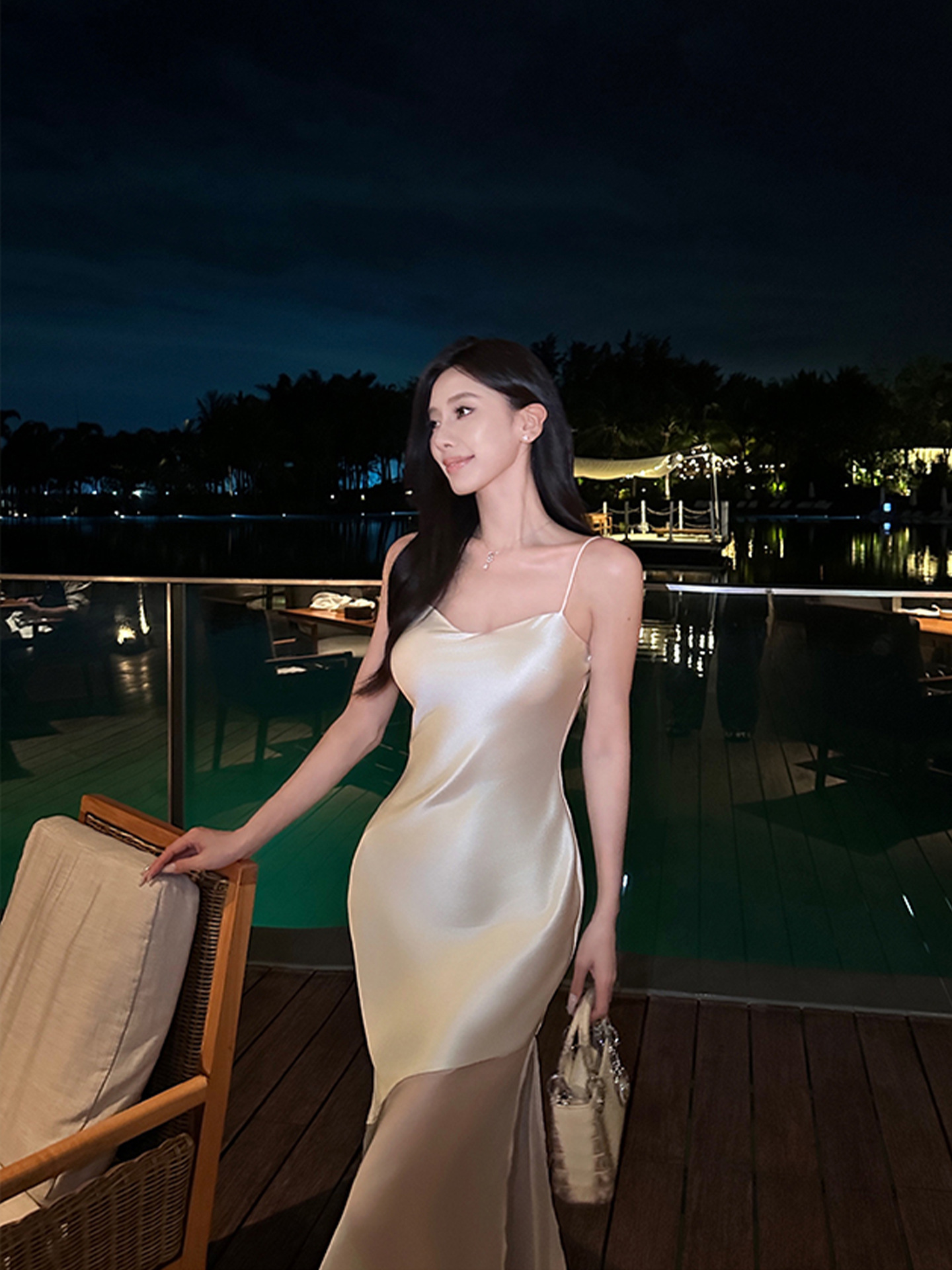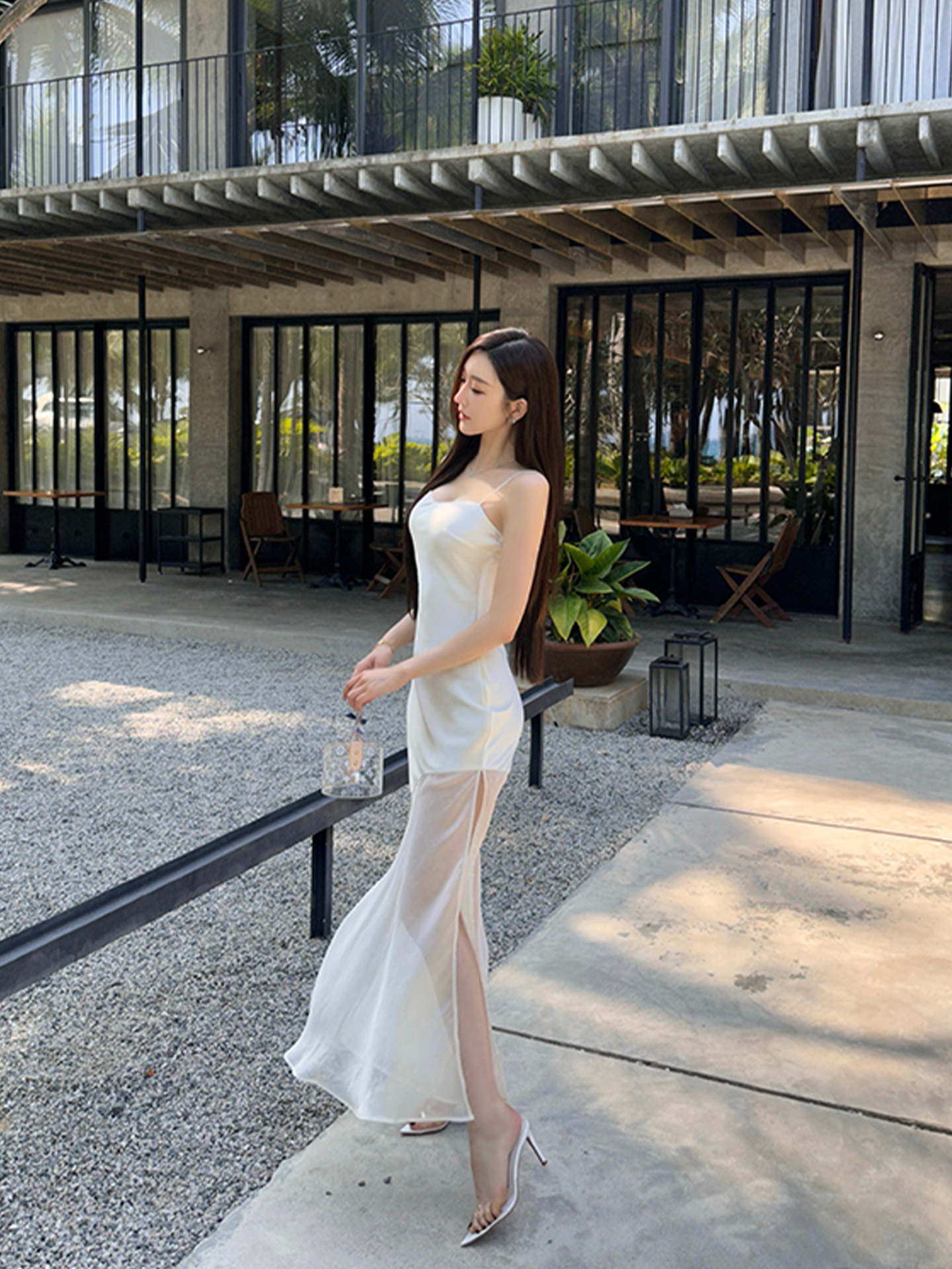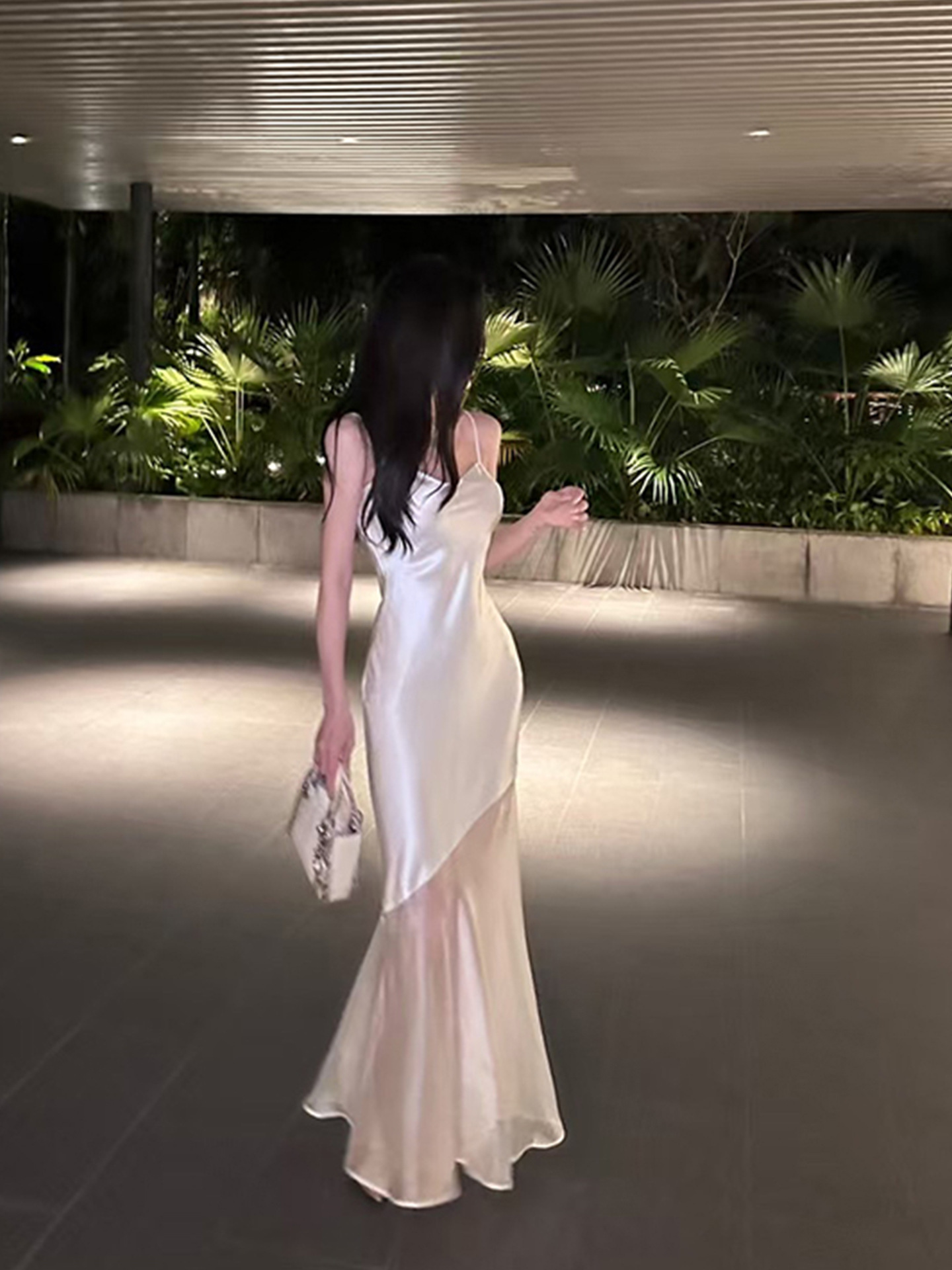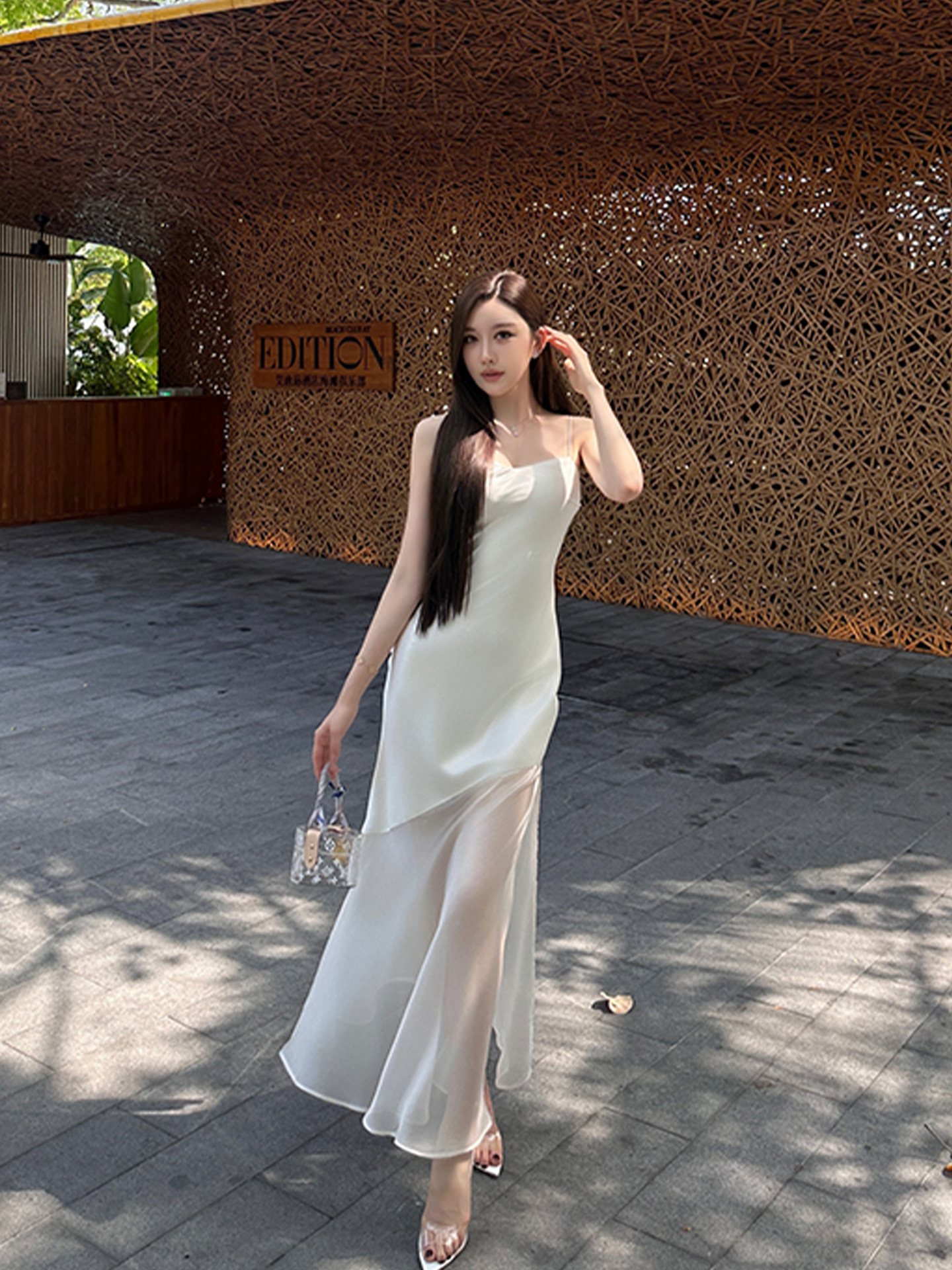 Haute couture imported acetic acid advanced sense splicing tulle suspender long skirt slim temperament Muse seaside vacation fishtail skirt