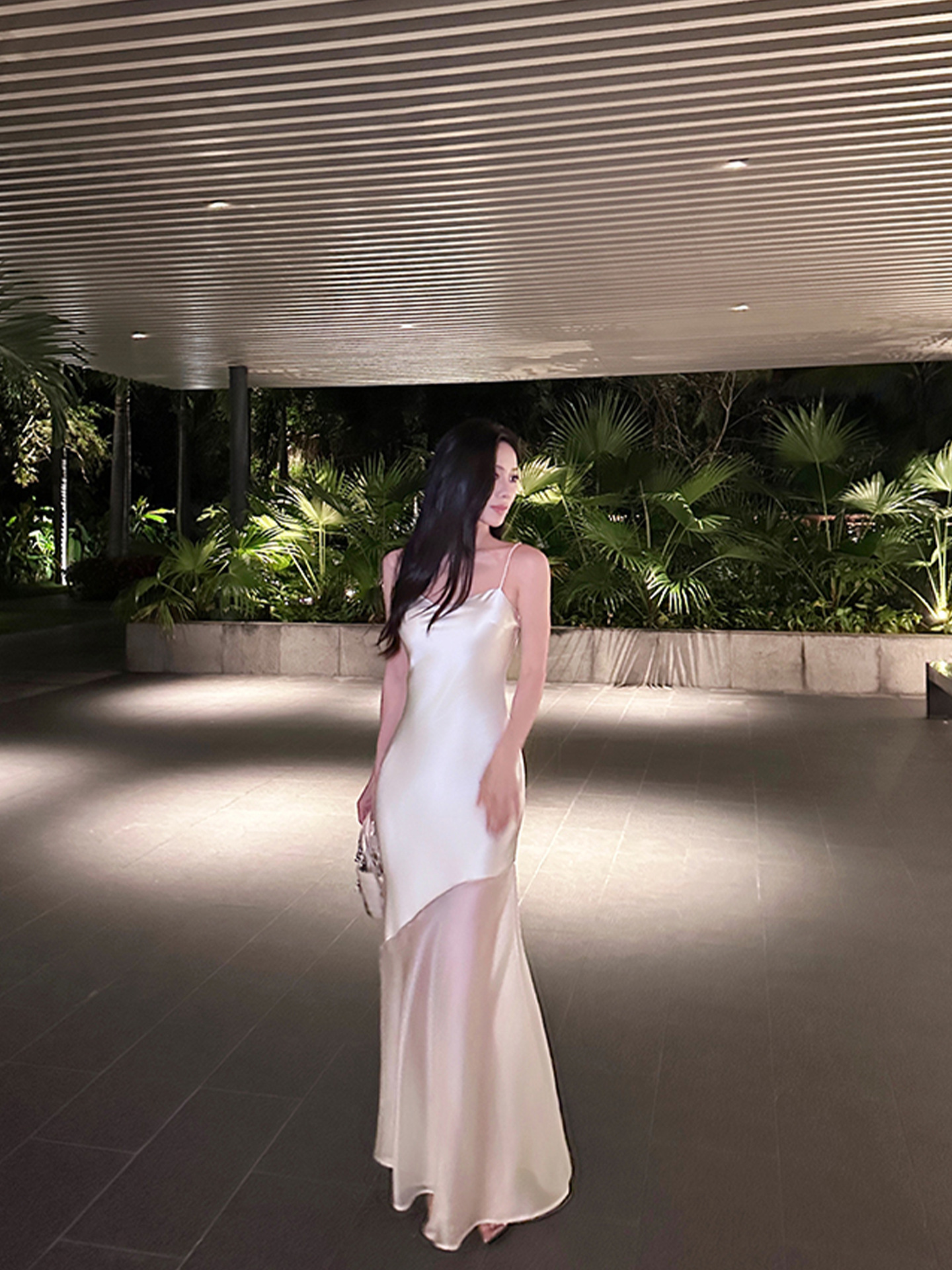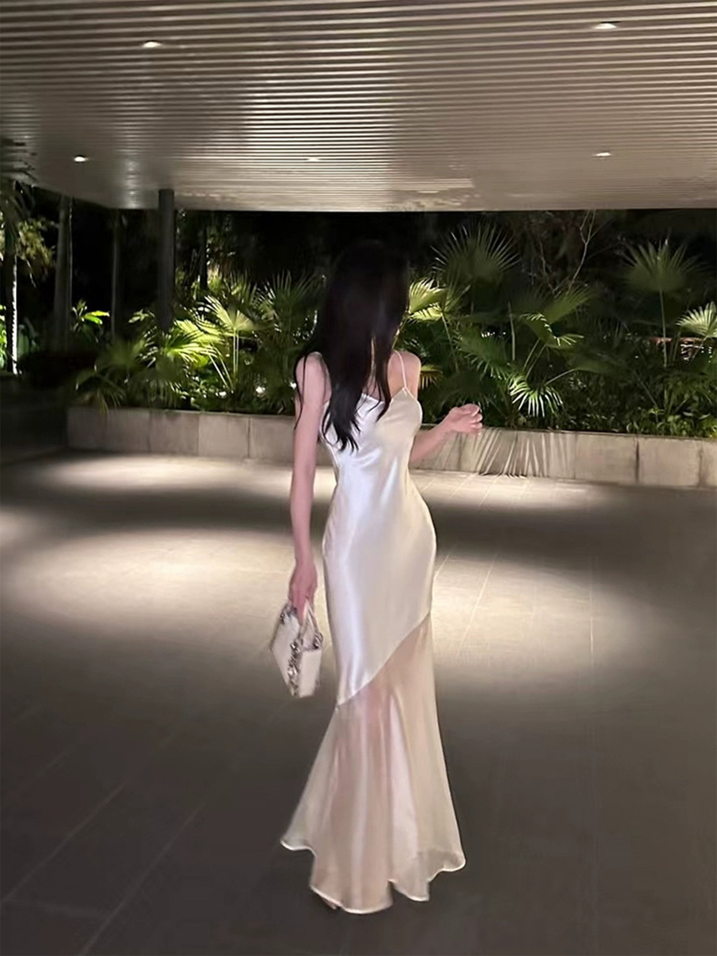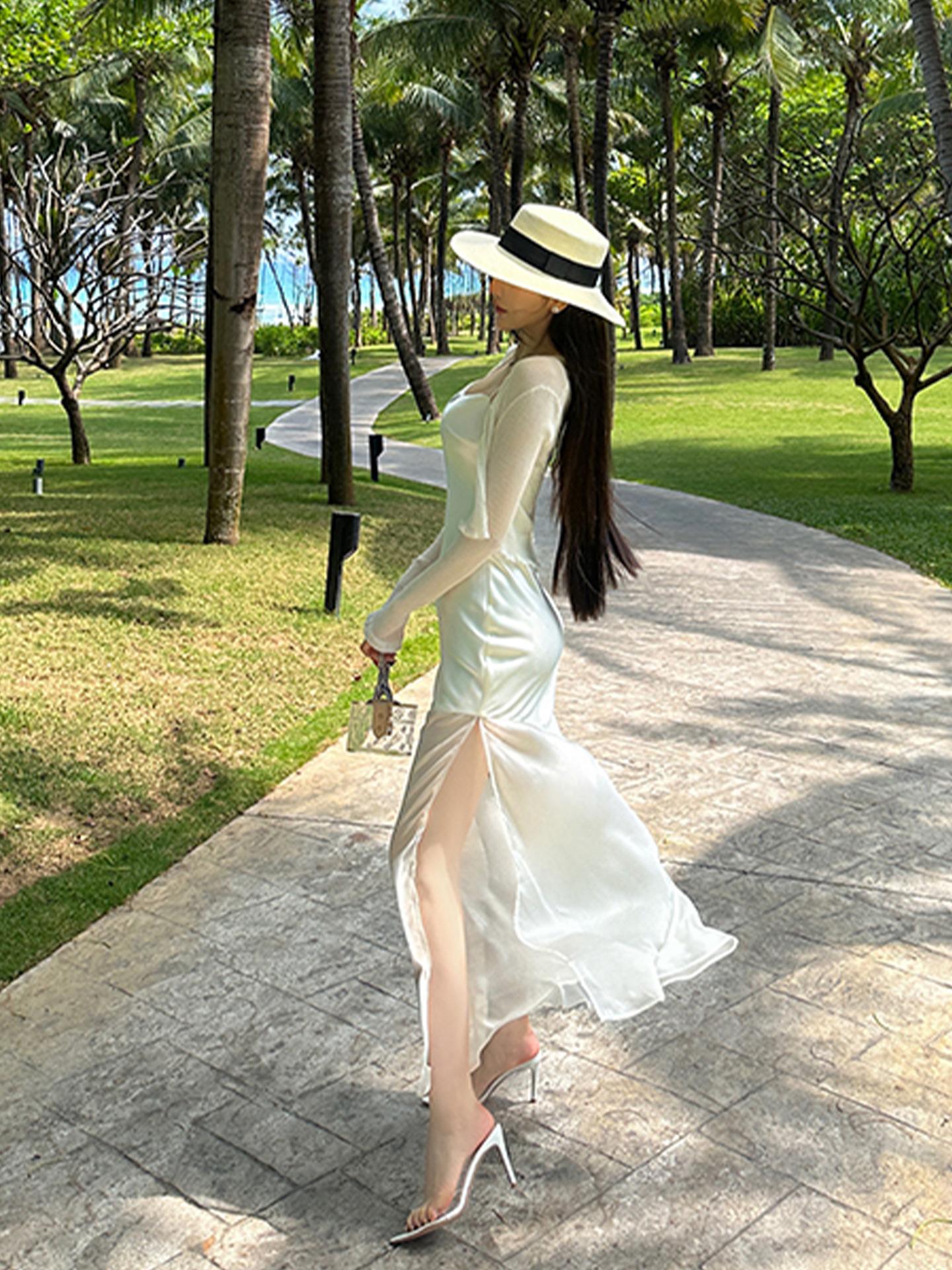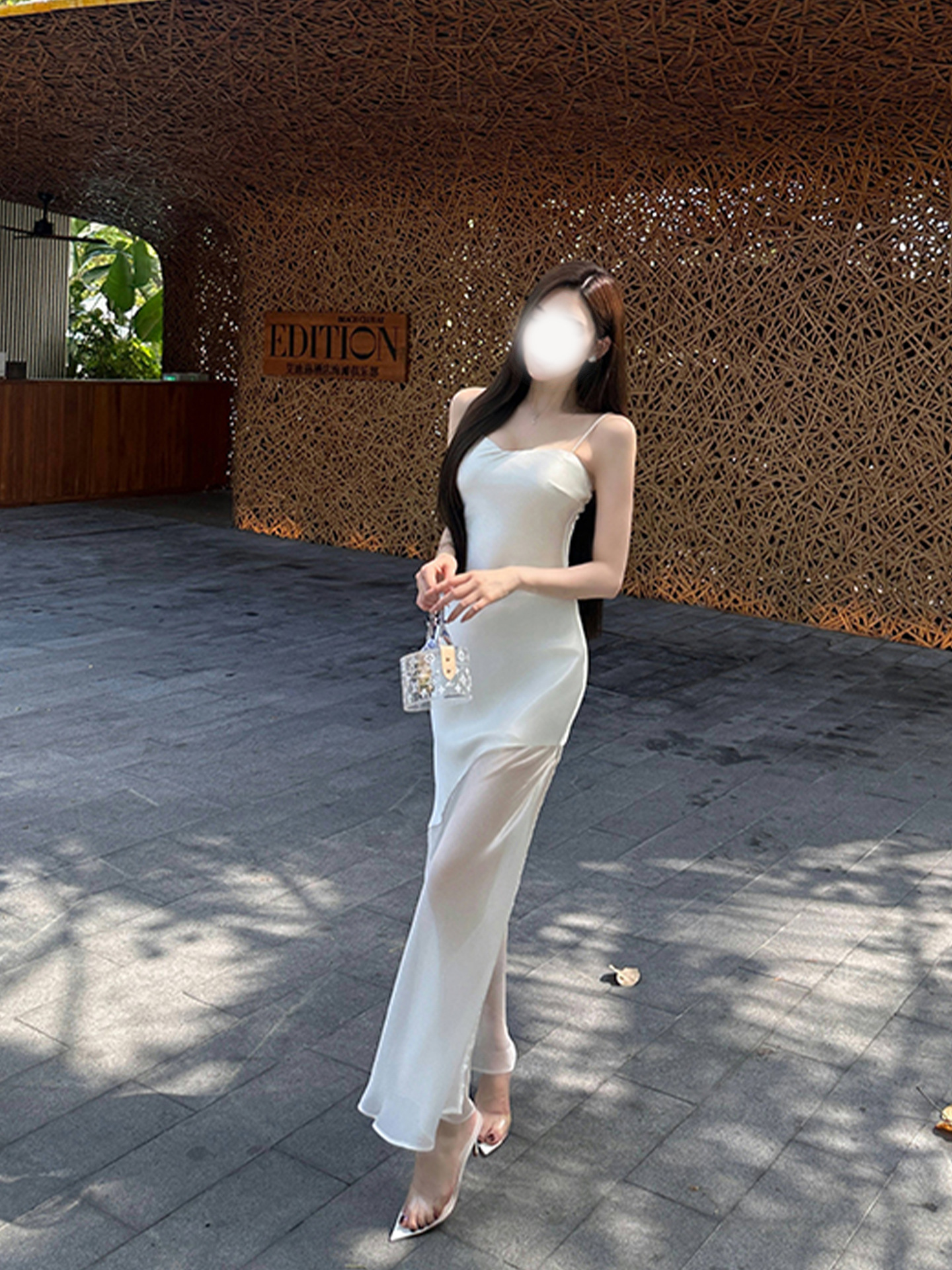 Haute couture imported acetic acid advanced sense splicing tulle suspender long skirt slim temperament Muse seaside vacation fishtail skirt