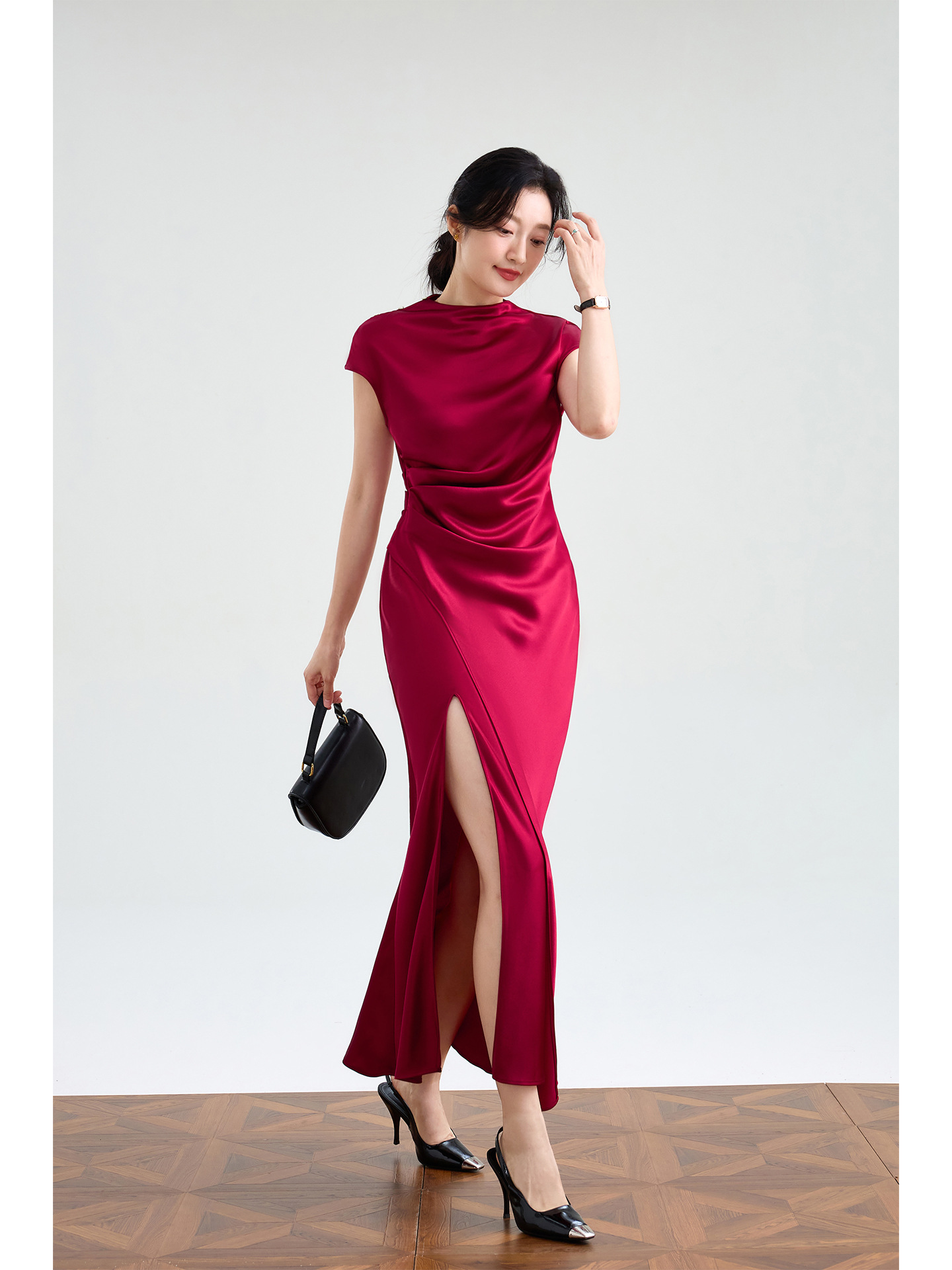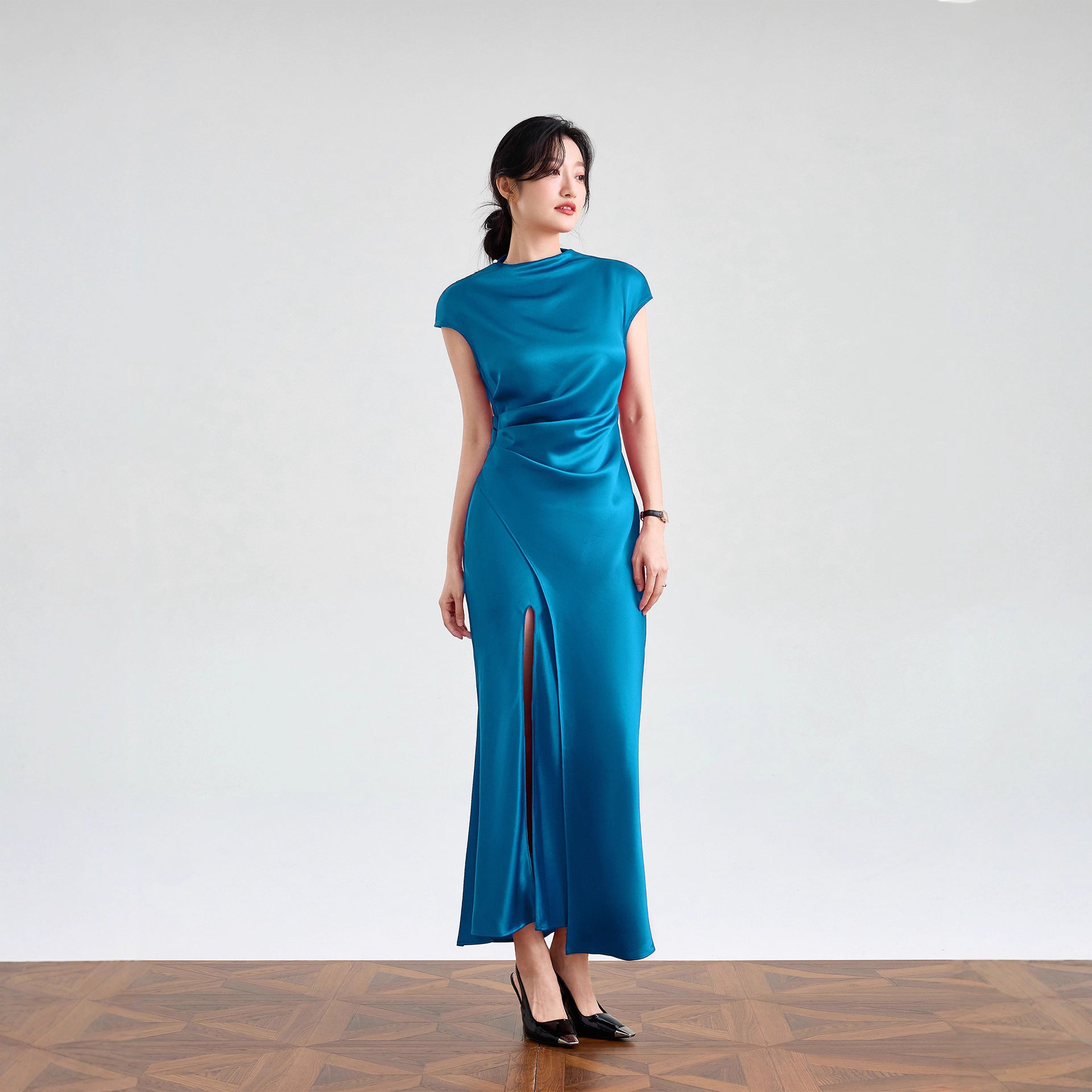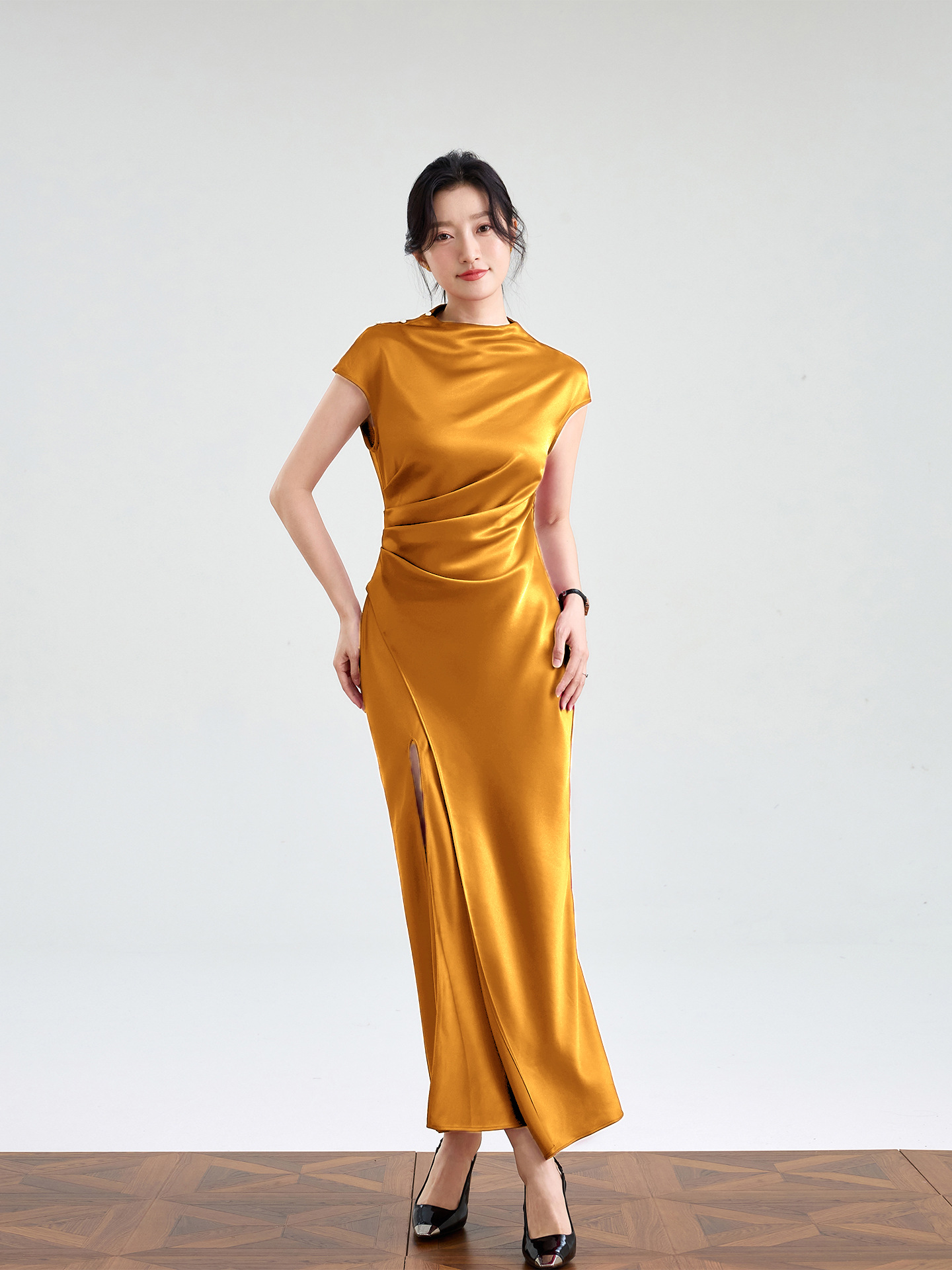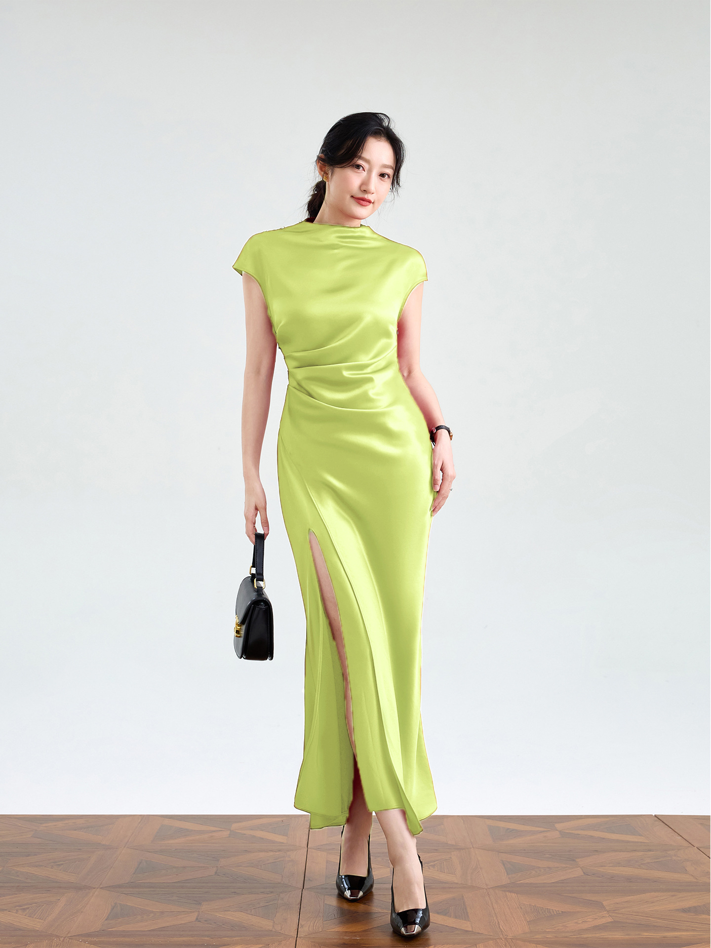Haute couture imported acetic acid, pure desire style semi-turtleneck satin dress temperament thin split fork fish tail long dress French