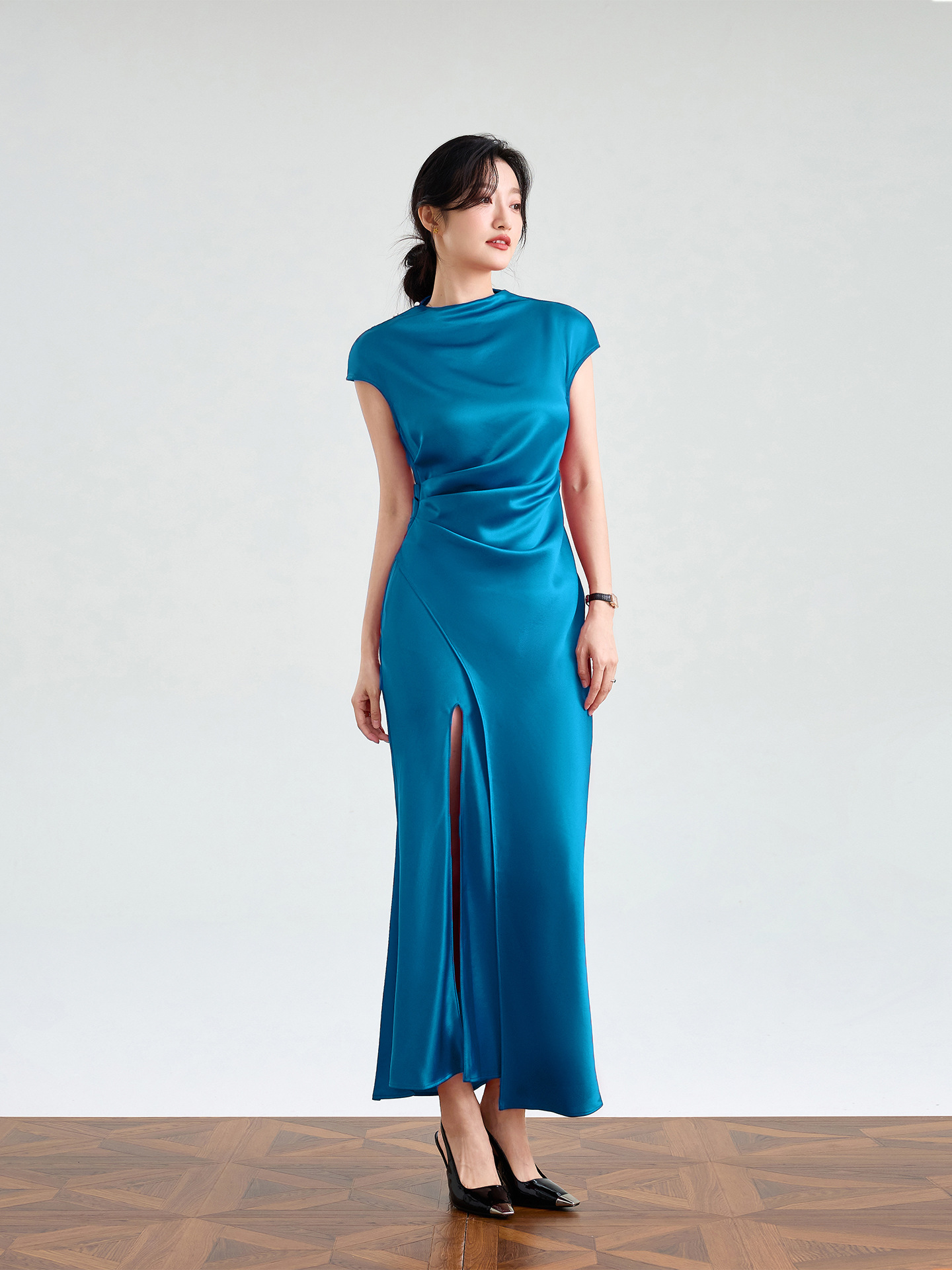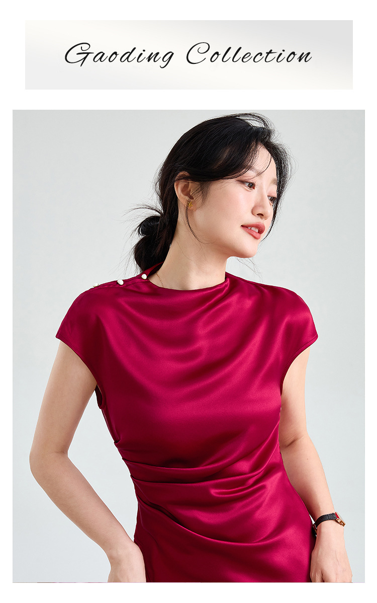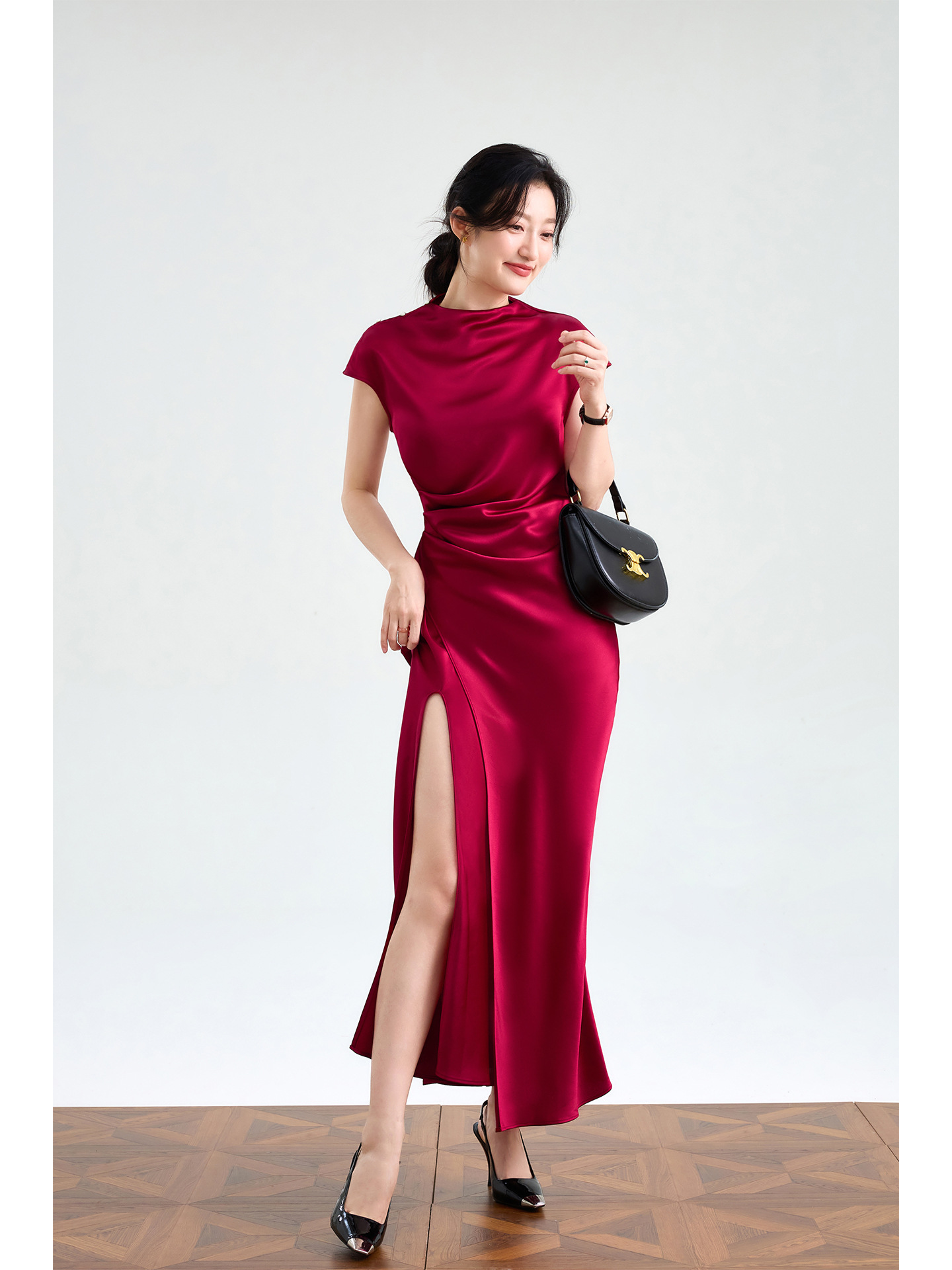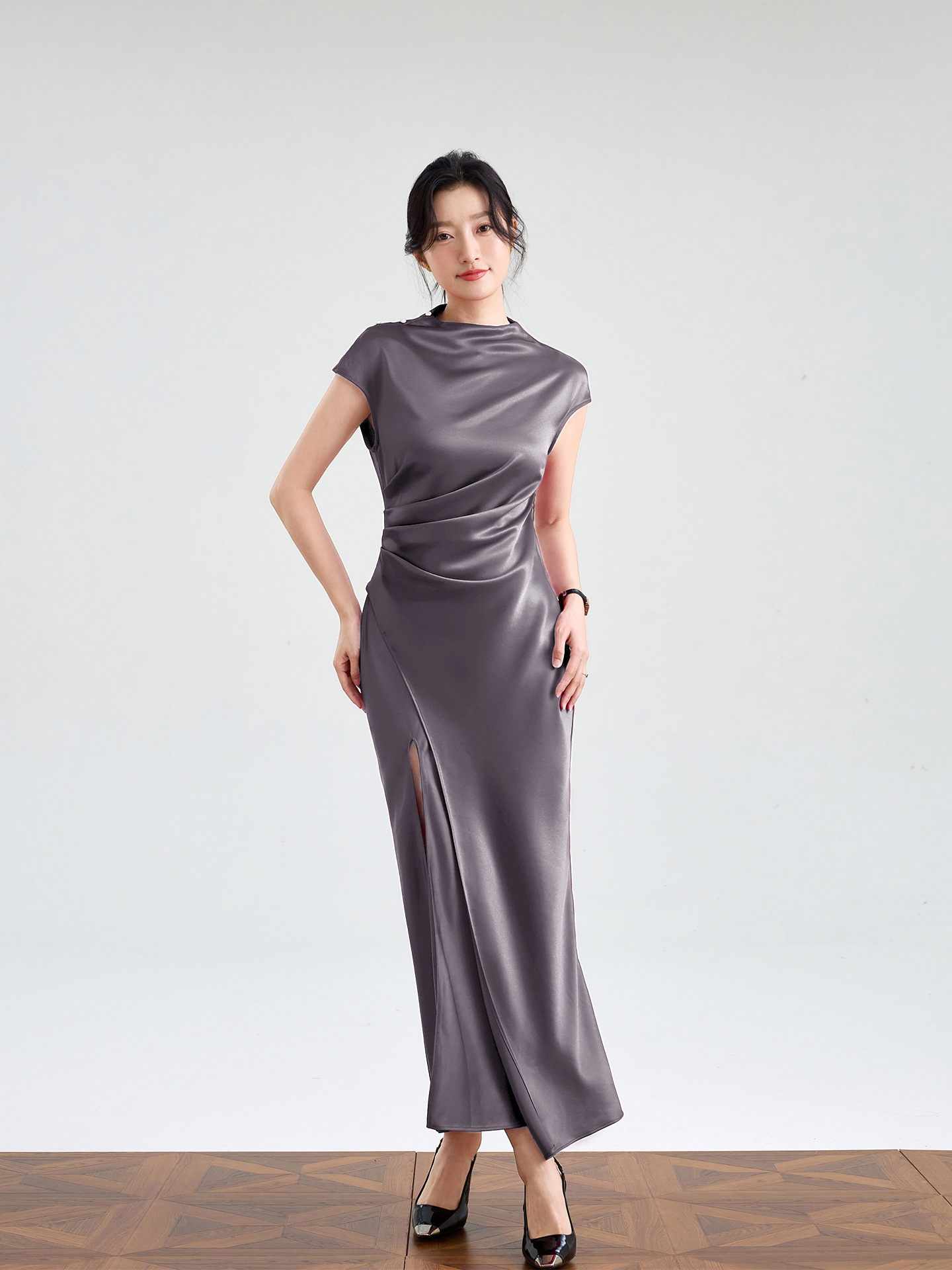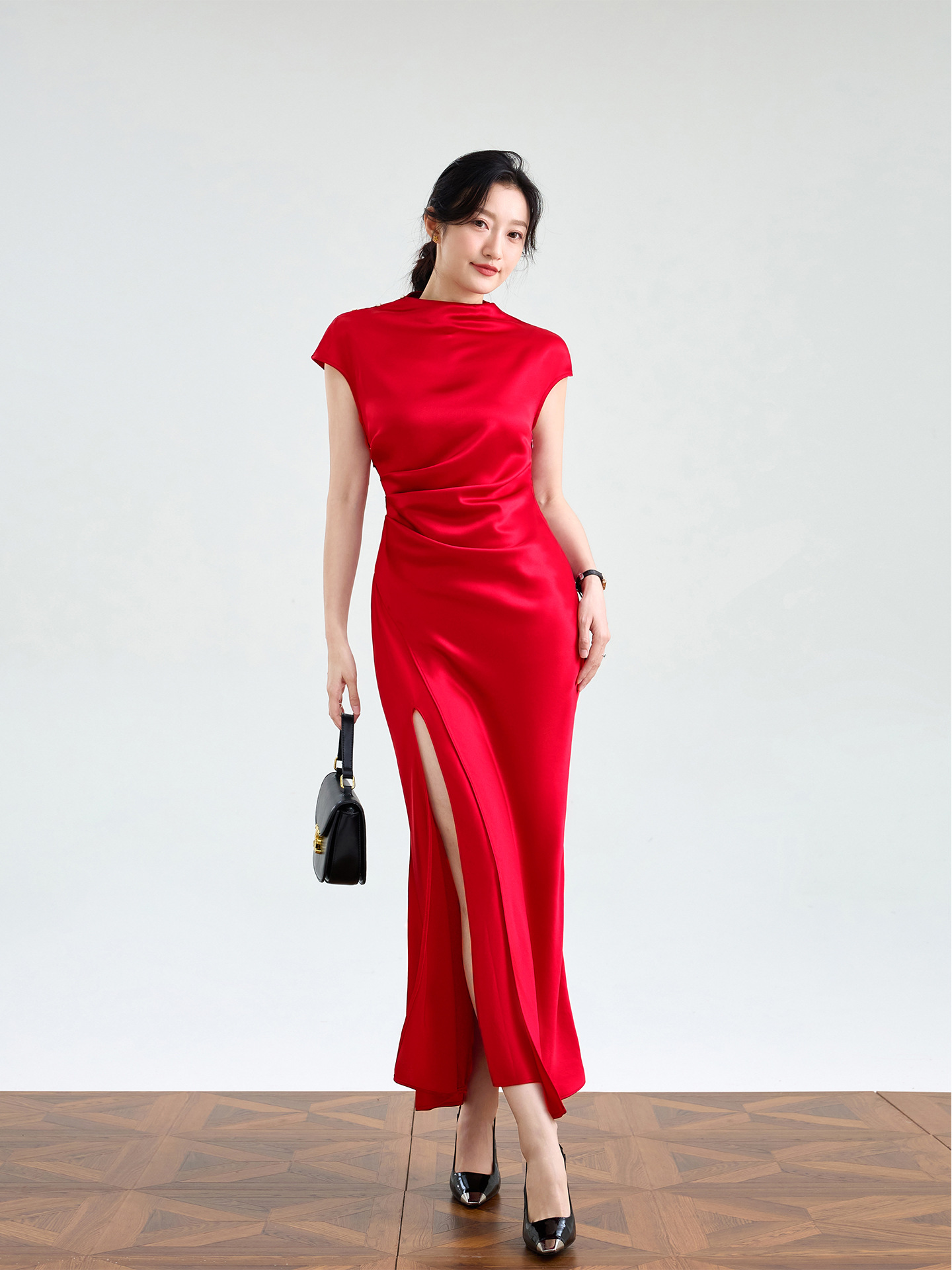 Haute couture imported acetic acid, pure desire style semi-turtleneck satin dress temperament thin split fork fish tail long dress French