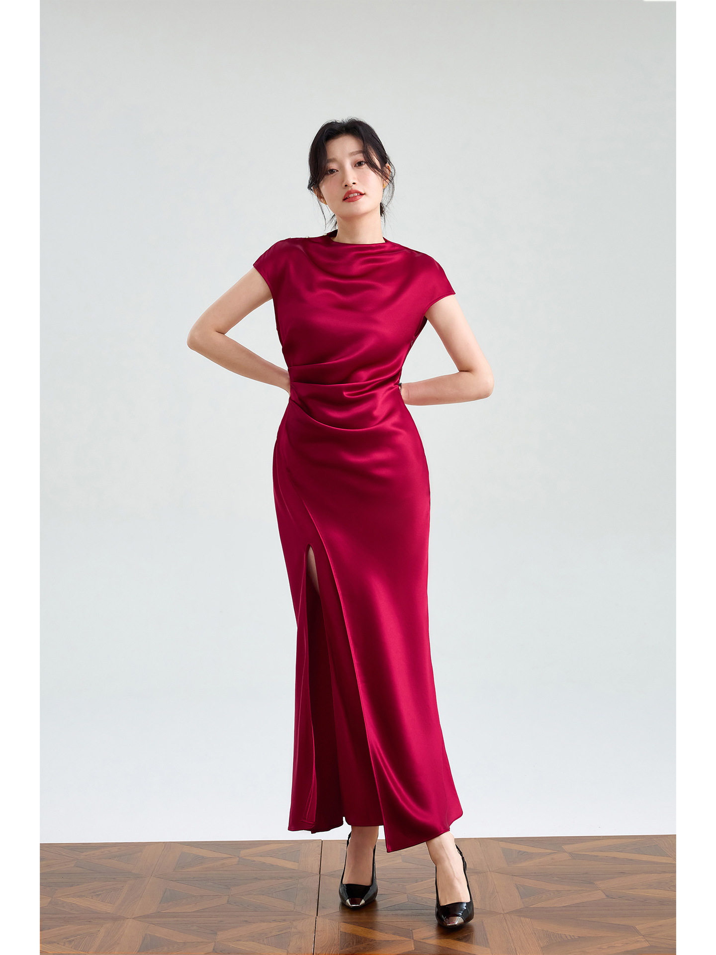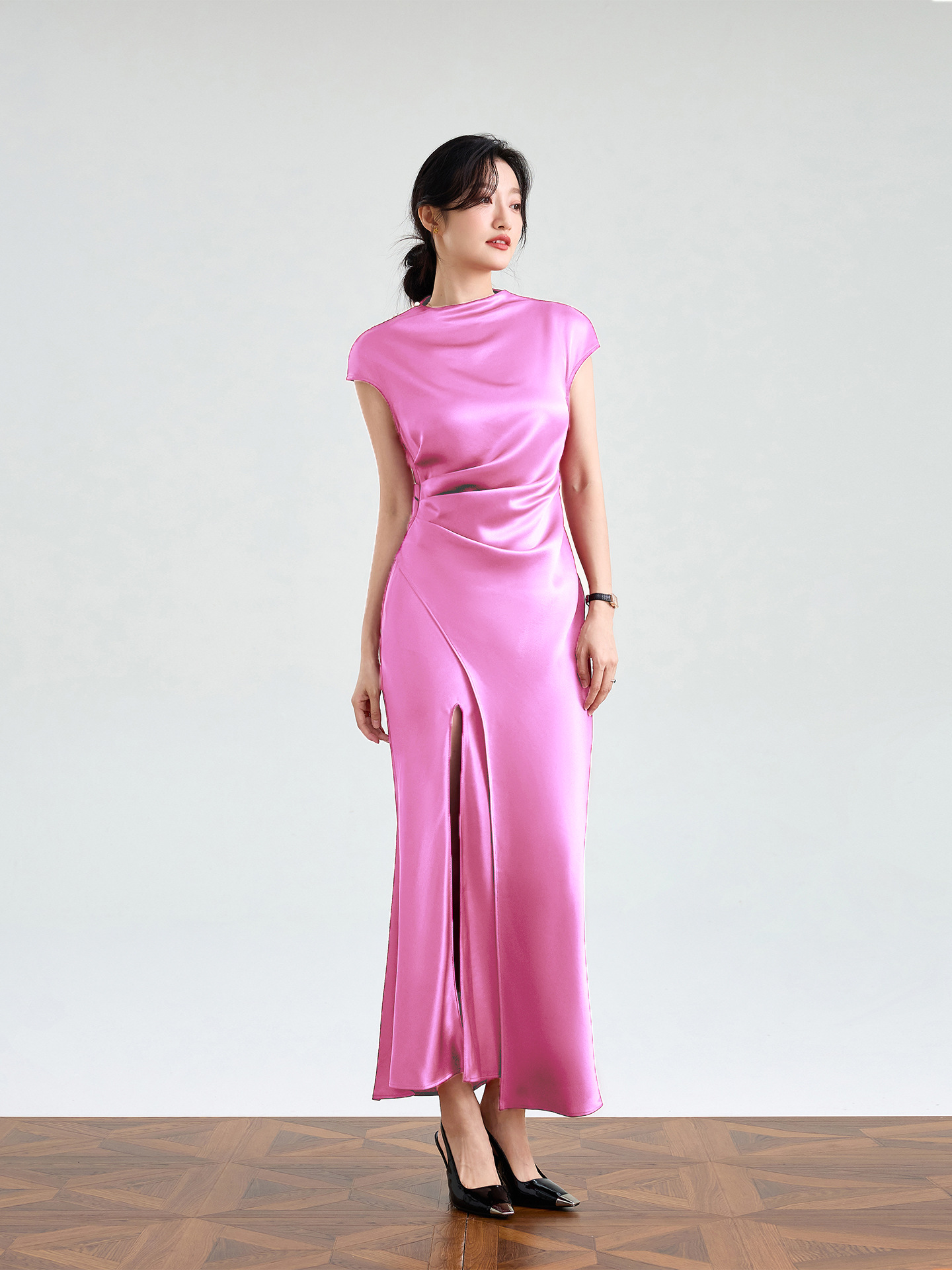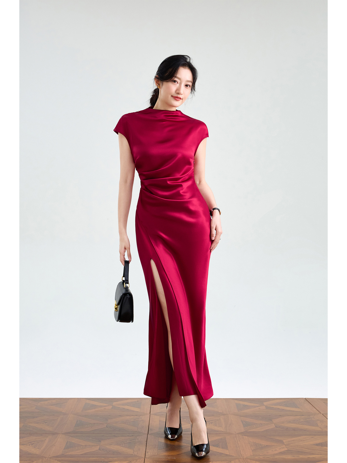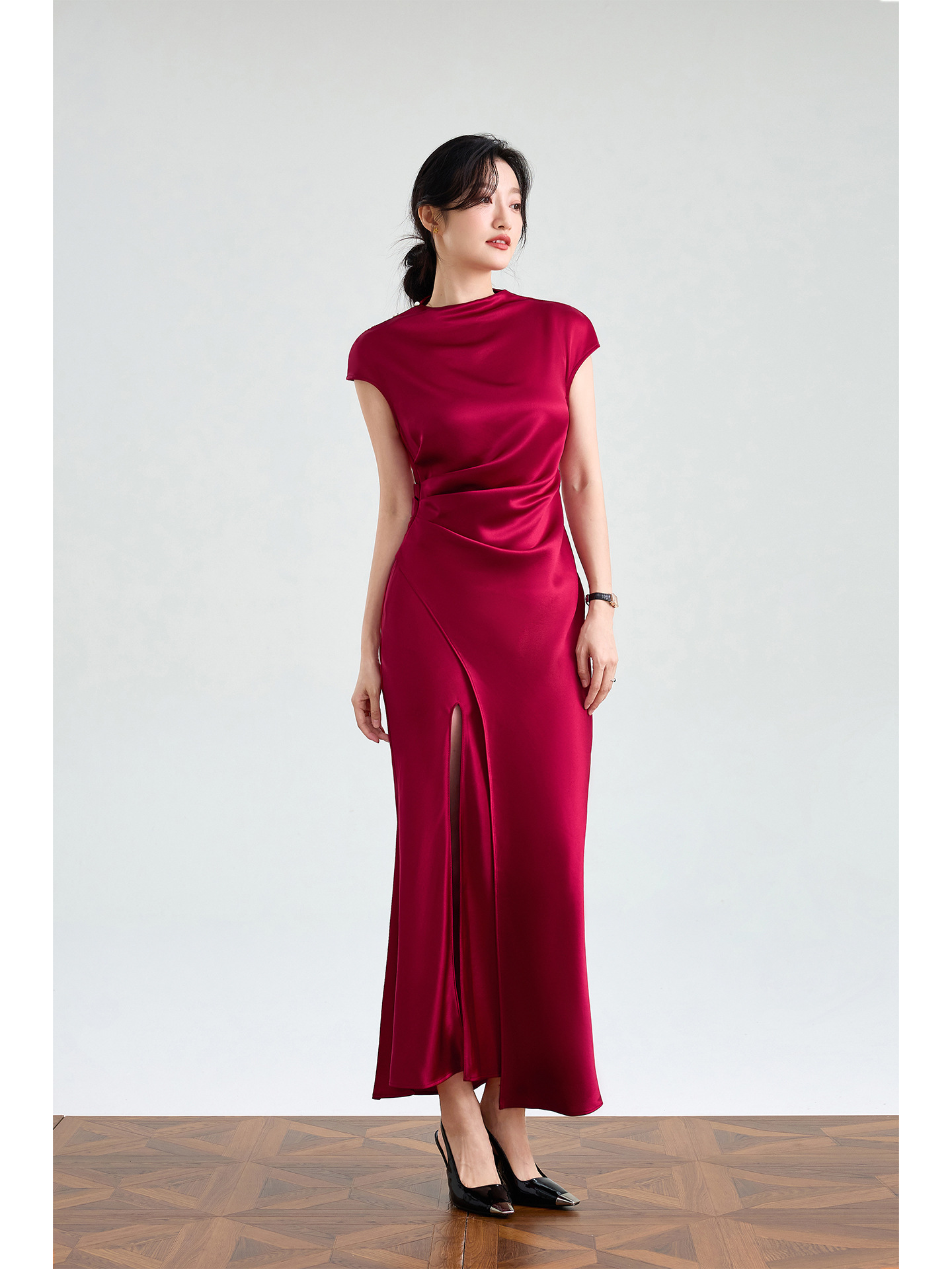 Haute couture imported acetic acid, pure desire style semi-turtleneck satin dress temperament thin split fork fish tail long dress French