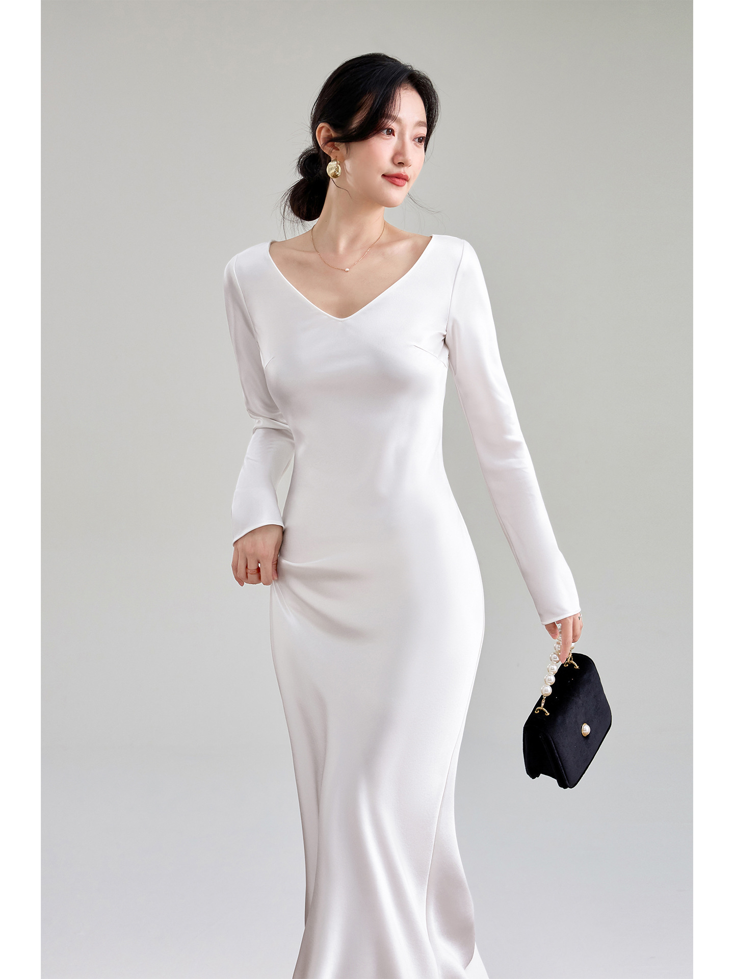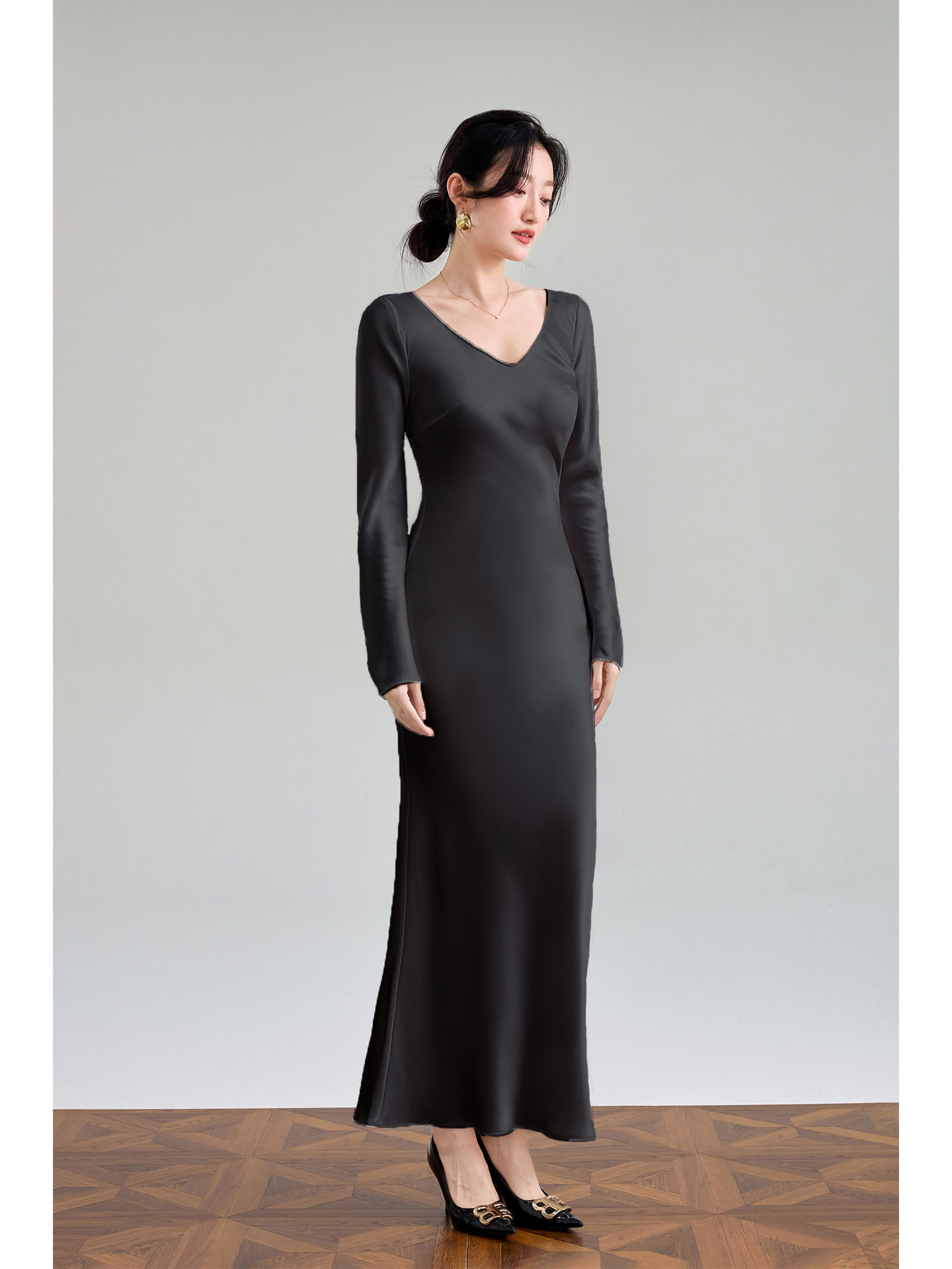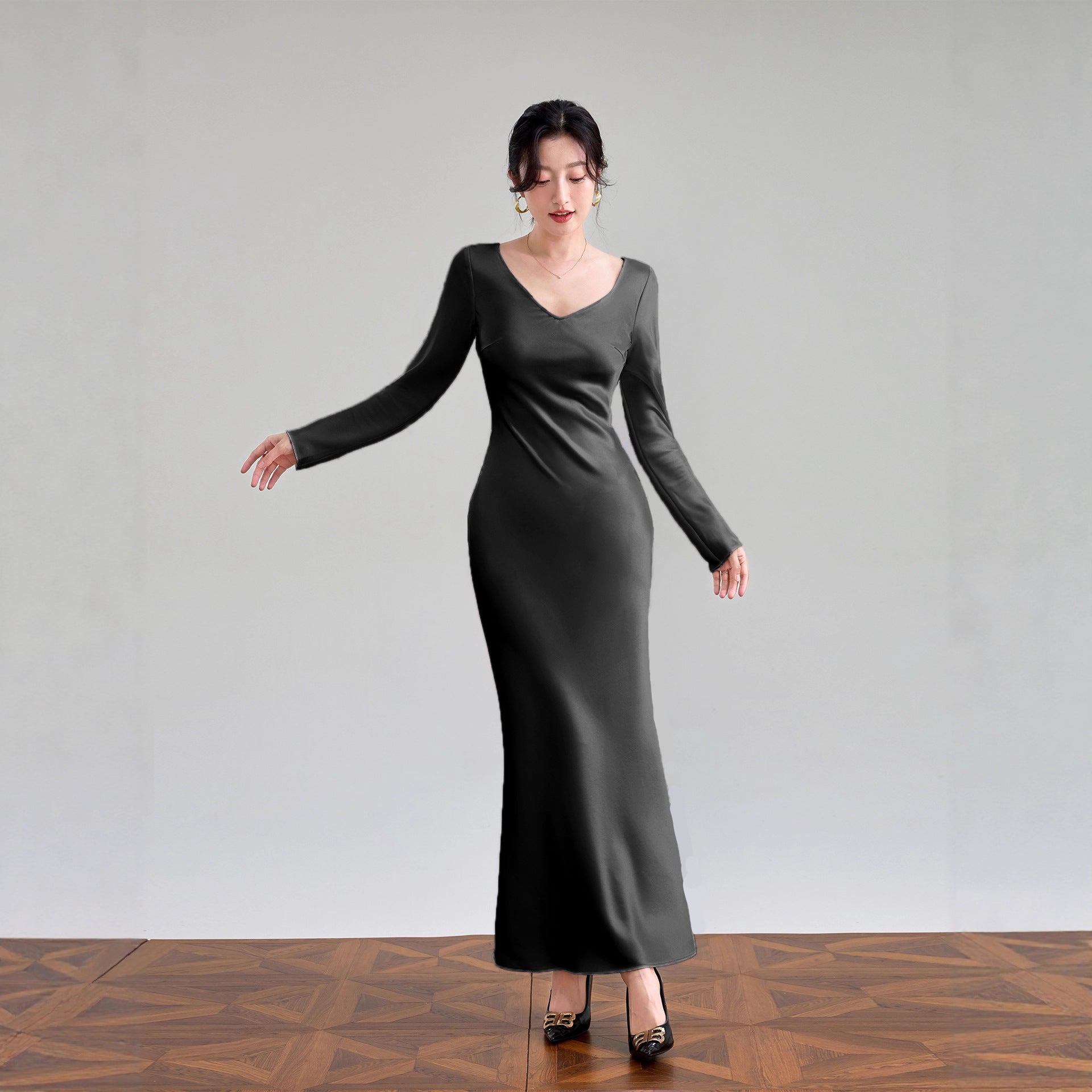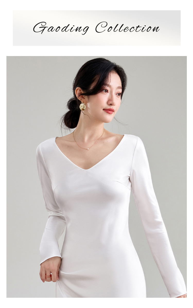 Haute couture imported acetic acid V-neck satin one-piece dress temperament oblique cut long dress fish tail advanced sense French