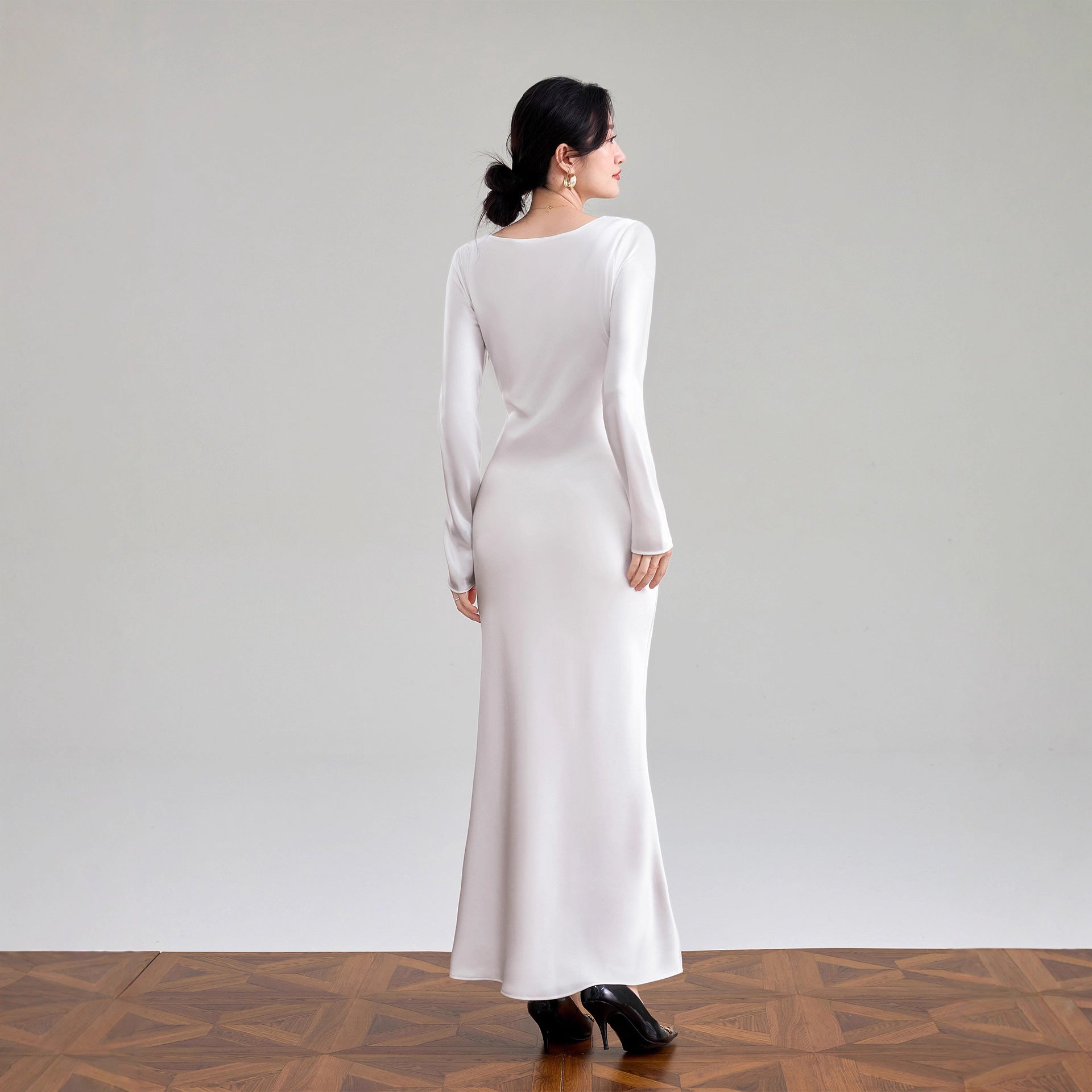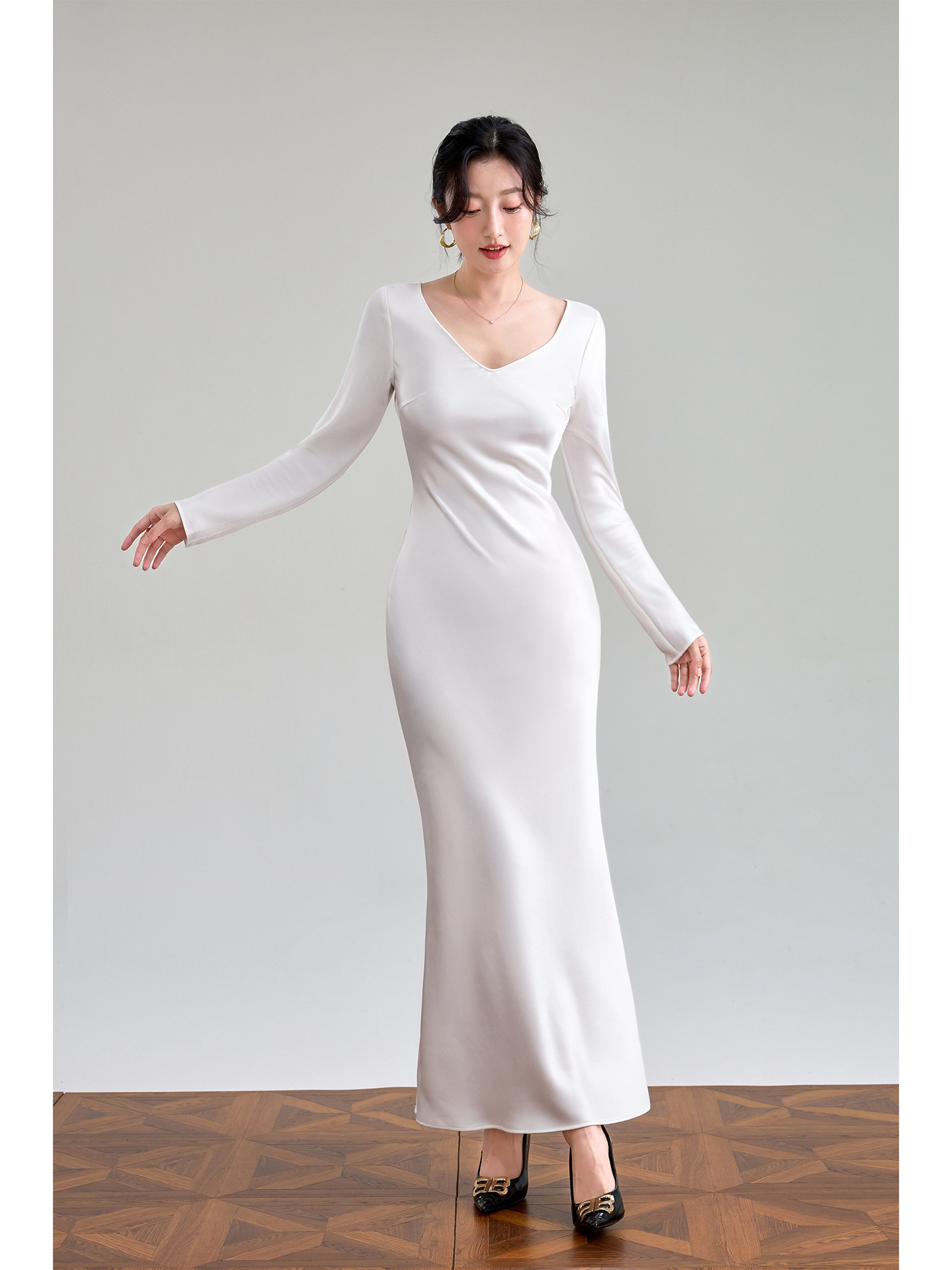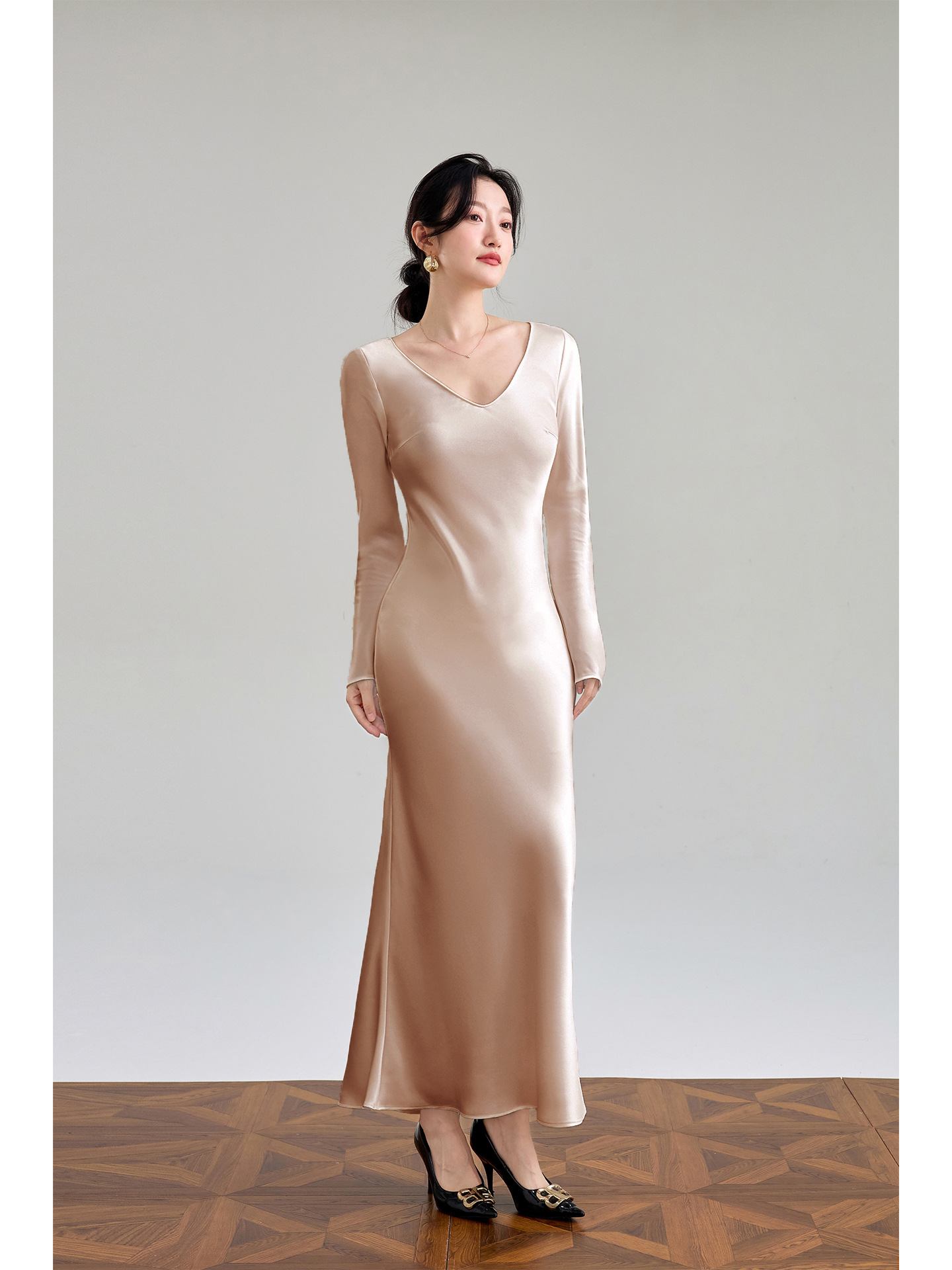 Haute couture imported acetic acid V-neck satin one-piece dress temperament oblique cut long dress fish tail advanced sense French