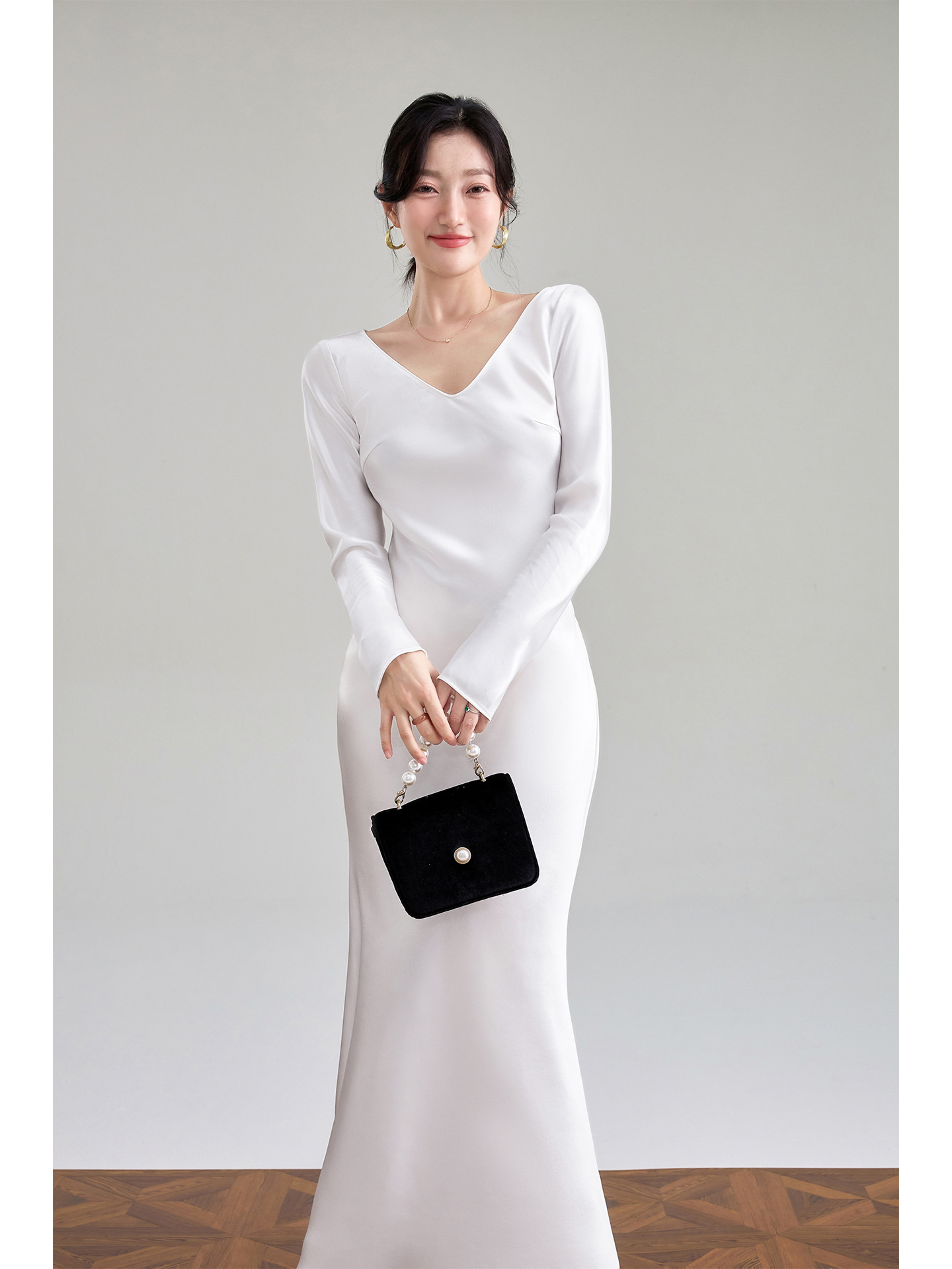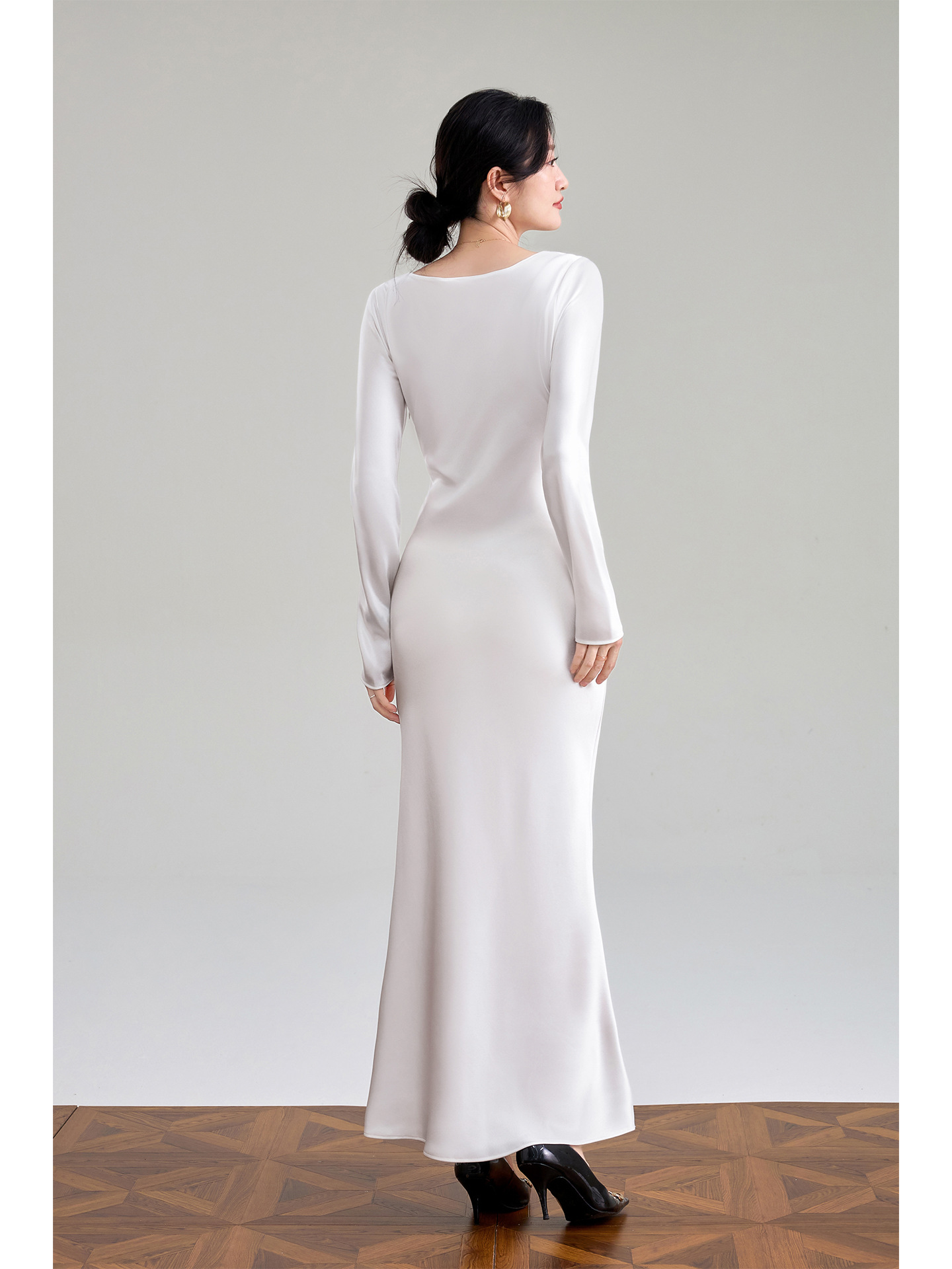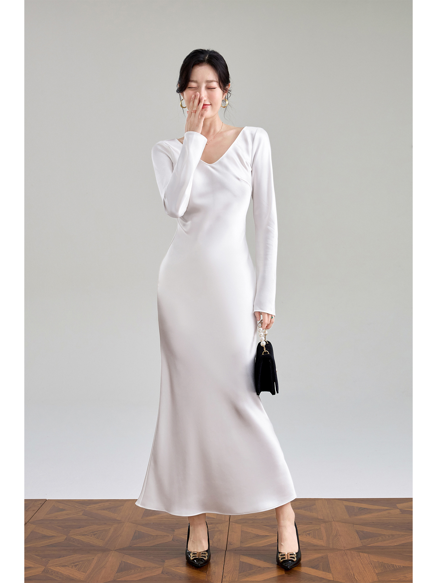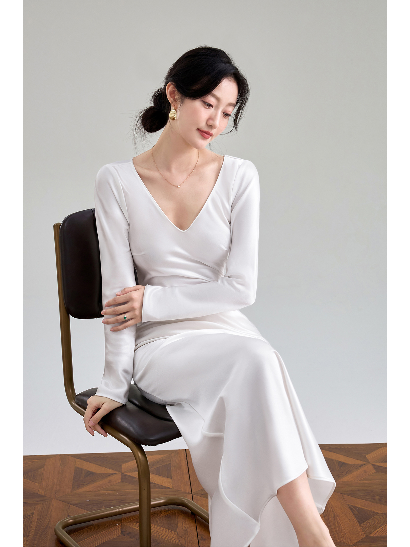 Haute couture imported acetic acid V-neck satin one-piece dress temperament oblique cut long dress fish tail advanced sense French