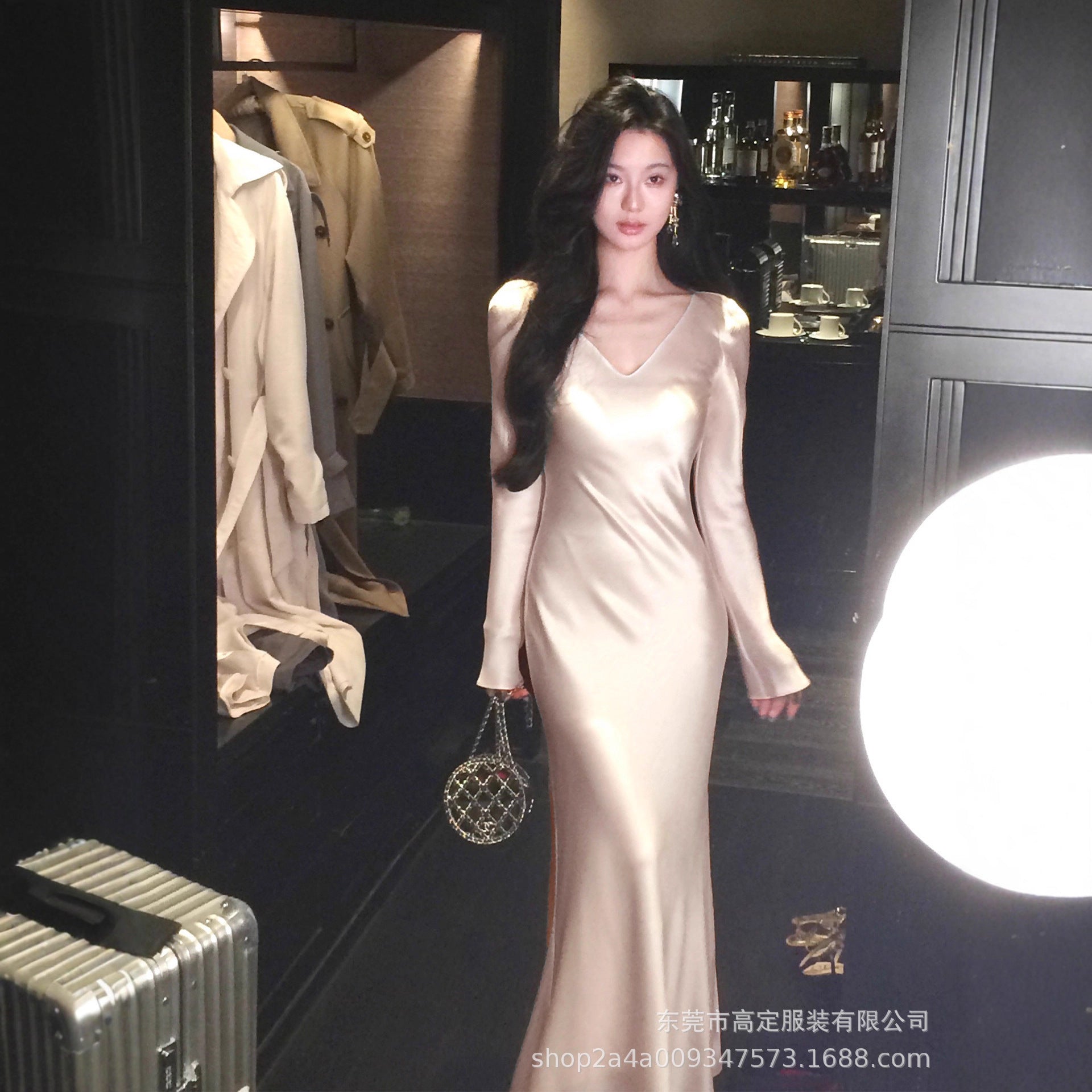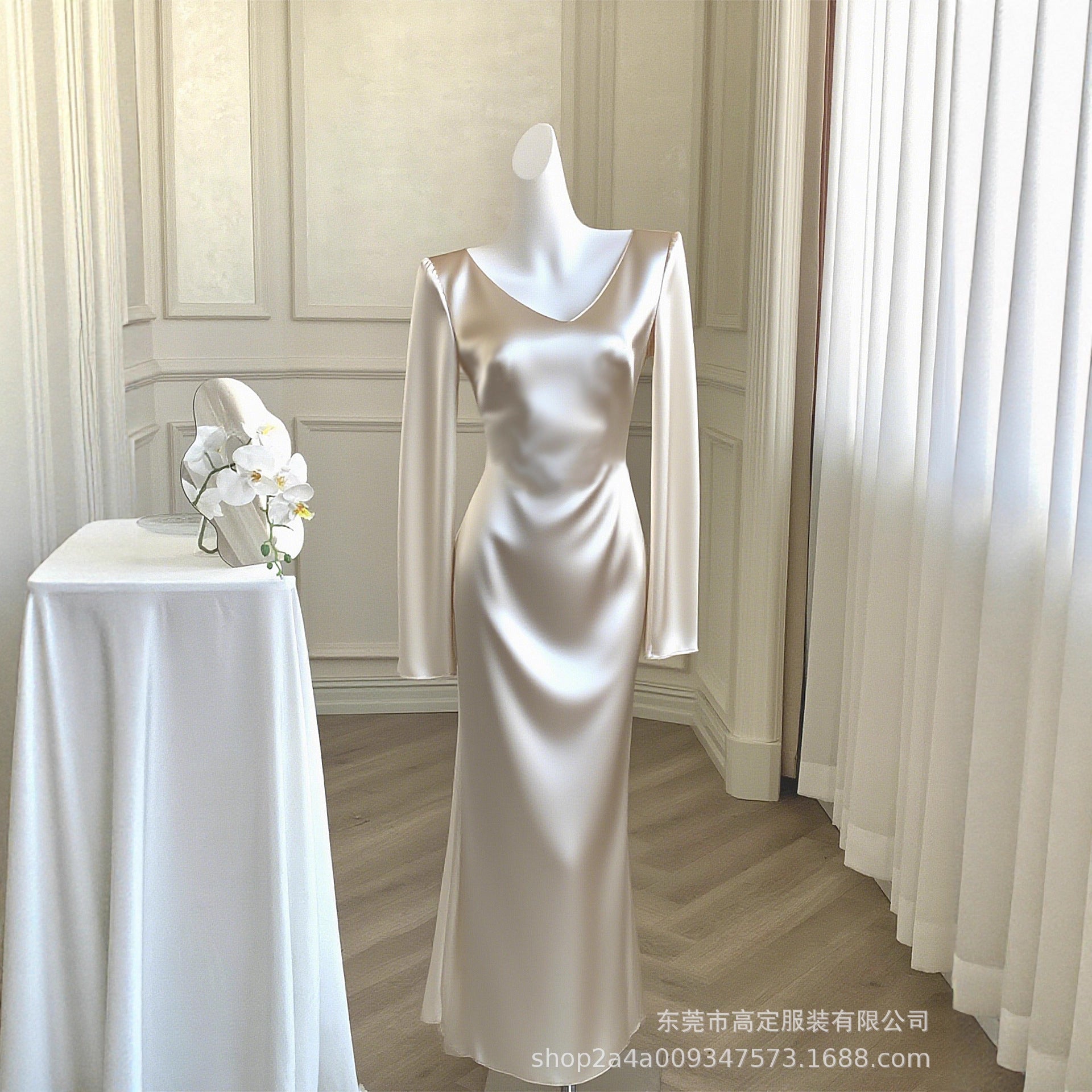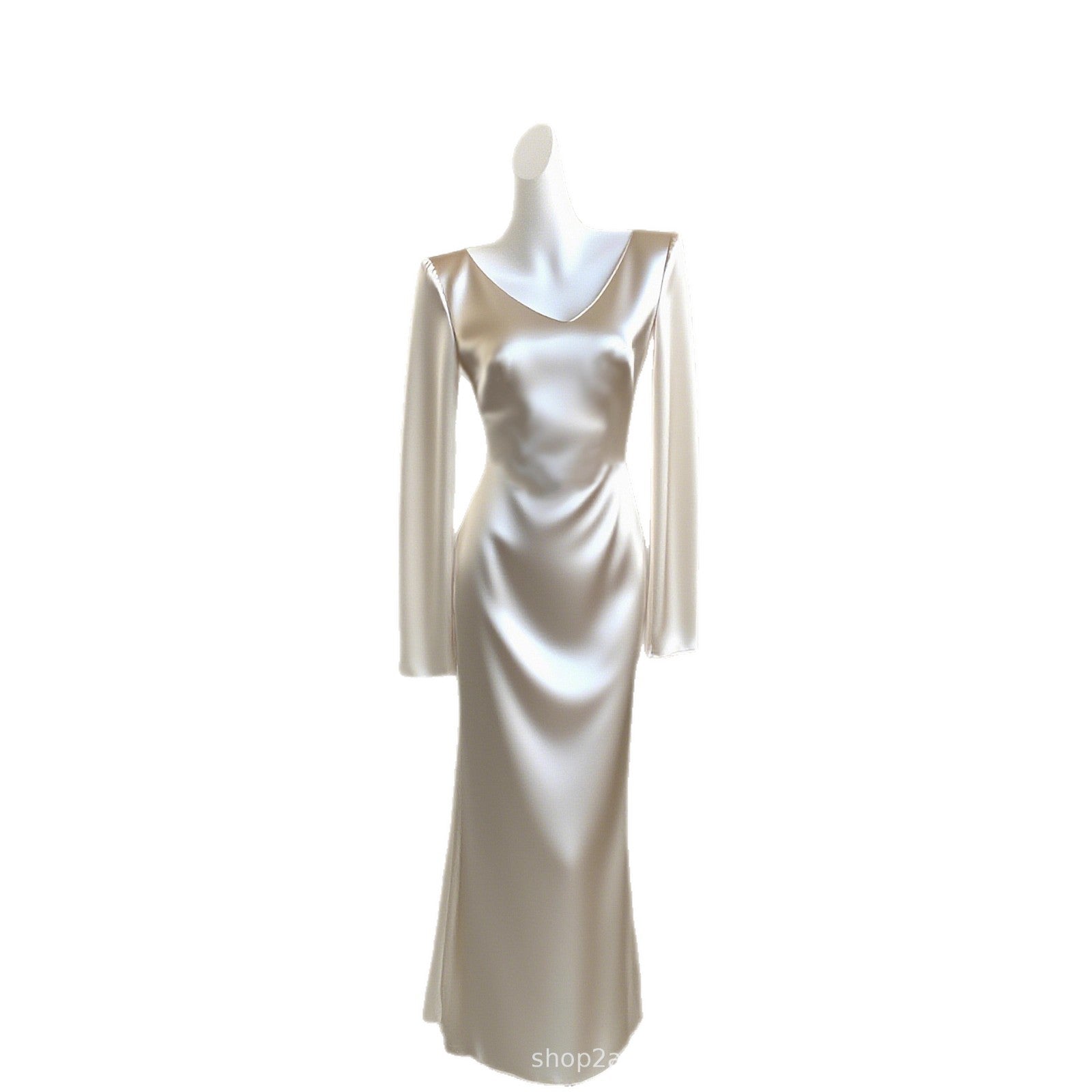 Haute couture imported acetic acid V-neck satin one-piece dress temperament oblique cut long dress fish tail advanced sense French
